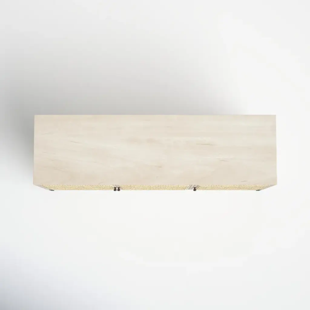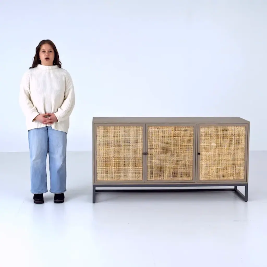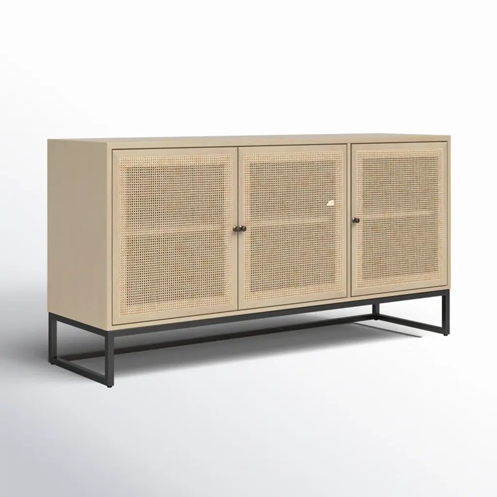 This accent cabinet offers statement storage with an earthy twist. It's crafted from wood in a blonde finish that highlights the wood's grain (knots and all), and it sits on metal, sled-style legs. We love how the cane inlay on the door fronts gives this cabinet a boho vibe, while also concealing shelved space for your spare plates, linens, and more. Style tip: Use this versatile piece as a buffet for serving cocktails and hors d'oeuvres in your dining room or as a home base in your entryway.