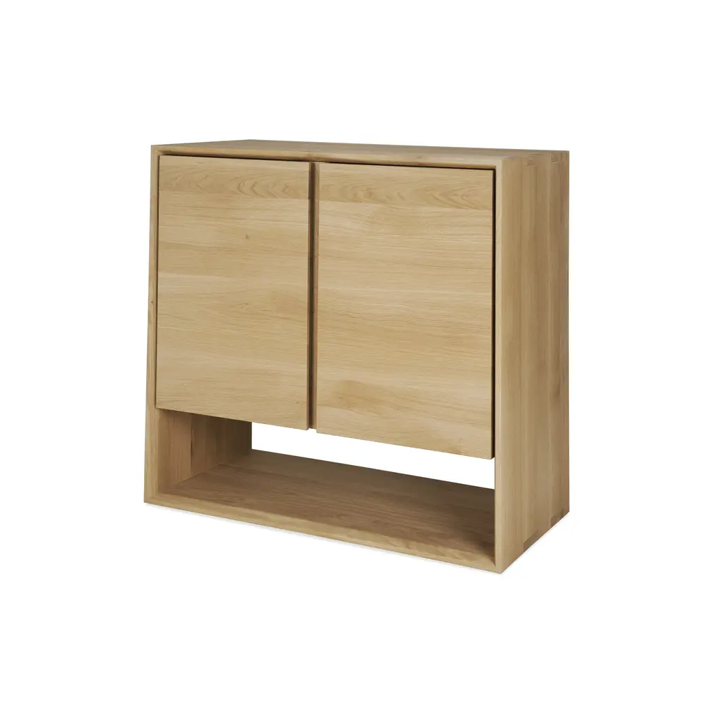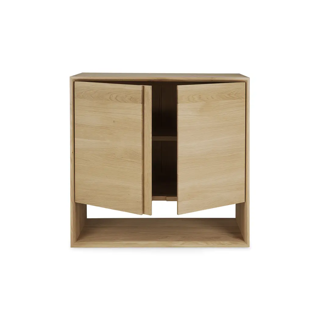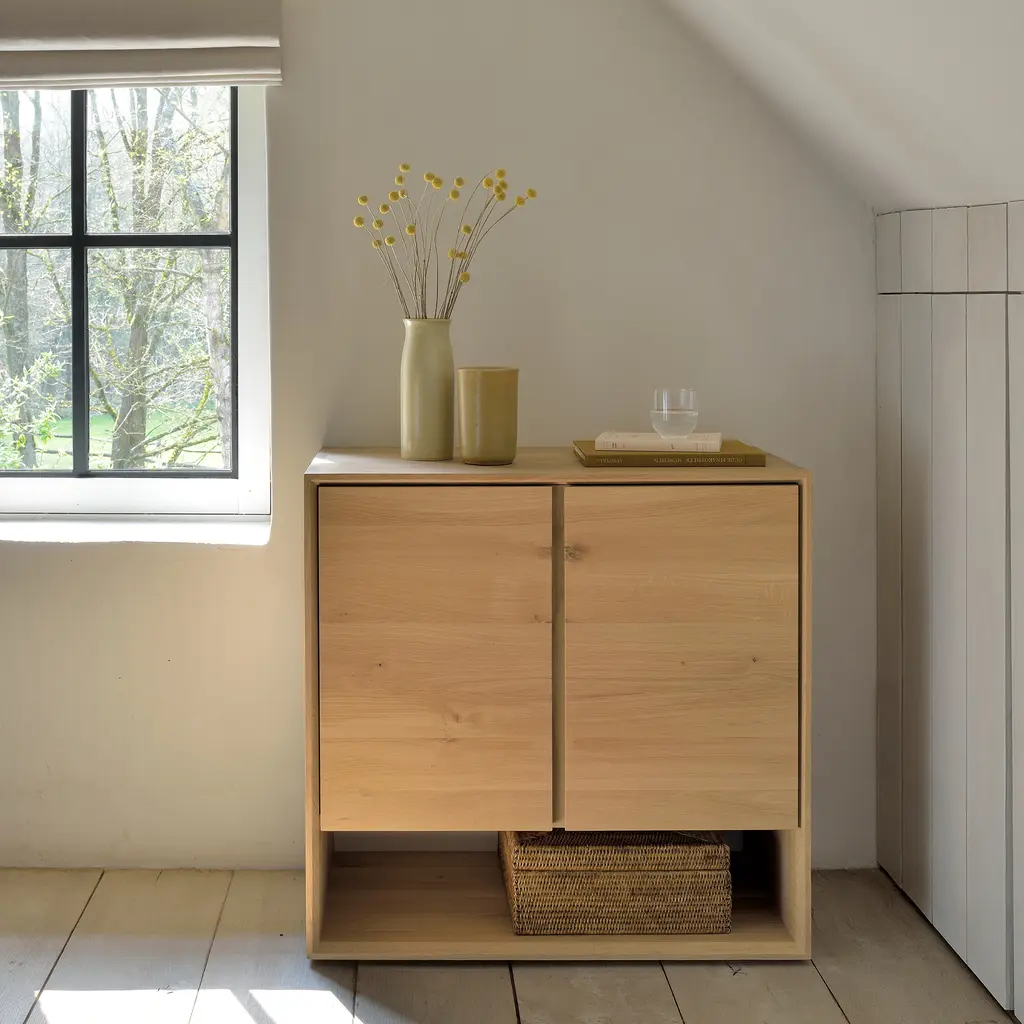 Embrace the essence of minimalistic Scandinavian style with the Nordic 2-Door Sideboard from Ethnicraft. This compact 31.5-inch wide piece is a perfect blend of functionality and aesthetic appeal. Crafted meticulously from solid oak wood, its natural finish accentuates the wood’s inherent beauty. The beveled edges add a distinct character to the sideboard, making it a standout addition to any room. Ideal for smaller spaces, it provides ample storage for essentials, from tableware to books, while its surface is perfect for displaying your favorite decorative items. The Nordic 2-Door Sideboard, with its clean lines and timeless design, is a testament to the elegance of simplicity.