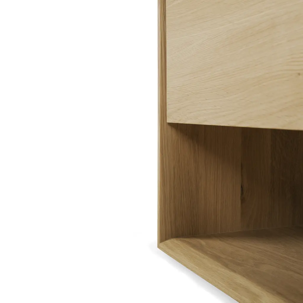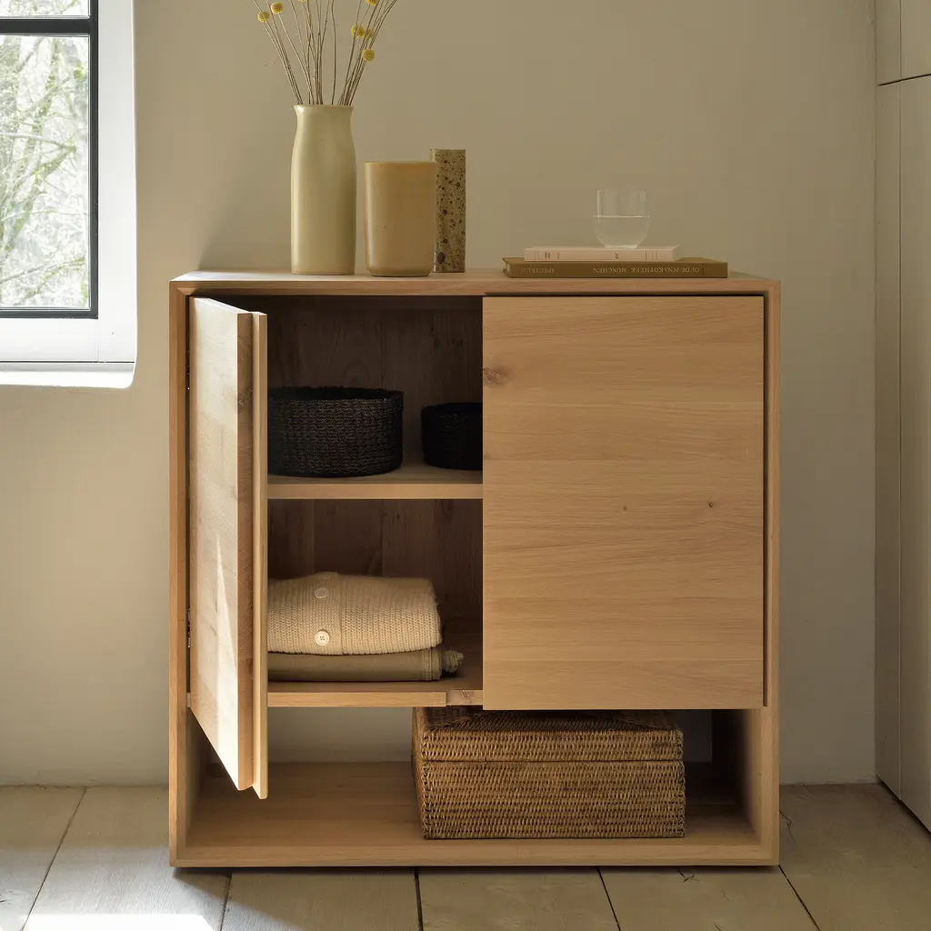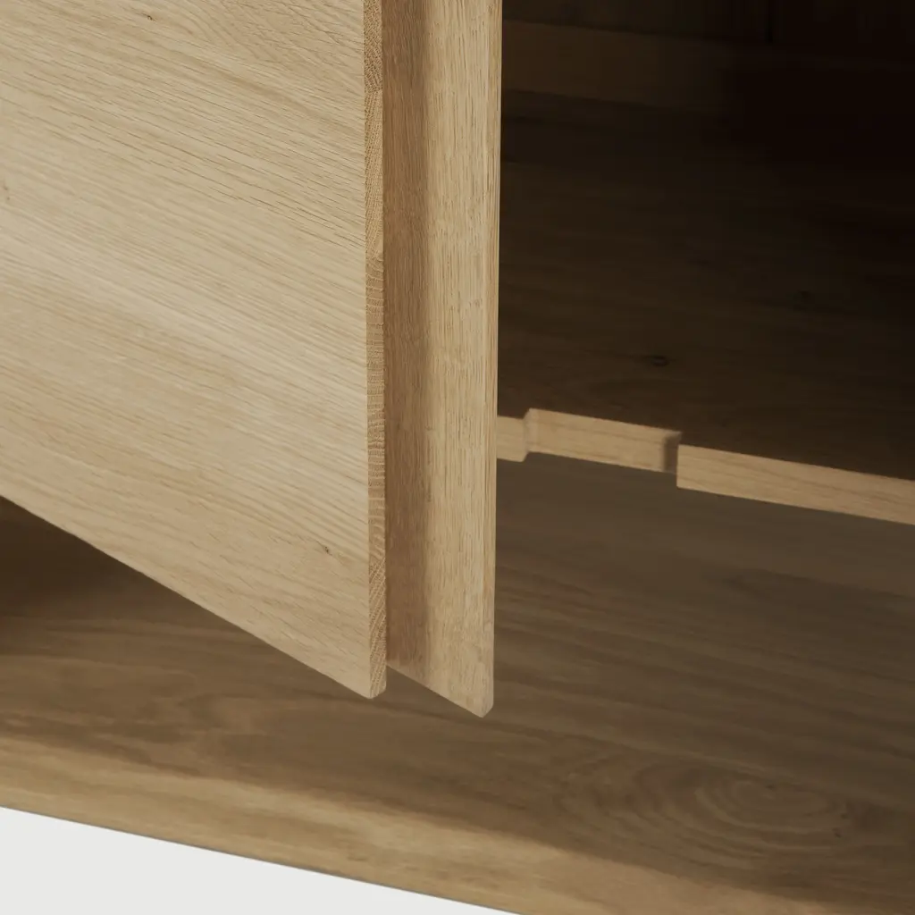Embrace the essence of minimalistic Scandinavian style with the Nordic 2-Door Sideboard from Ethnicraft. This compact 31.5-inch wide piece is a perfect blend of functionality and aesthetic appeal. Crafted meticulously from solid oak wood, its natural finish accentuates the wood’s inherent beauty. The beveled edges add a distinct character to the sideboard, making it a standout addition to any room. Ideal for smaller spaces, it provides ample storage for essentials, from tableware to books, while its surface is perfect for displaying your favorite decorative items. The Nordic 2-Door Sideboard, with its clean lines and timeless design, is a testament to the elegance of simplicity.