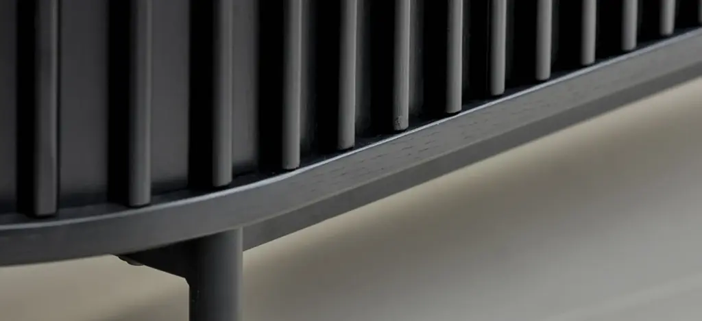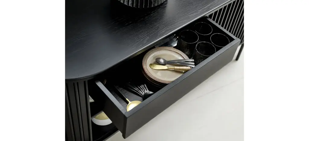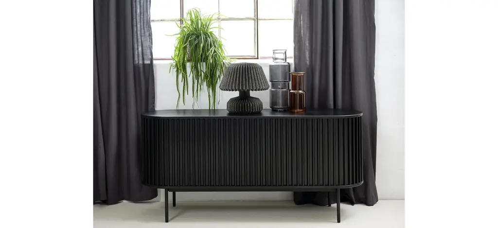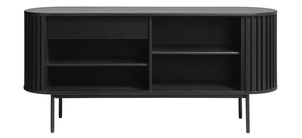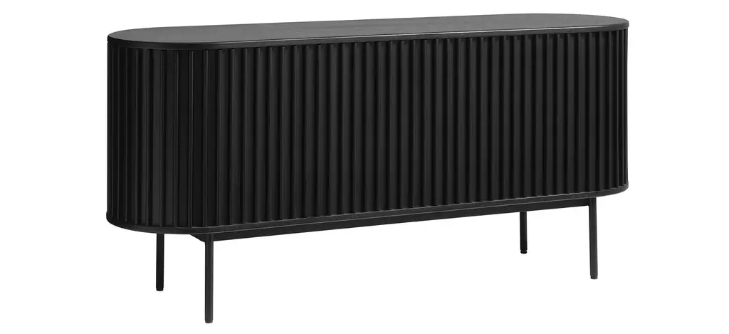 Combining the retro allure of mid-century design with industrial characteristics for a modern touch, this Nosara Sideboard is sure to sit naturally within many existing interior styles. Made from an oak veneer, with a textural appearance echoing the grain and raw beauty of natural wood, the tambour door cabinet has a certain charm. Signature slatted paneling on the main body of this piece further elevates its modern appeal, whilst lending this cabinet its unmistakable character. Formed by space-saving solid slatted doors, showing honest details of wooden tapering and built-in handles, it celebrates our Nordic design tradition to its fullest.
