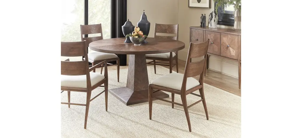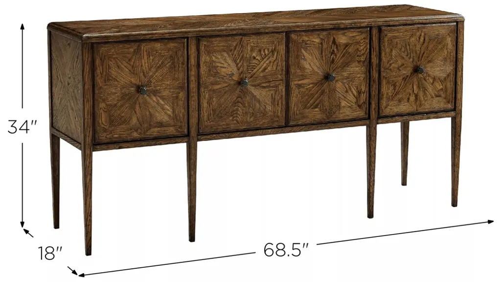 The radial star patterned veneer on the Nova Four Door Rectangular Credenza is strikingly charming. The mosaic-inspired doors and tapered oak legs seen here in our Dusk finish with the fine Verde Bronze finished hardware come together to create a uniquely sophisticated piece.