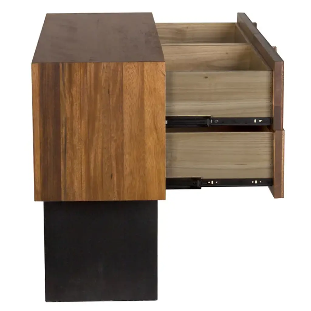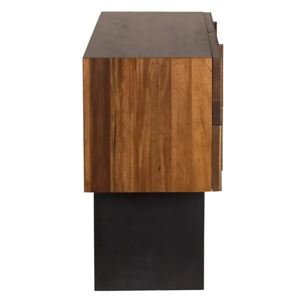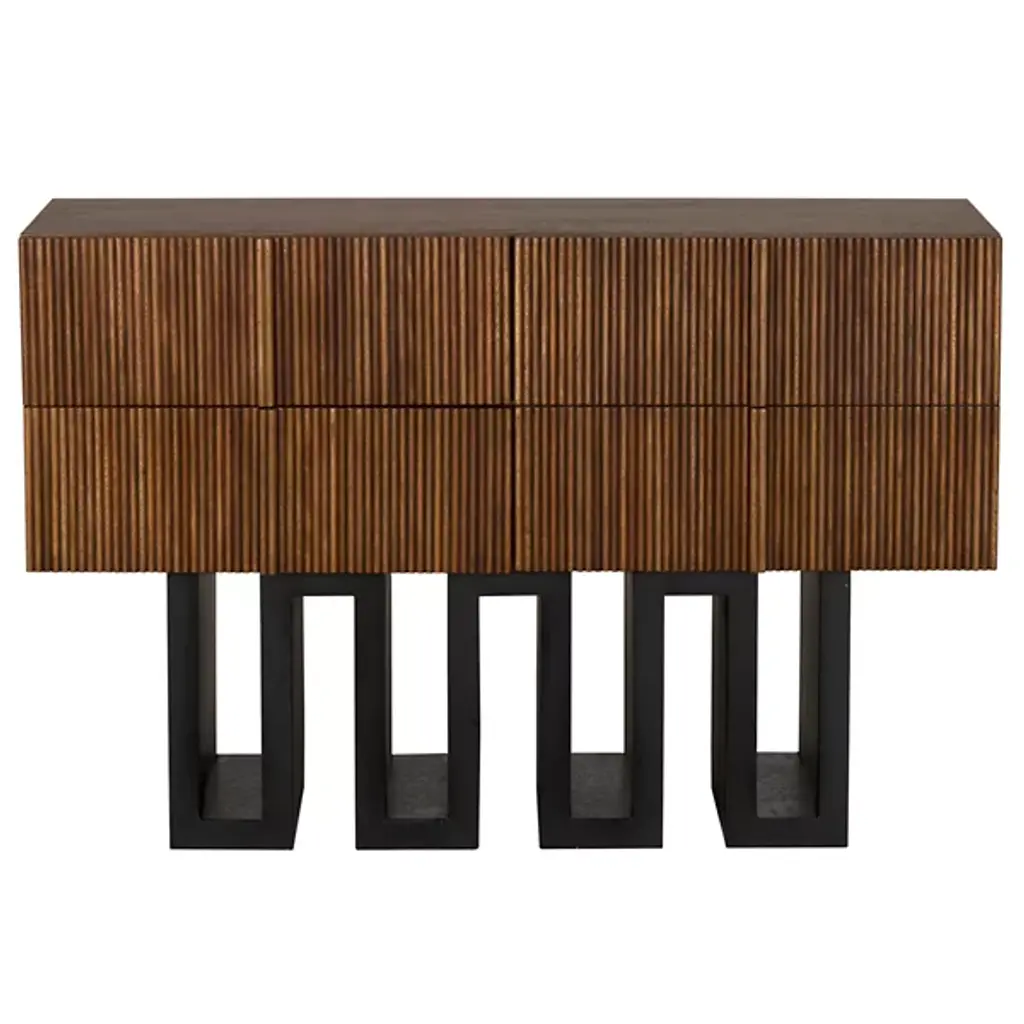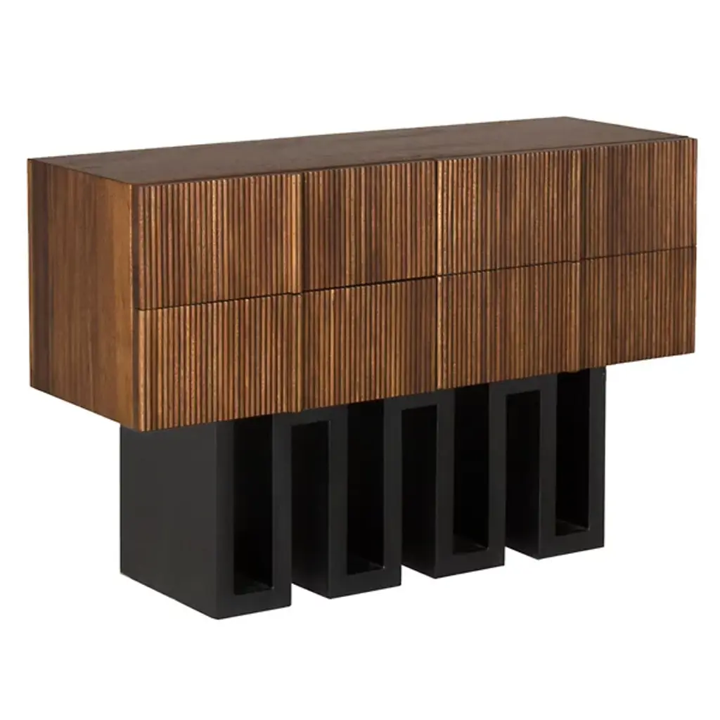 The Nova Sideboard from Noir contrasts walnut against black steel for a rustic modern appearance. Vertical fluted detailing wraps the walnut upper cabinet, while angular steel supports create a dramatic geometric foundation beneath. The rich wood grain provides organic warmth above the precise metalwork, generating visual tension between natural and manufactured materials. Multiple drawer configurations offer practical storage while the elevated design creates open floor space below, proving that mixed materials can achieve both functional storage and sculptural presence.