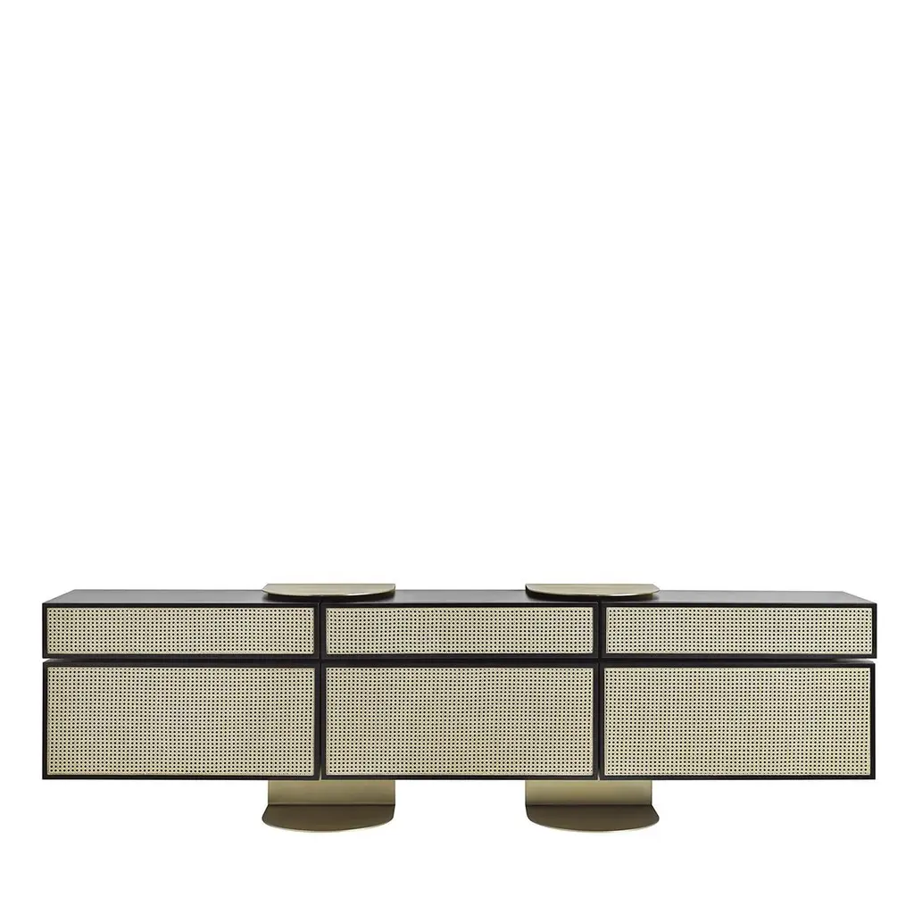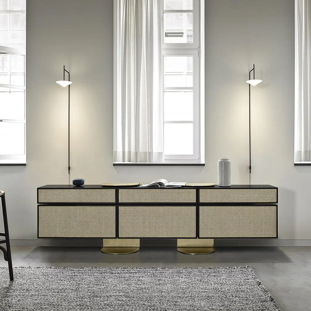 A balanced and elegant encounter between architecture, design, and craftsmanship, this exquisite sideboard is deftly handmade of first-rate lacquered wood and Vienna straw. Sleek and modern, it can be wall-mounted thanks to a satin brass-finished metal structure. Part of a series that also features a vertical cabinet and a chest of drawers, this piece will take center stage in a refined interior space.