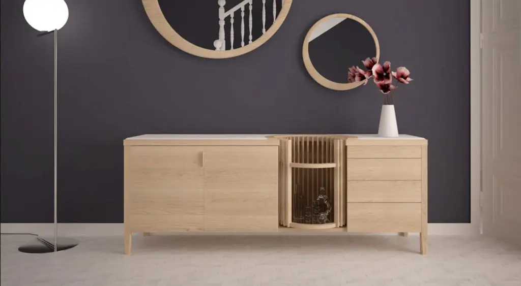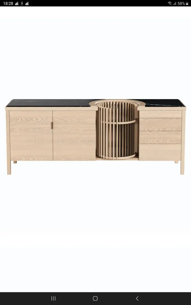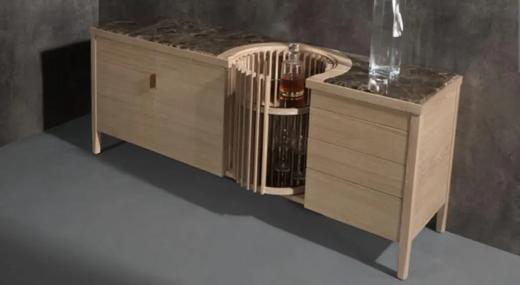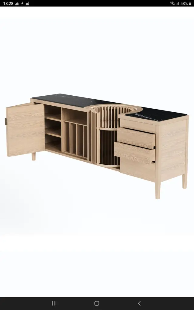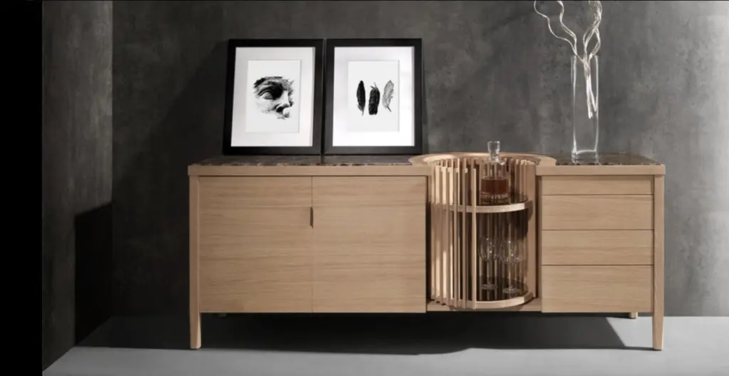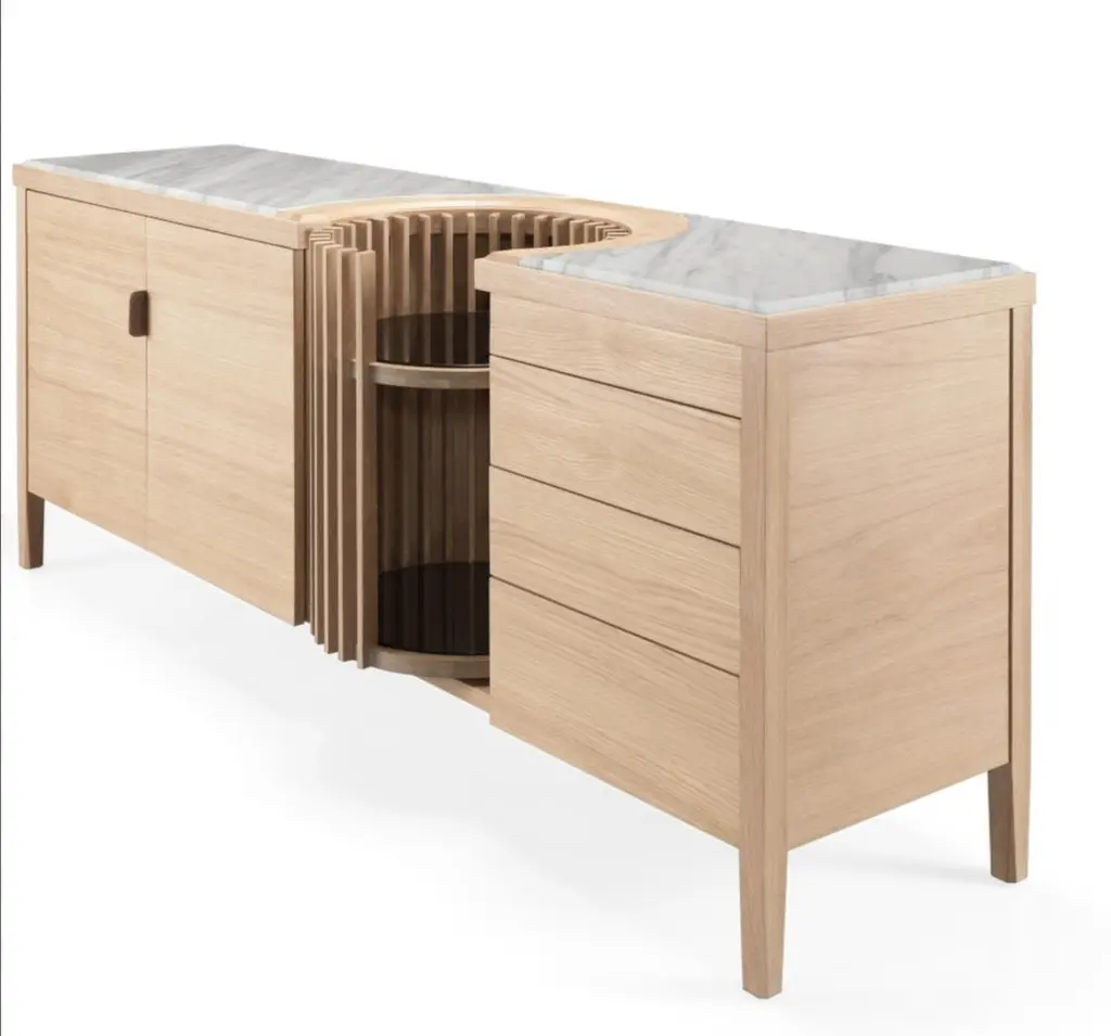 This beautiful solid Oak and marble top sideboard and bar features two folding doors with internal wooden shelves and four drawers with tic-tac system, emphasizing the high quality of the materials and our skilled craftsmanship.The focal point of the sideboard is its turntable in the middle which can be used to put bottles and glasses of wine and whisky or the favorite objects more easily accessible.You can choose between 2 Premium marbles white Calacatta or brown Emperador. Please see pictures. Black marble is possible.DIMENSIONS Width 2050mm Height 810mm Depth 580 mmIn inches : width 80.709' height 31.89' depth 22.835'Available in oak or walnut and the top in marble.Due to differences in monitors, colors of natural wood and marbles products may appear different to those shown on this page.