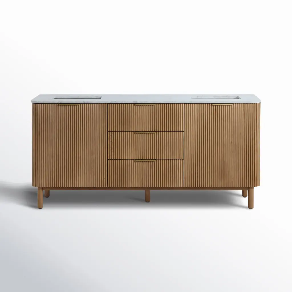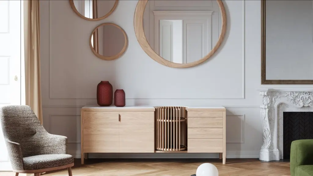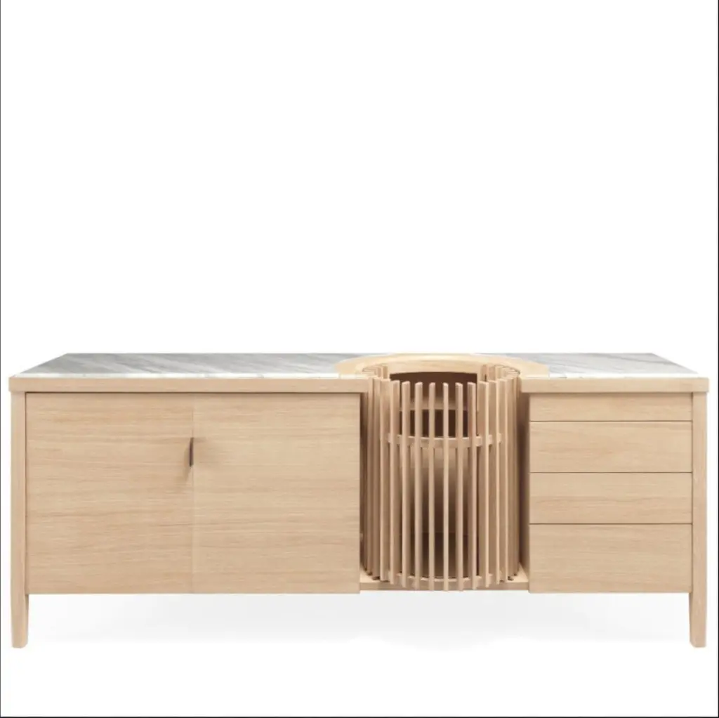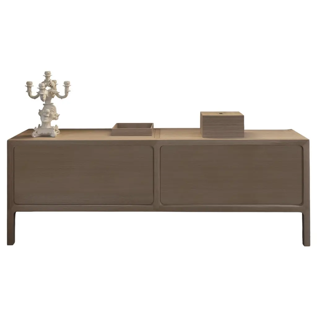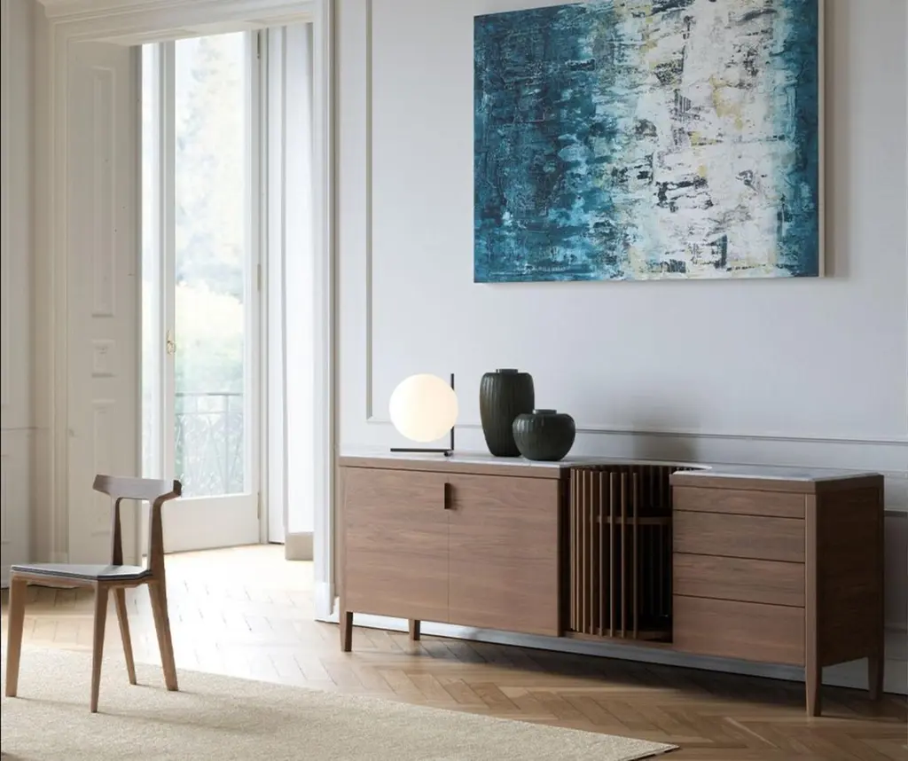 This beautiful solid Oak and marble top sideboard and bar features two folding doors with internal wooden shelves and four drawers with tic-tac system, emphasizing the high quality of the materials and our skilled craftsmanship.The focal point of the sideboard is its turntable in the middle which can be used to put bottles and glasses of wine and whisky or the favorite objects more easily accessible.You can choose between 2 Premium marbles white Calacatta or brown Emperador. Please see pictures. Black marble is possible.DIMENSIONS Width 2050mm Height 810mm Depth 580 mmIn inches : width 80.709' height 31.89' depth 22.835'Available in oak or walnut and the top in marble.Due to differences in monitors, colors of natural wood and marbles products may appear different to those shown on this page.