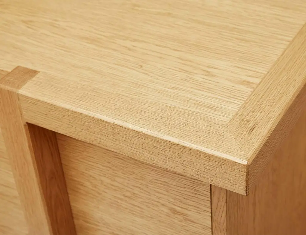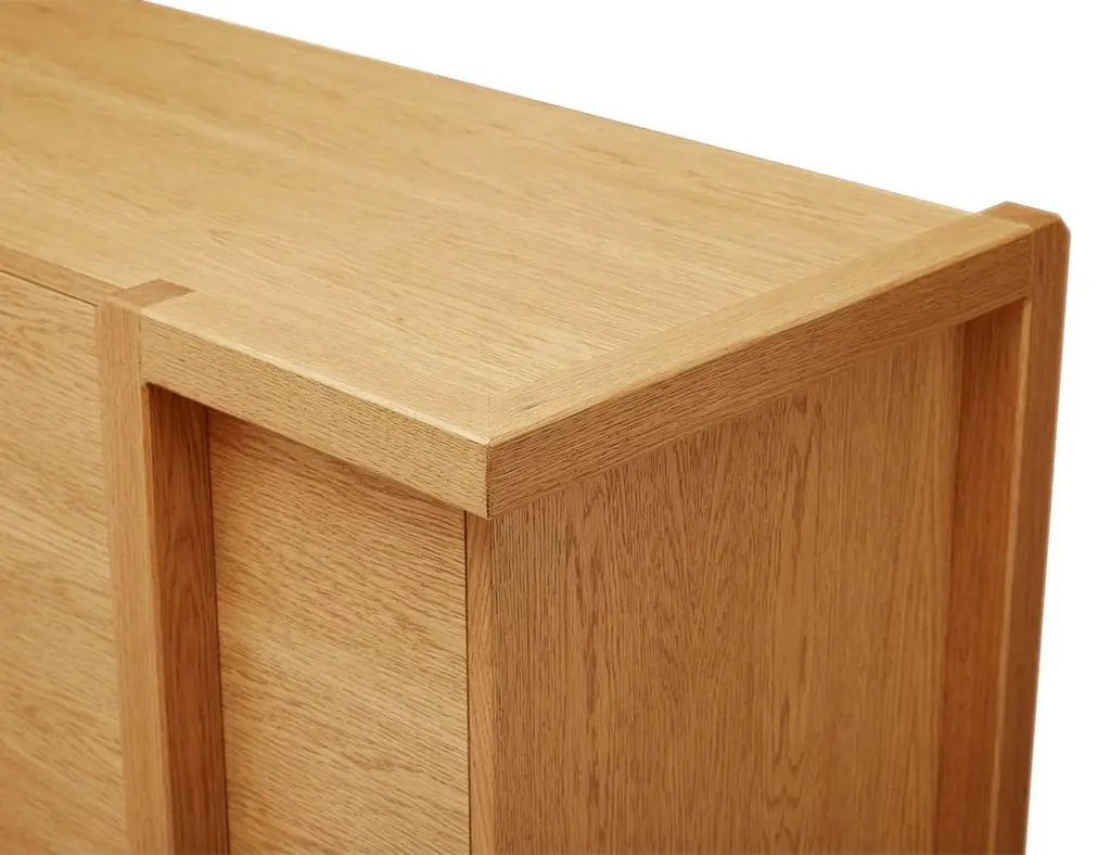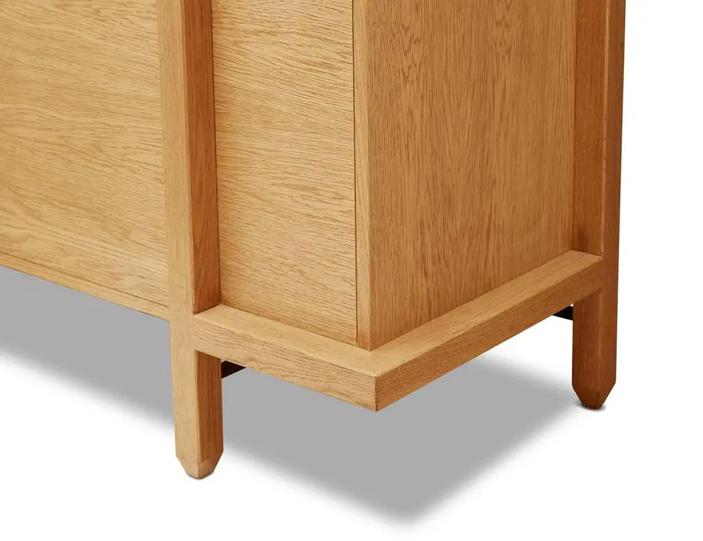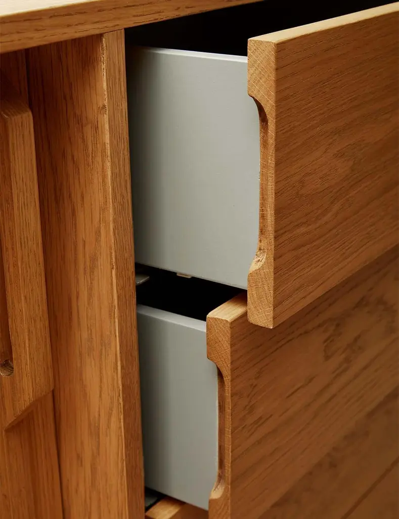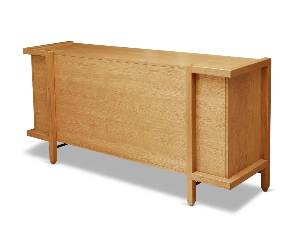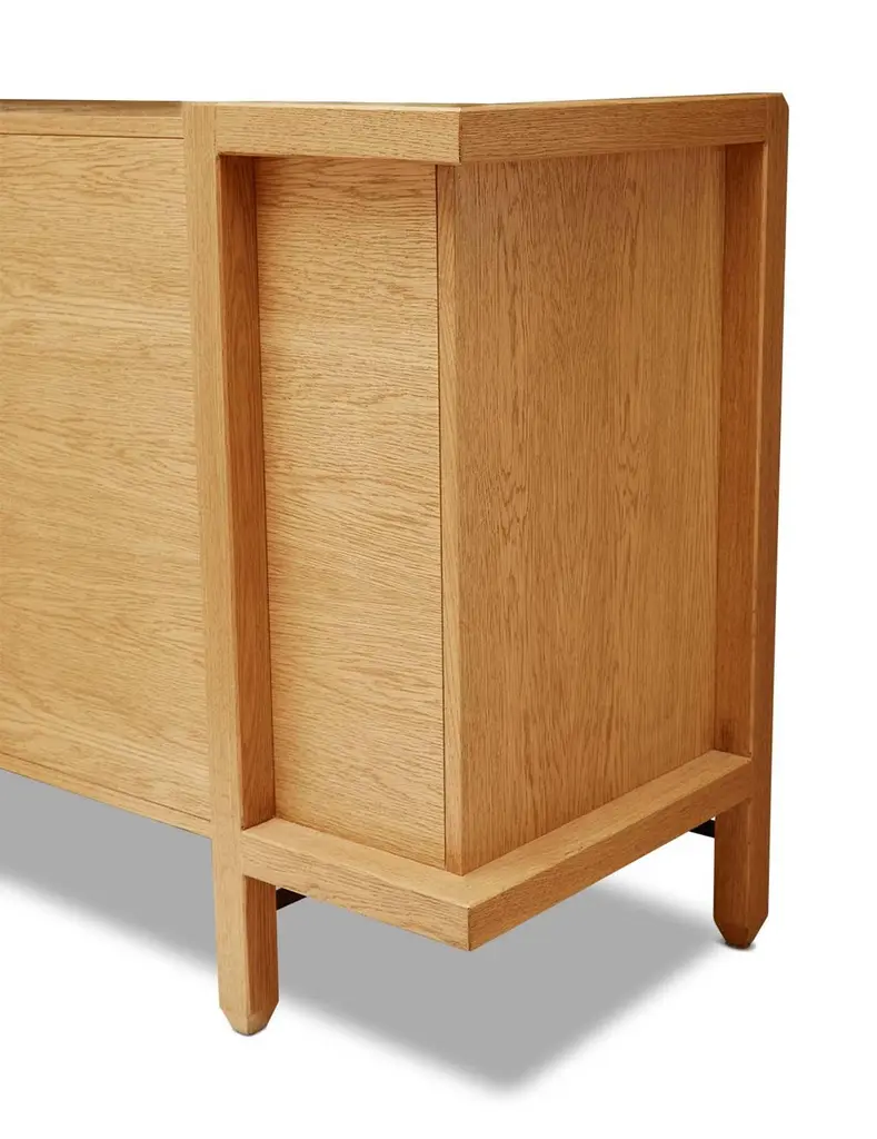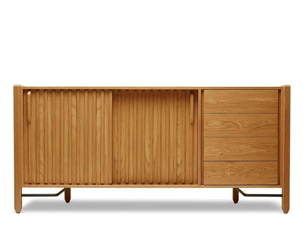 The Ojai credenza has four drawers and two bypass doors with open storage behind it. It has solid white oak or American walnut legs and case, and features a metal stretcher on the base.The Lawson-Fenning Collection is designed and handmade in Los Angeles, California.