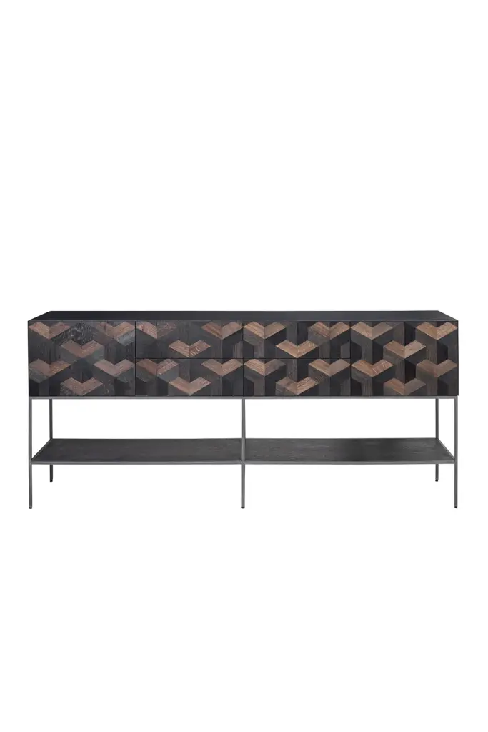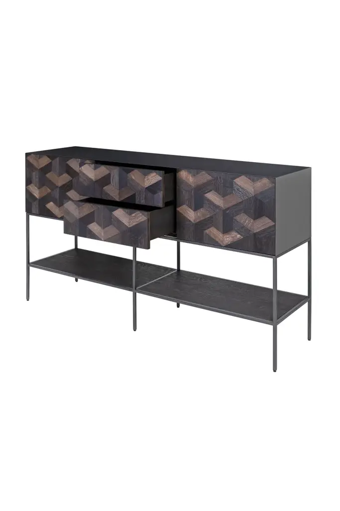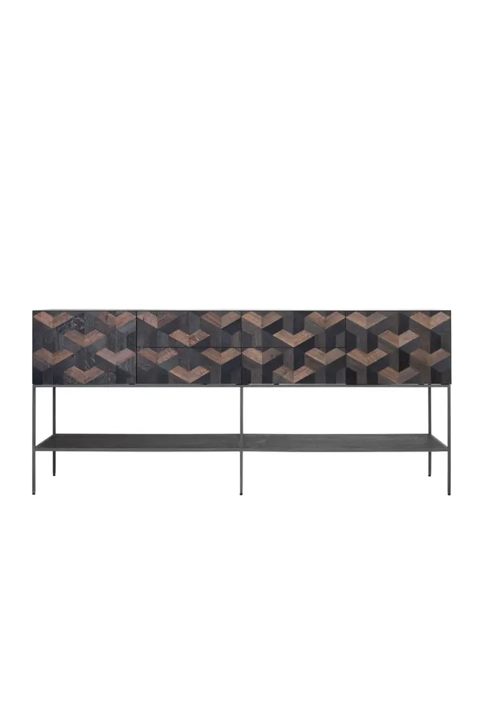 The Illusion Sideboard by Versmissen presents a modern design and functionality. With a sleek black steel frame and a wooden body adorned with striking oak parquet, this piece exudes timeless elegance. It features a single door that unveils two compartments and an open shelf at the bottom, providing additional space for display or storage needs. This clever design not only offers concealed storage but also showcases items for a balanced aesthetic.