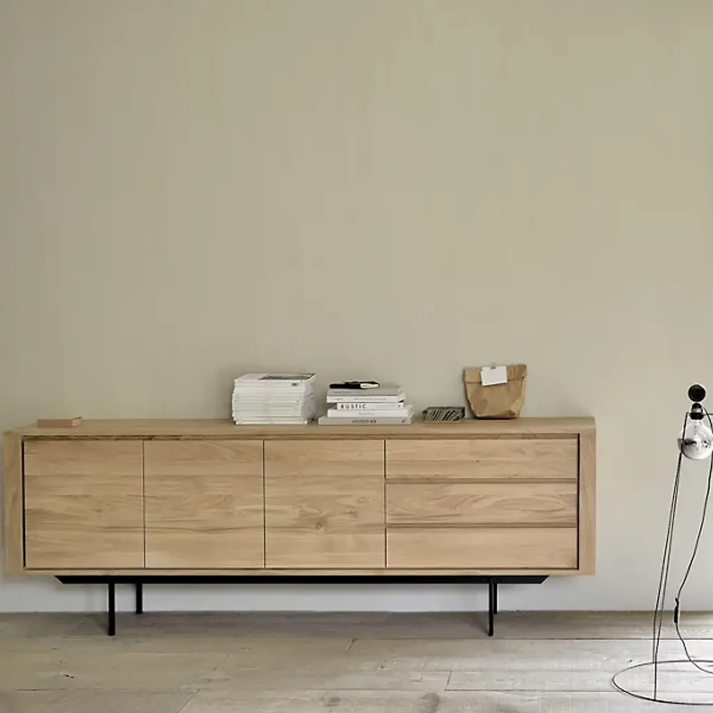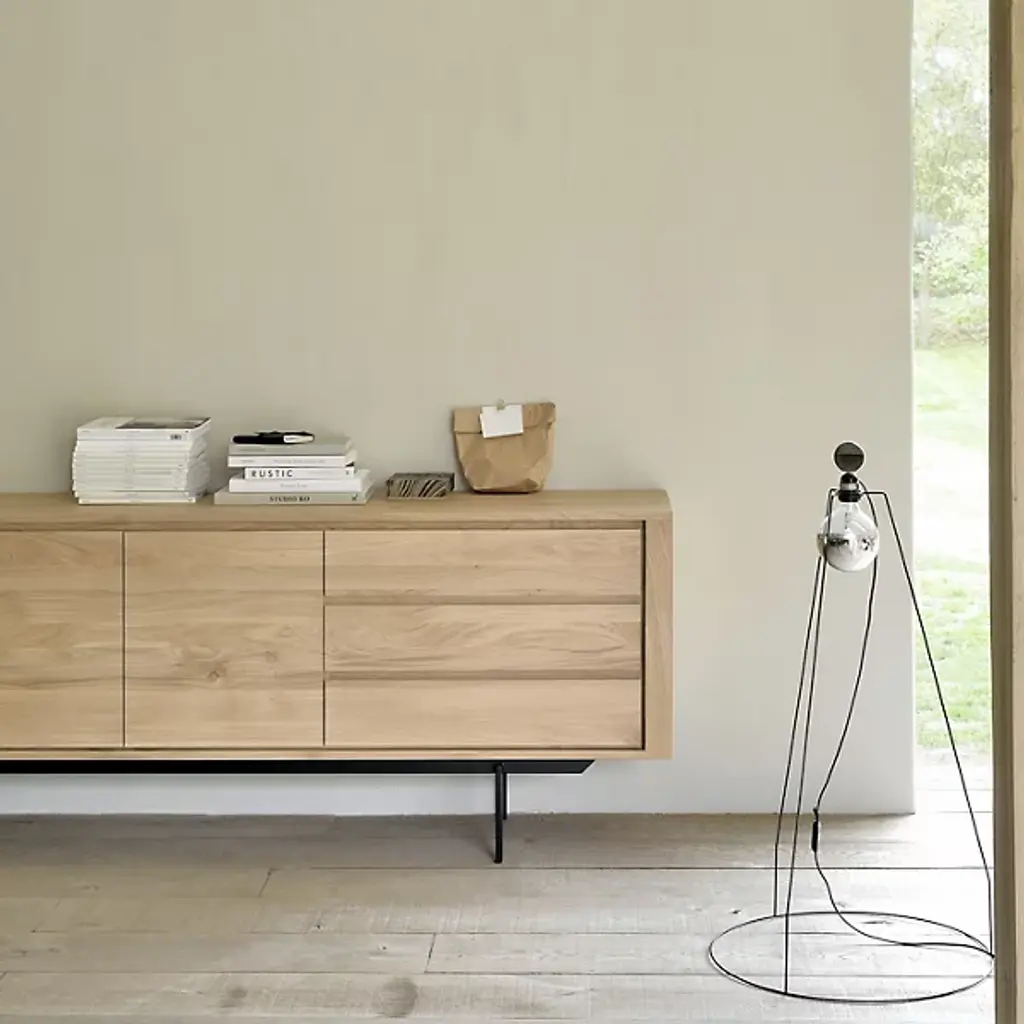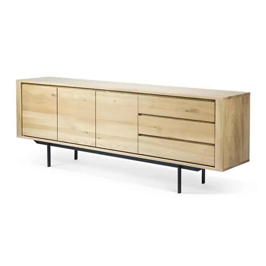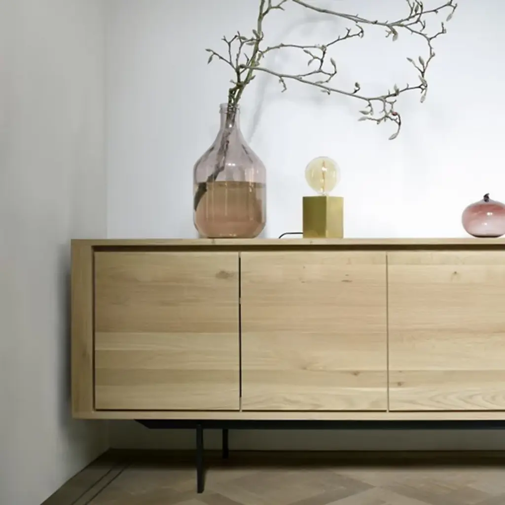 The Oak Shadow Sideboard - 3 Doors - 3 Drawers by Ethnicraft is a handsome, well-crafted design made from beautiful, solid oak wood. Defined by clean lines and elevated by a set of simple metal legs, this sideboard has three doors and three drawers, offering plenty of room to organize a range of items. The spacious surface of this piece is ideal for displaying décor or arranging items that you need easy access to, lending spaces a balanced mix of form and function.