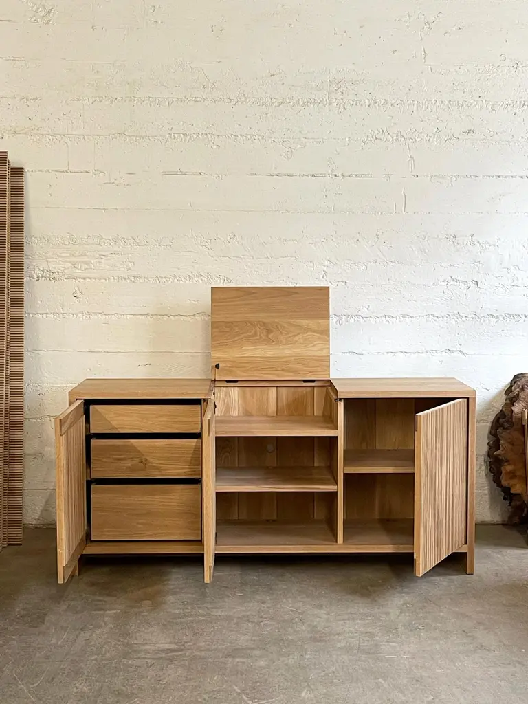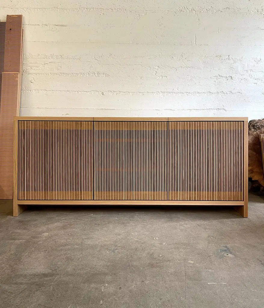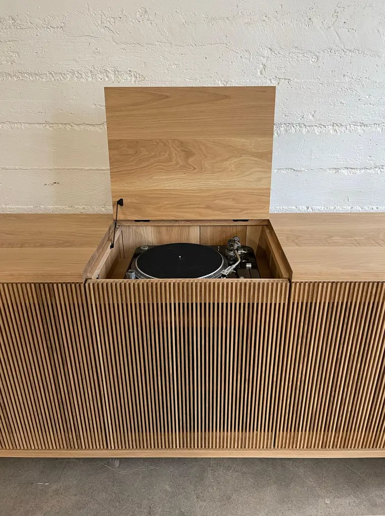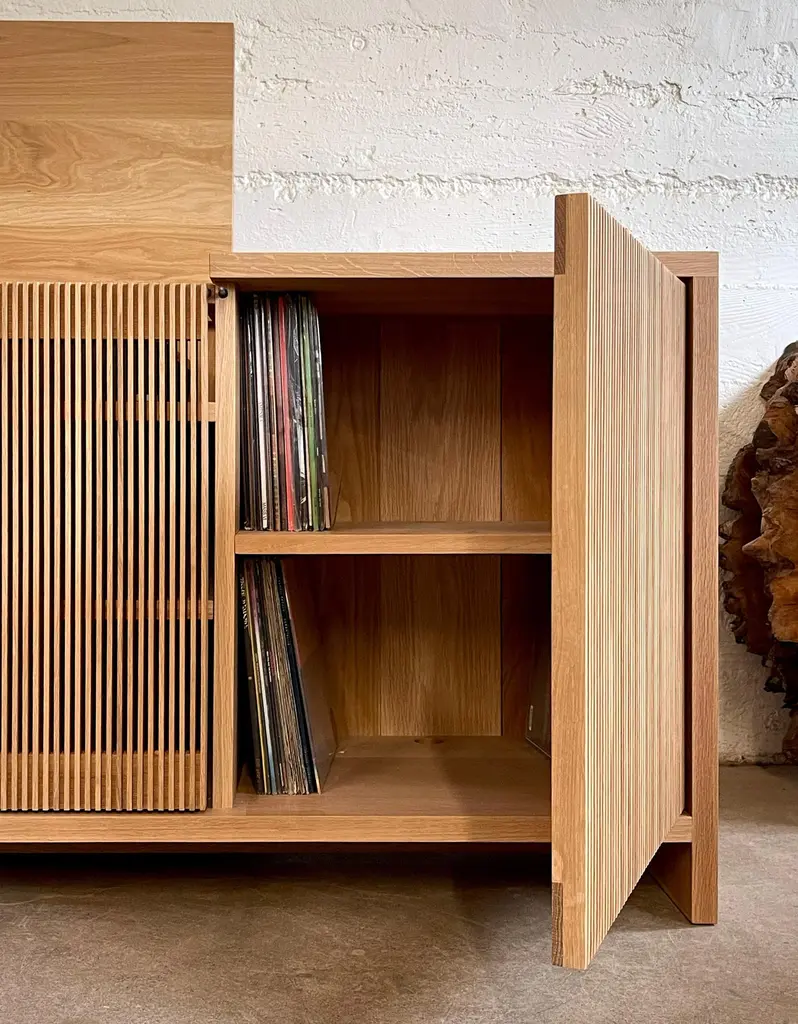 Solid wood credenza / sideboard with slatted screen doors in white oak built by Material in Portland, Oregon. This piece is outfitted with a top hatch door for access to a space for a record player. Shelves are optimized for album storage. The clean modern lines and quiet texture of this piece are perfect for building visual interest in a room. With a solid wood tongue and groove back panel and plenty of cord openings in the bottom and shelves.. Open slats allow for use of remote controls and wifi so you can conceal electronics, and sound so speakers can be tucked away.Custom sizes available. Offered in waxed white oak, blackened ash and black walnut. Base unit comes with 3 drawers on the left and adjustable shelves at the middle and right hand side.