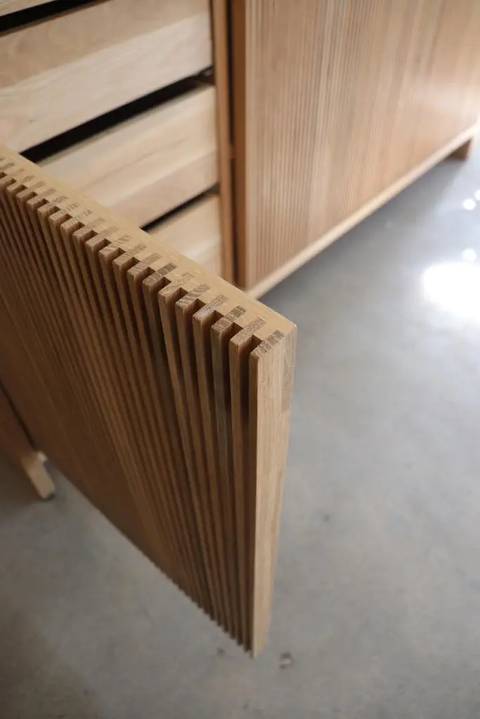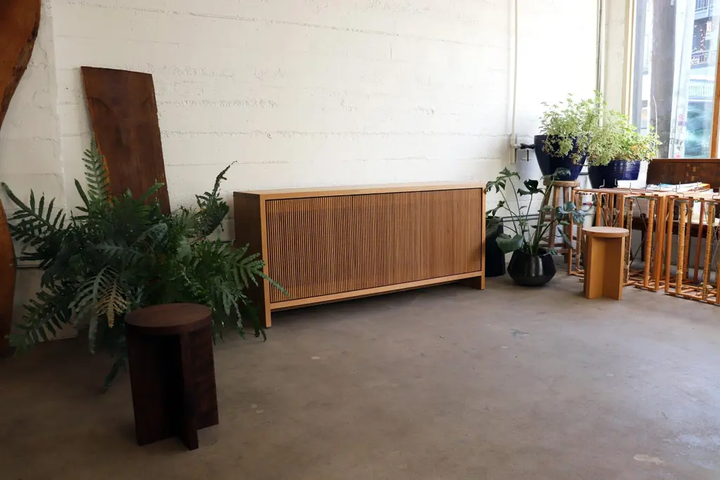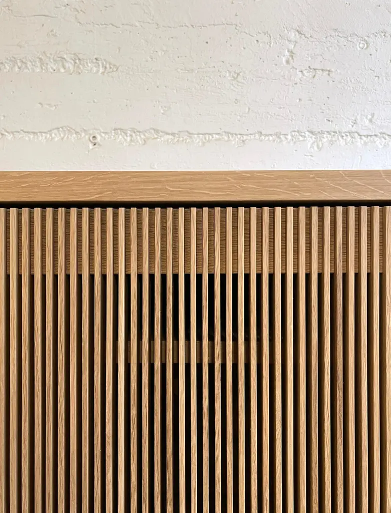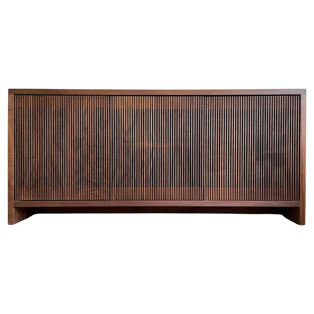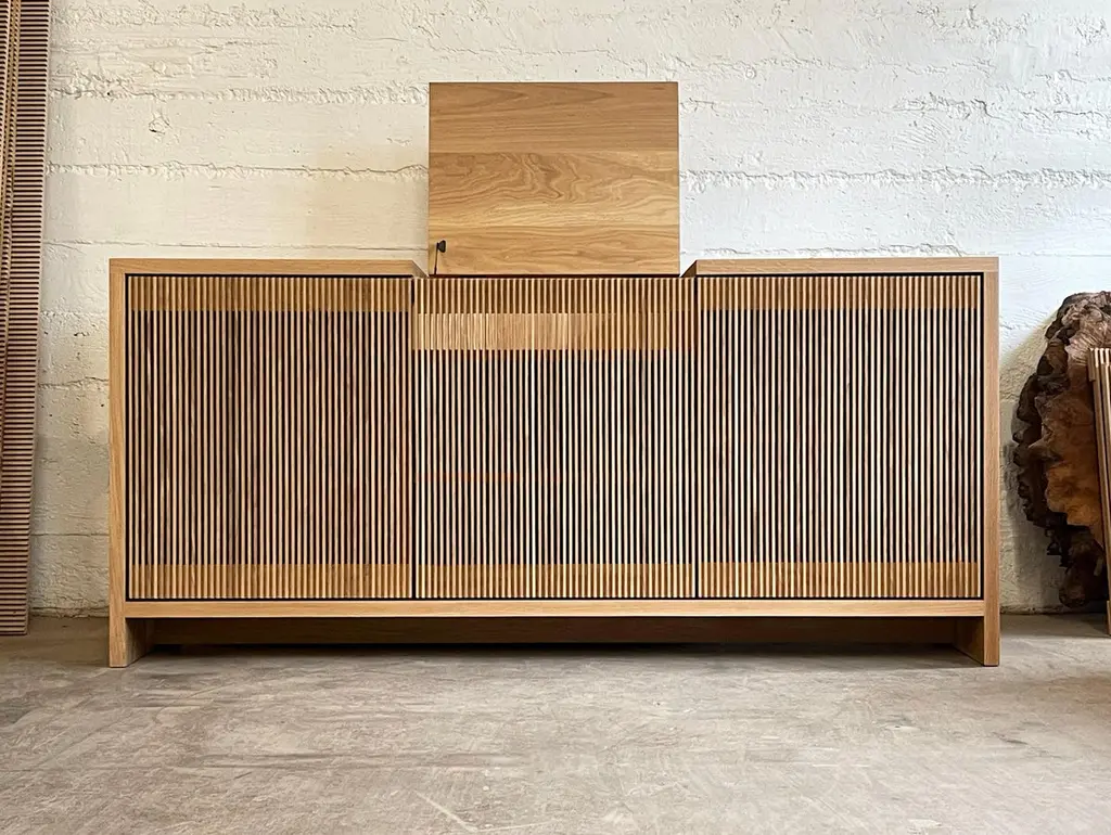 Solid wood credenza / sideboard with slatted screen doors in white oak built by Material in Portland, Oregon. This piece is outfitted with a top hatch door for access to a space for a record player. Shelves are optimized for album storage. The clean modern lines and quiet texture of this piece are perfect for building visual interest in a room. With a solid wood tongue and groove back panel and plenty of cord openings in the bottom and shelves.. Open slats allow for use of remote controls and wifi so you can conceal electronics, and sound so speakers can be tucked away.Custom sizes available. Offered in waxed white oak, blackened ash and black walnut. Base unit comes with 3 drawers on the left and adjustable shelves at the middle and right hand side.