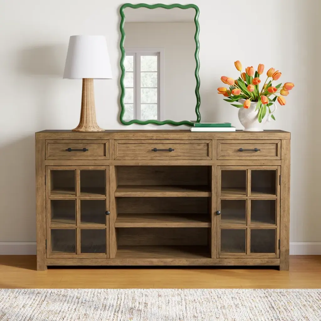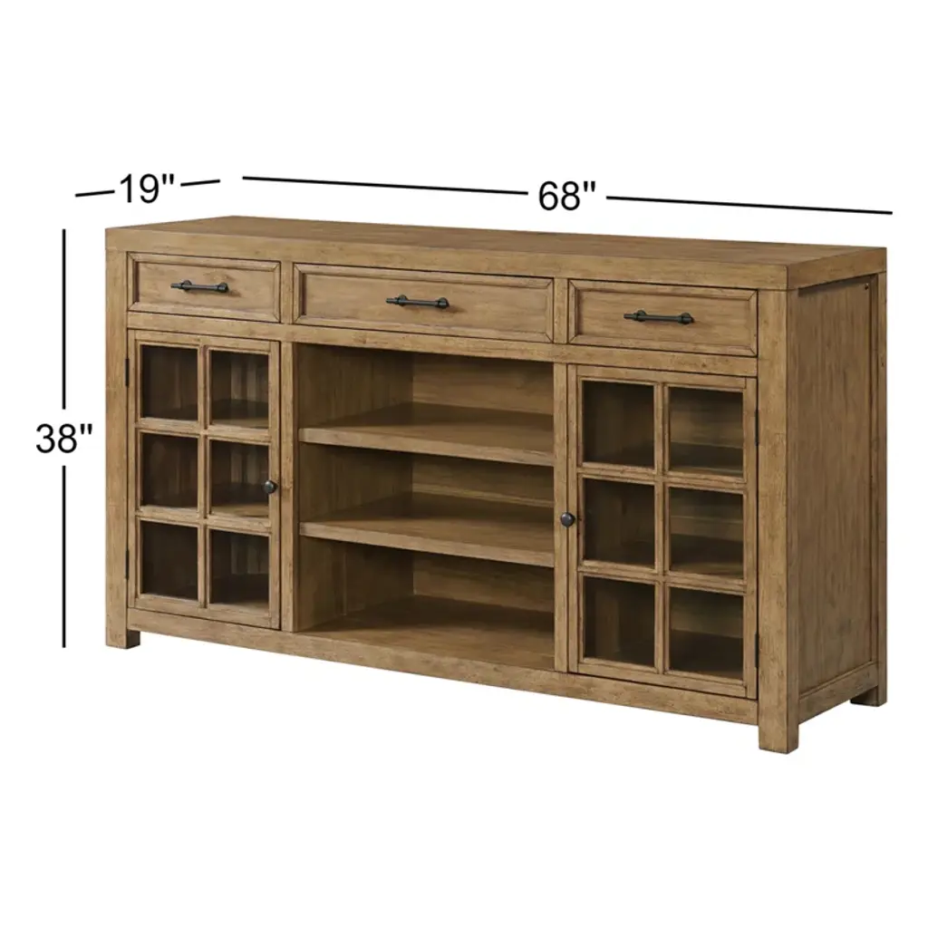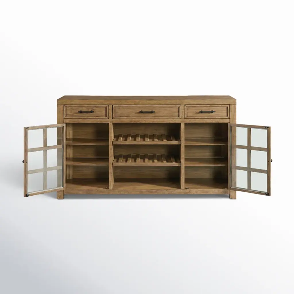 The prominent natural wood grain and toasted almond finish are elements that make this sideboard really stand out. Add to that all the storage space it offers: Two glass-paneled cabinets with LED-lit interiors, three upper drawers, plus slatted shelves for your wine collection. Bonus: A wall anchor is included and recommended for stability.