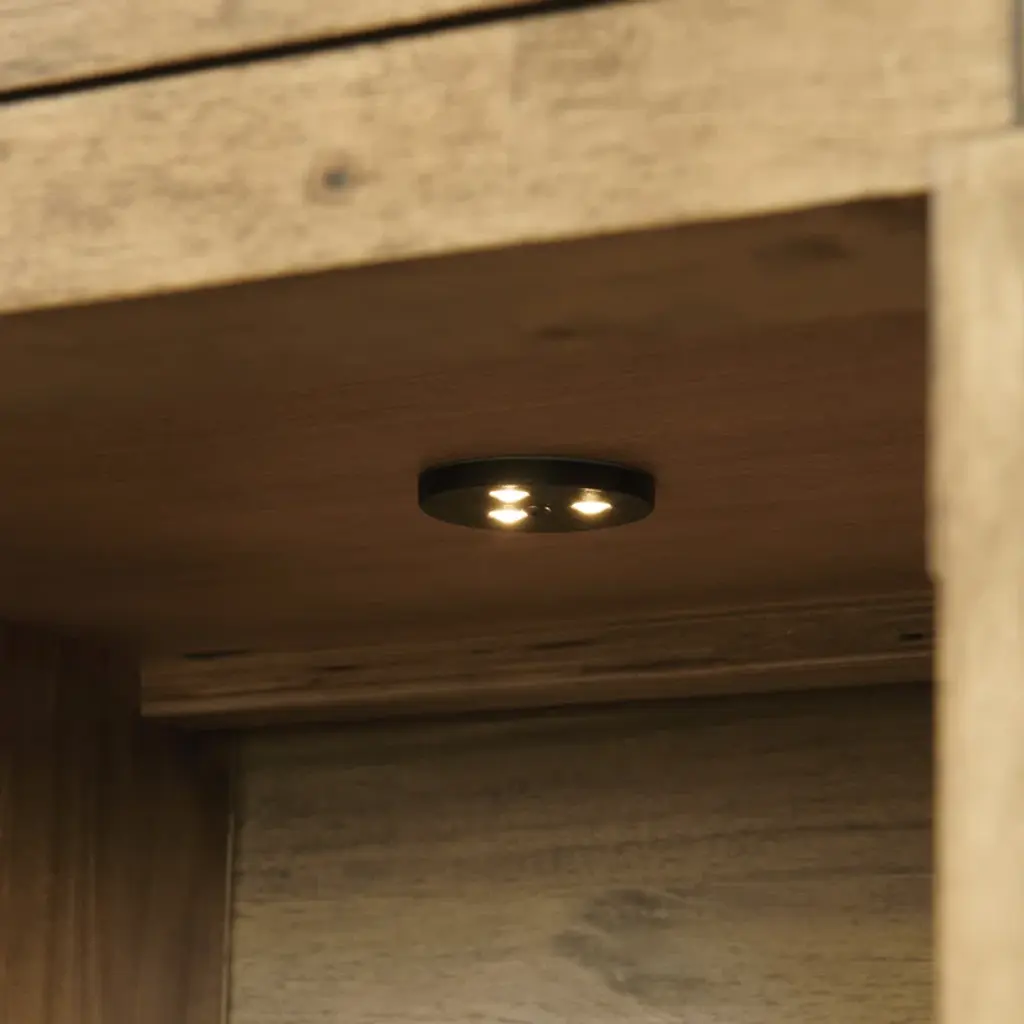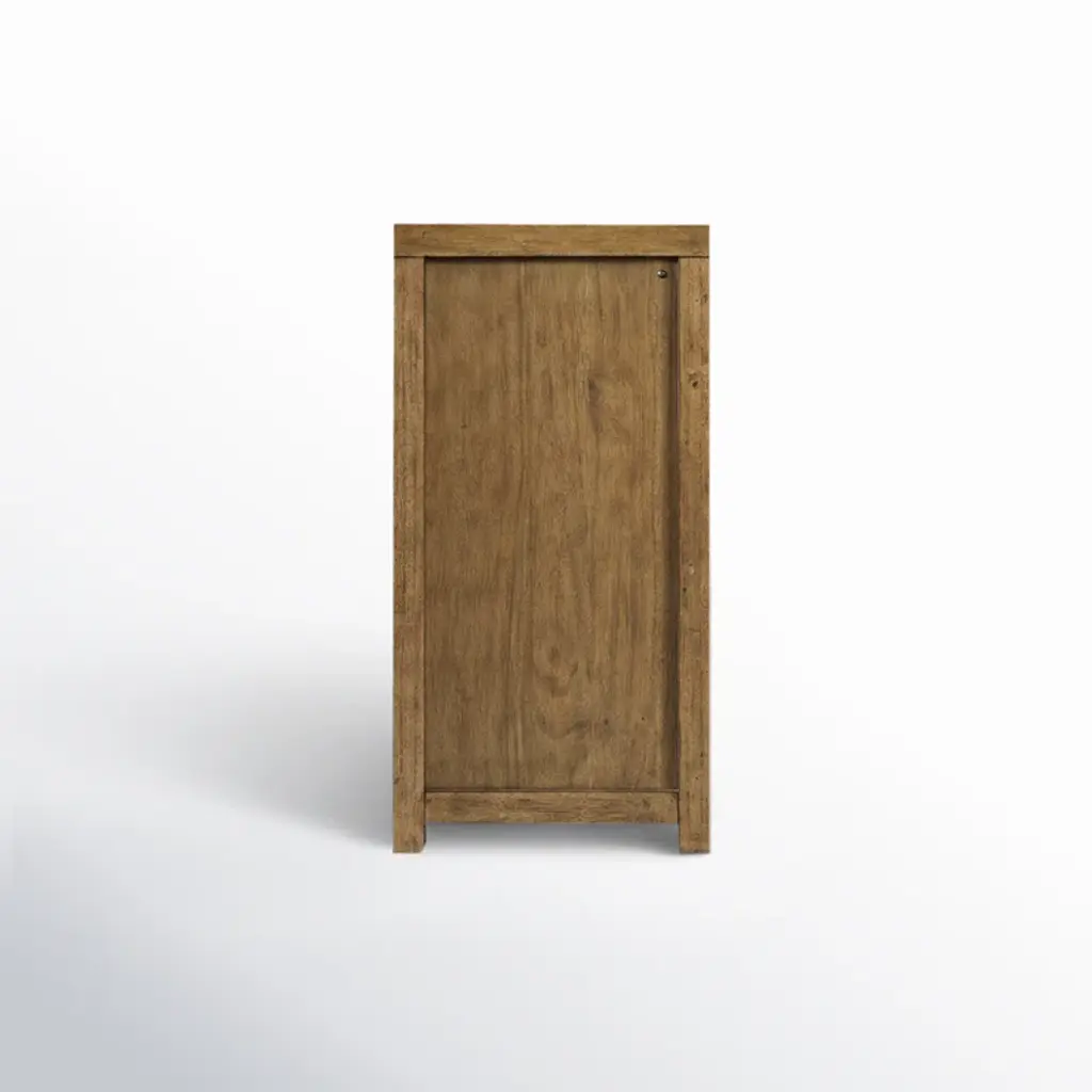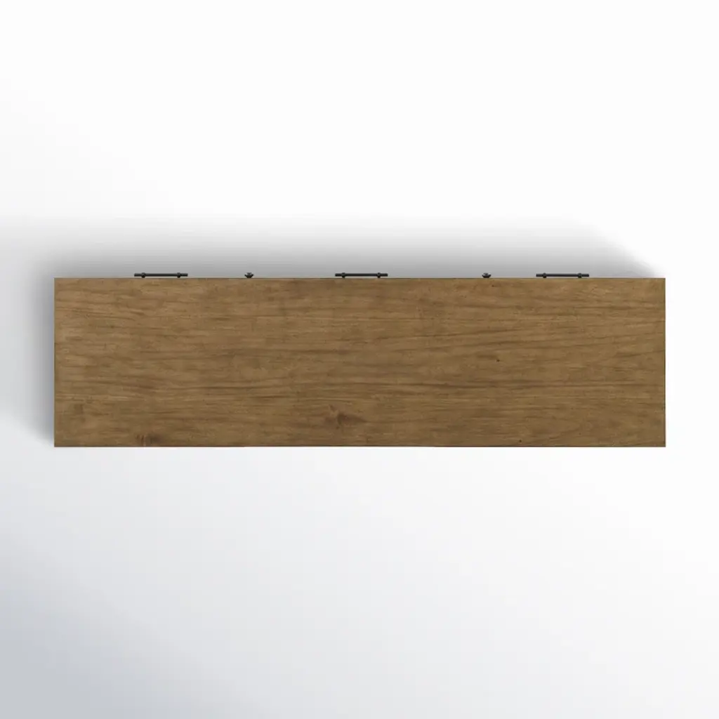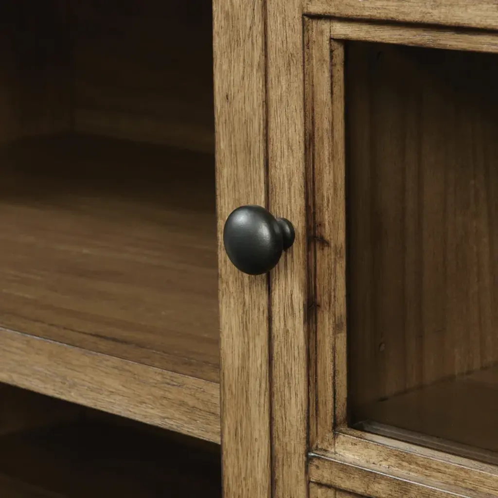 The prominent natural wood grain and toasted almond finish are elements that make this sideboard really stand out. Add to that all the storage space it offers: Two glass-paneled cabinets with LED-lit interiors, three upper drawers, plus slatted shelves for your wine collection. Bonus: A wall anchor is included and recommended for stability.