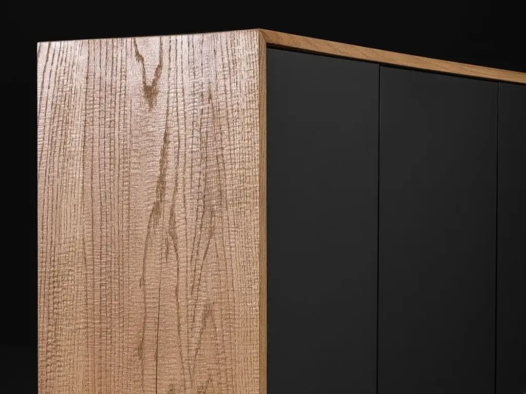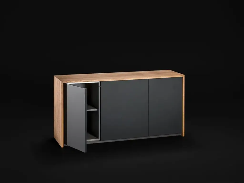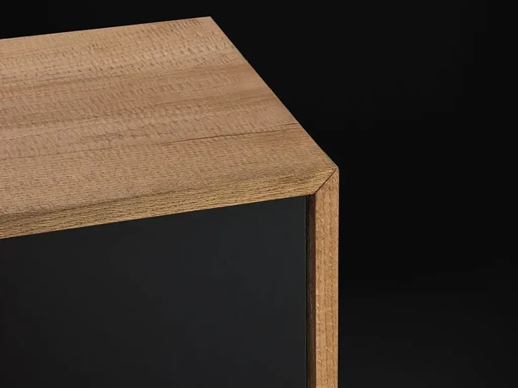 The encounter between solid wood and iron is one of the distinguishing traits of Bruno Spreafico's products. This time we present you a unique perspective: the iron dominates the surface of the sideboard with three doors of 45-60-45 centimeters framed by a hard, resistant, and tenacious oak wood structure with its yellow/reddish hue.Each creation by Bruno Spreafico is unique and made to measure, offering a wide selection of essences, supports, processing, colors, materials, dimensions, and other features.The model shown in the photo refers only to the essence indicated in the product name.