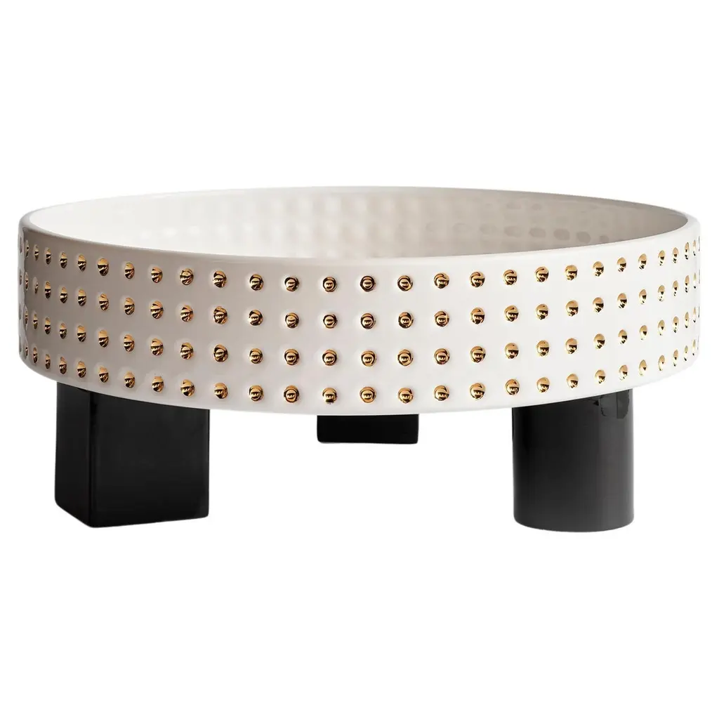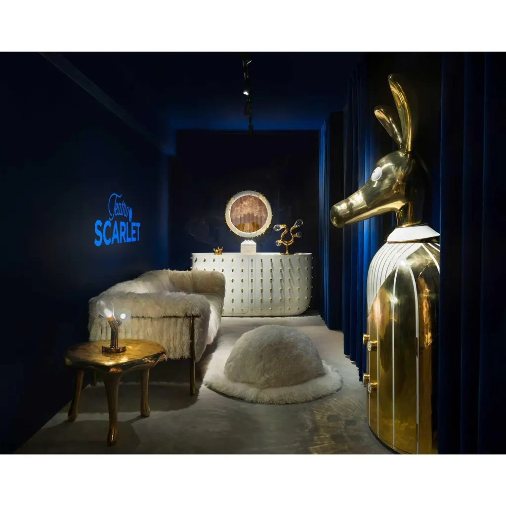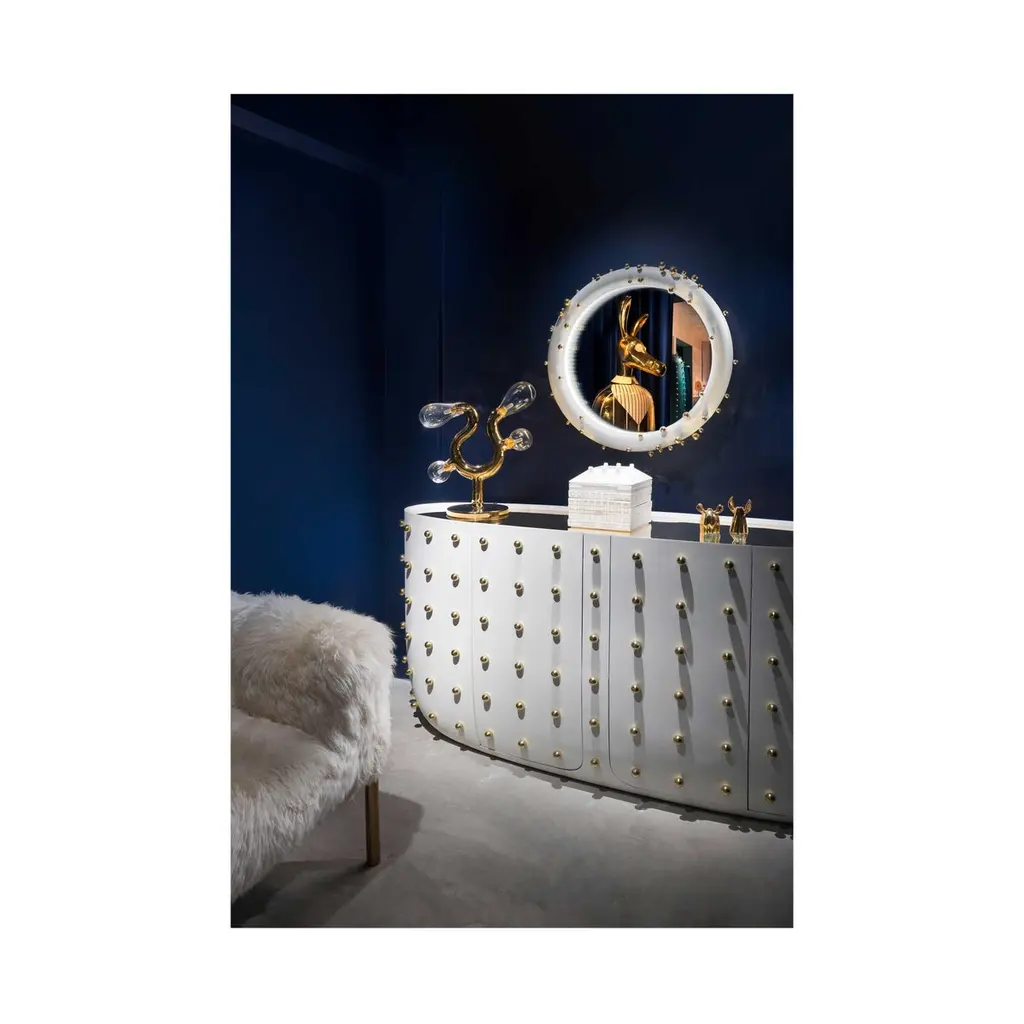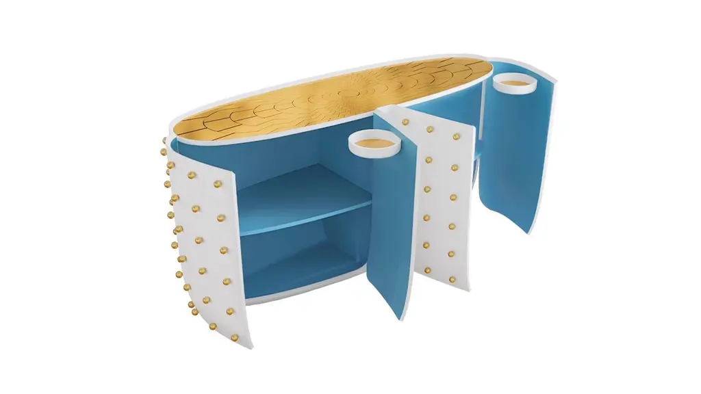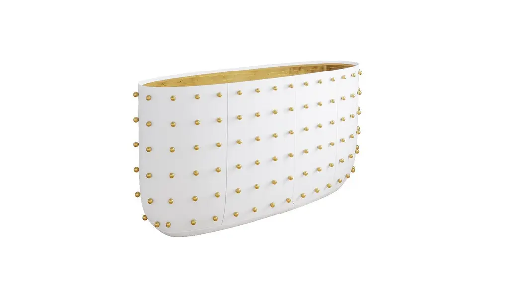The gleaming brass spheres on the oasis white sideboard cabinet with brass balls by Richard Hutten is reminiscent of a marvelous white succulent. It has a brass top and pale blue interiors.The Oasis collection for Scarlet Splendour by Richard Hutten is highly visual in the vast desert of mundane design, the first glimpse of the Oasis cabinet stuns the viewer. In an odd way it calms one’s senses, in the way all beauty does. It is sleek and utilitarian, dressed in brass “thorns” that allure one to its heart.Care: Wipe gently with dry soft cloth. Liquid spillage must be wiped without delay.Celebration of authenticity: Slight variations or imperfections are the marks of an artisan, a testament to the individuality, emotion and originality of each work of art. We assert our right to make meaningful qualitative changes.Please note: Prices do not include VAT. VAT may be applied depending on the ship-to location.