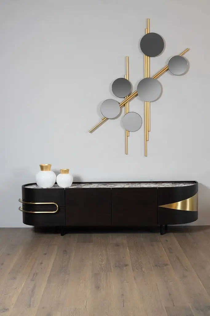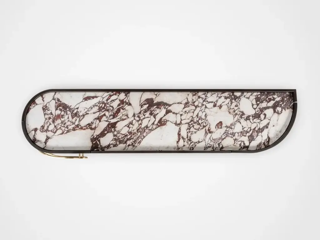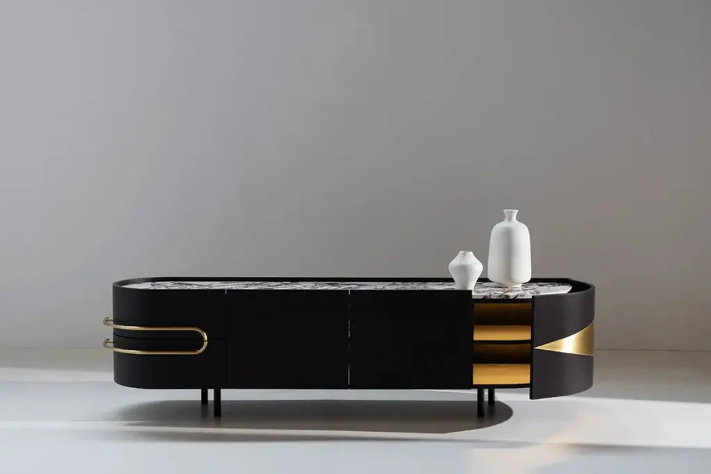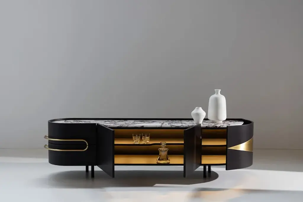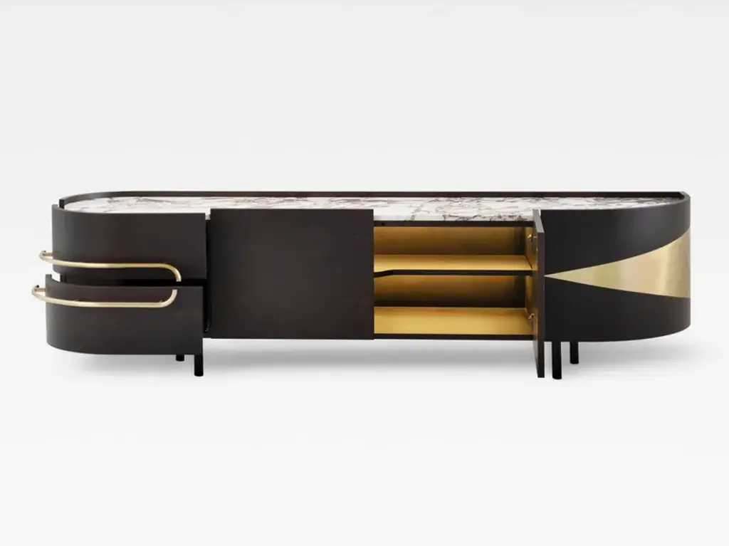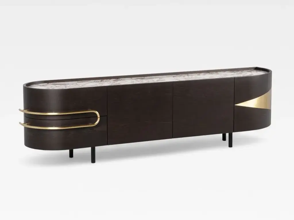Olival is a sideboard. A sacred symbol of ancient Greece, Olival embodies the resilience and longevity of the olive tree. A piece built to last forever, to be passed down from one generation to the next. An elegant sideboard in American oak veneer with a top in Calacatta Viola marble that draws the eye of everyone who enters the room. The rich and striking burgundy veins of the Calacatta Viola marble contrast with the beautiful, brushed brass metal inlays and handles.Materials & FinishesWD026 American oak; open-pore dark brown stained; matt finishME006 Brushed brass; high-gloss finishST043 Calacatta Viola marble; polishedFI007 Black lacquer; satin finishEL001 LED light strip