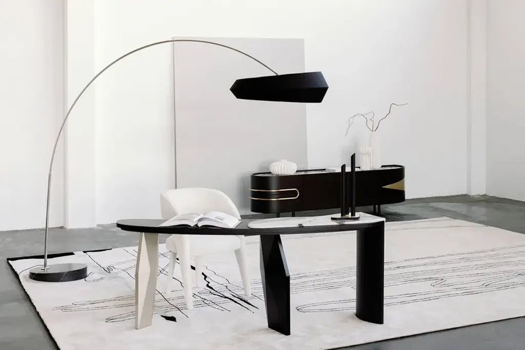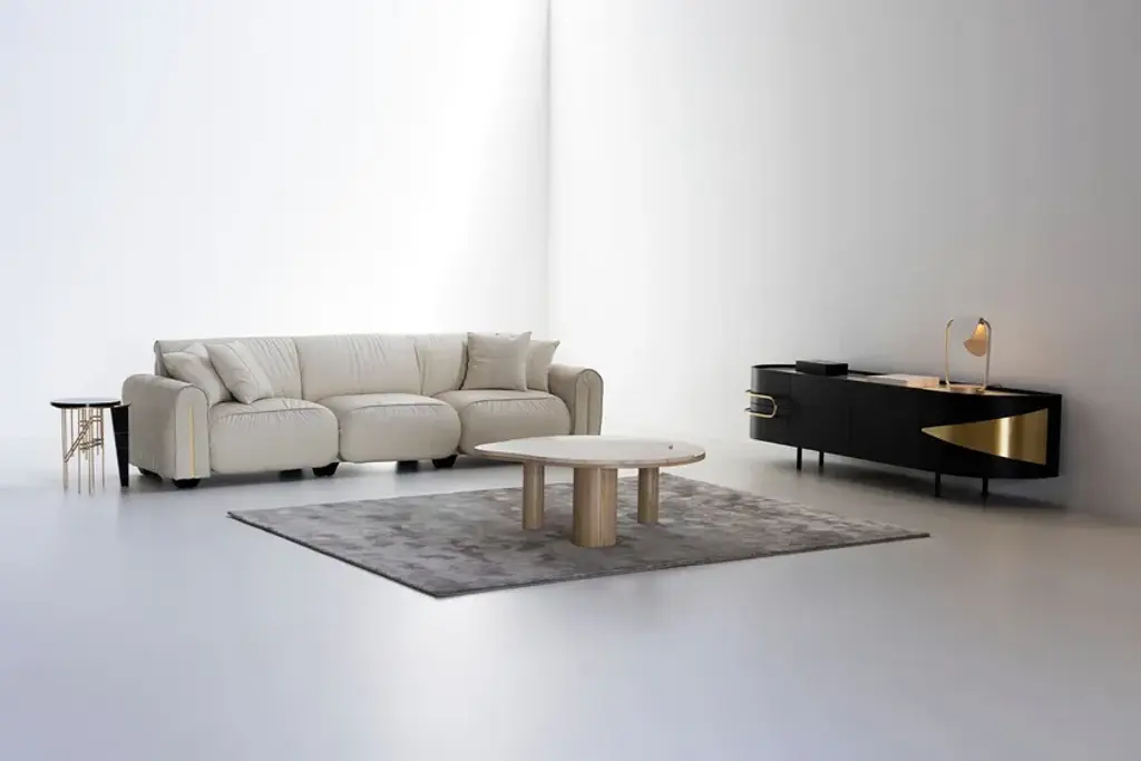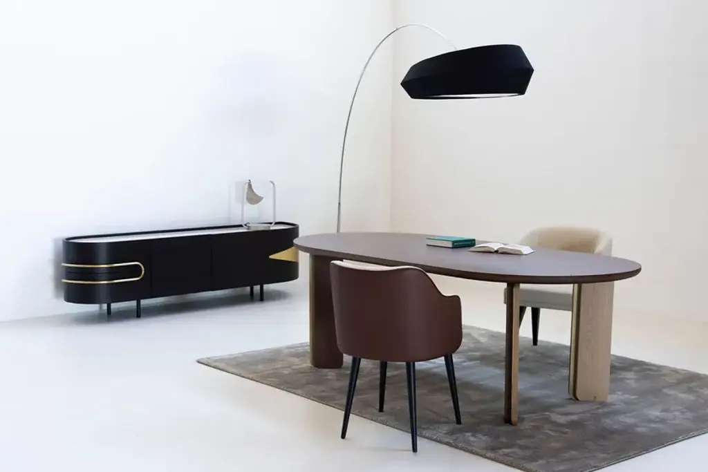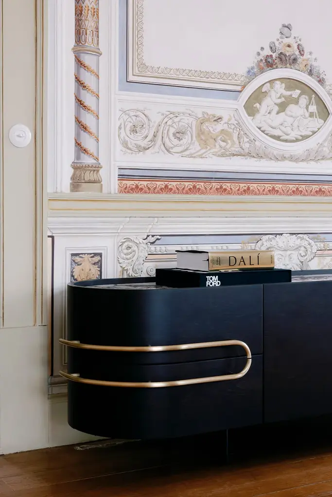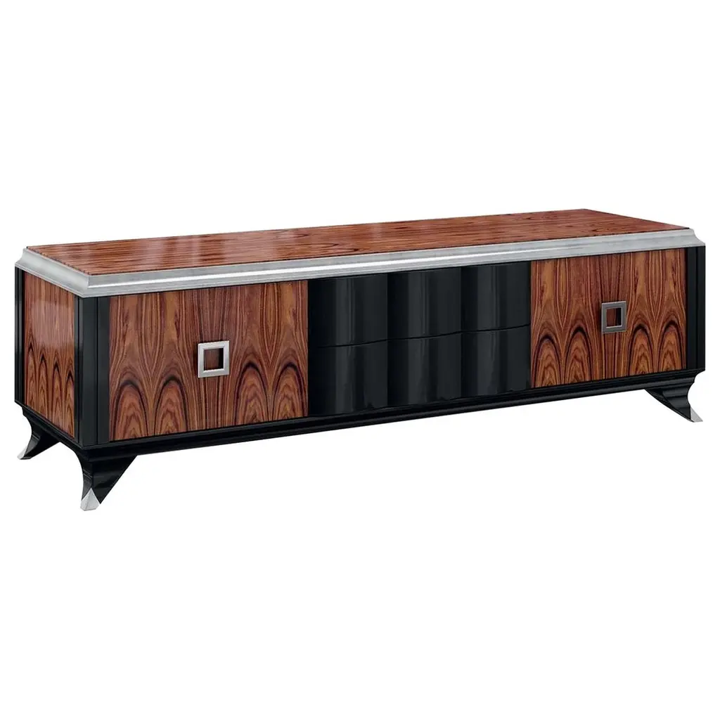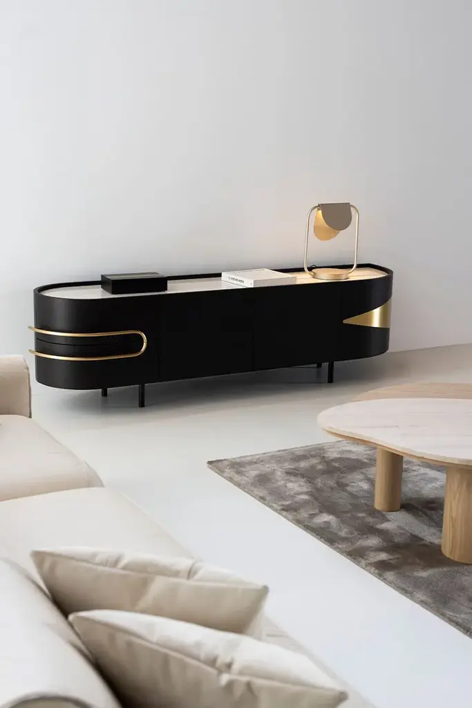 Olival is a sideboard. A sacred symbol of ancient Greece, Olival embodies the resilience and longevity of the olive tree. A piece built to last forever, to be passed down from one generation to the next. An elegant sideboard in American oak veneer with a top in Calacatta Viola marble that draws the eye of everyone who enters the room. The rich and striking burgundy veins of the Calacatta Viola marble contrast with the beautiful, brushed brass metal inlays and handles.Materials & FinishesWD026 American oak; open-pore dark brown stained; matt finishME006 Brushed brass; high-gloss finishST043 Calacatta Viola marble; polishedFI007 Black lacquer; satin finishEL001 LED light strip