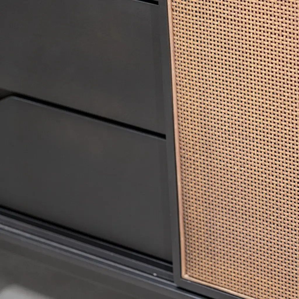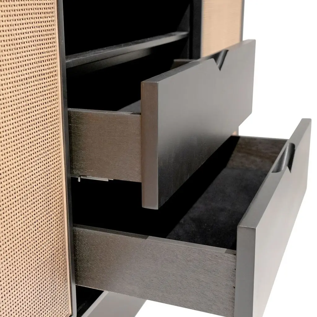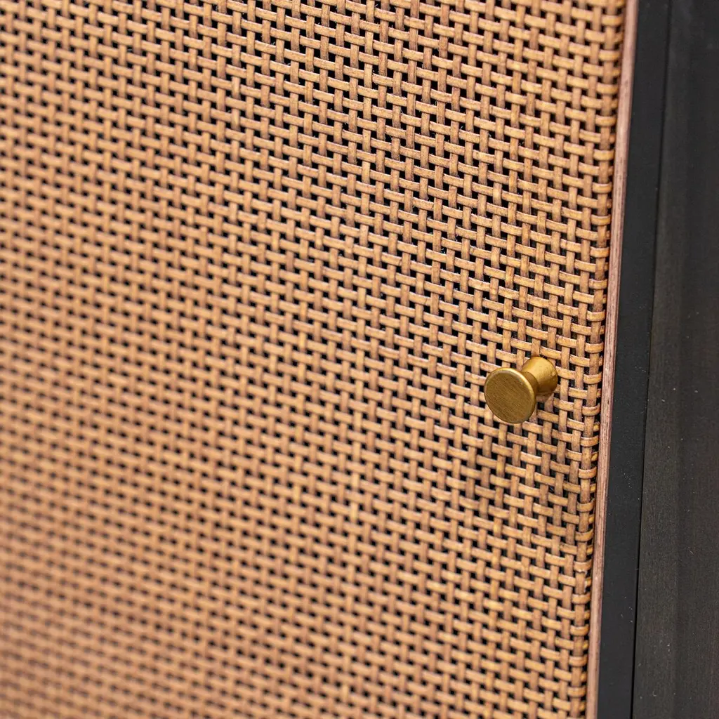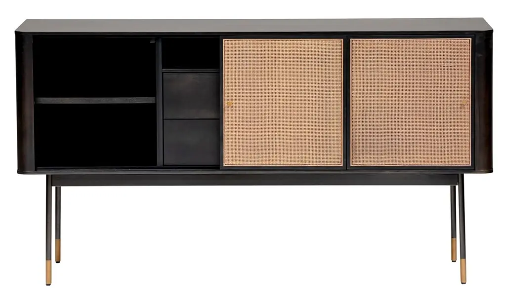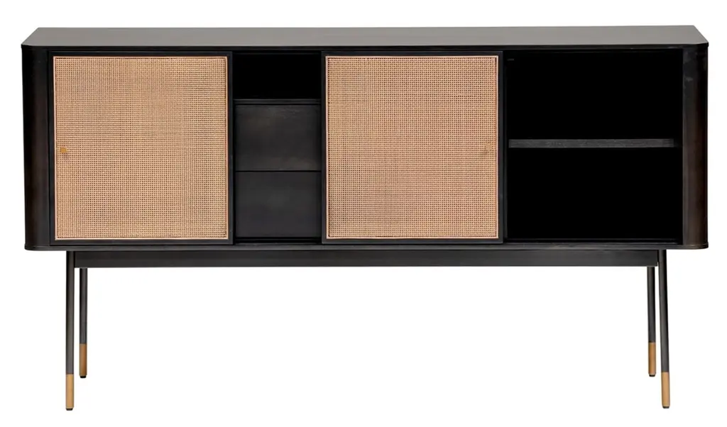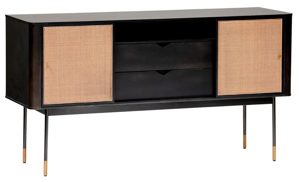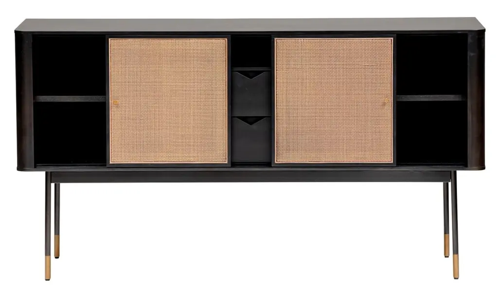 Fans of contemporary design will be drawn to the minimalist silhouette and the black-and-bronze steel legs of this sideboard. Those who gravitate toward natural materials will love the woven rattan fronts of the two sliding doors. And just about everyone will appreciate the ample storage space provided by the two center drawers and the shelves behind the doors.