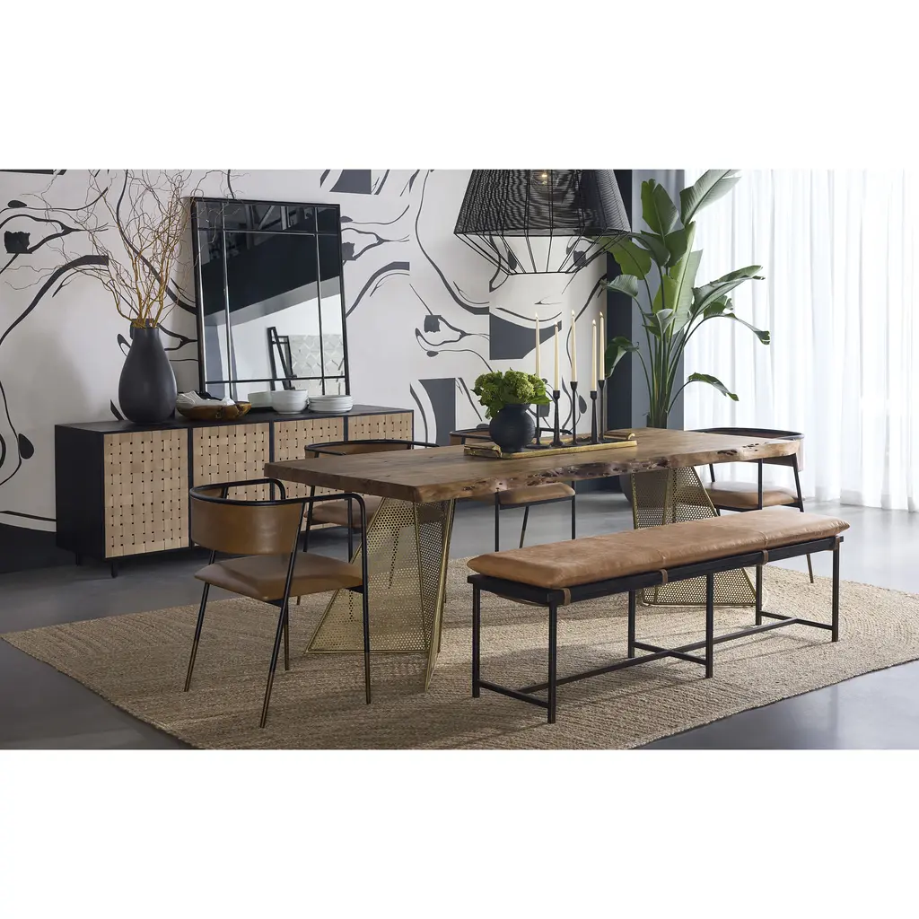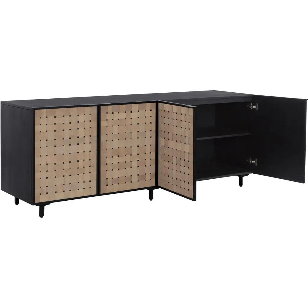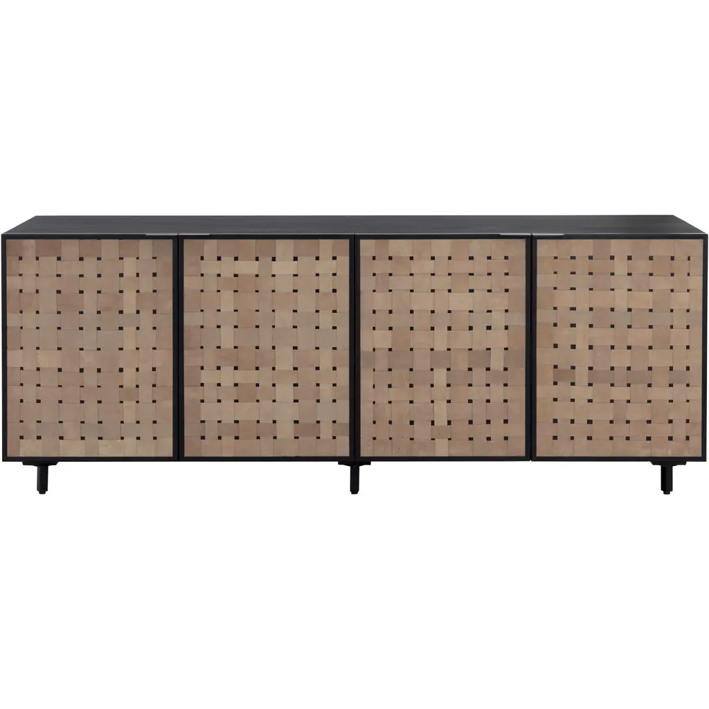 This elevated sideboard offers ample storage and unique style. Features a weaved design in sueded light tan leather and finished with a matte black wood base. Handle with Care: This design has been crafted with 100% leather. Leather is a natural material as such, colour variations, markings, wrinkles, grooves and light scratches are acceptable and appreciated characteristics. No two pieces are alike. Visit our Product Care page for more information on how to ensure the lasting beauty of this piece. Made in India. With refined craftsmanship, this design was brought to life by skilled local artisans. Due to the nature of handcraftsmanship, unique imperfections such as fissures, markings and variations in colour and shape are welcomed and appreciated characteristics for a truly one-of-a-kind piece. As wood is an organic, porous material, these pieces will contain natural variation of texture and may also exhibit fine indentations and cracks. Wood pieces will also display a disparity of colour and grain, and visible knots and burls that add to the character of each piece.