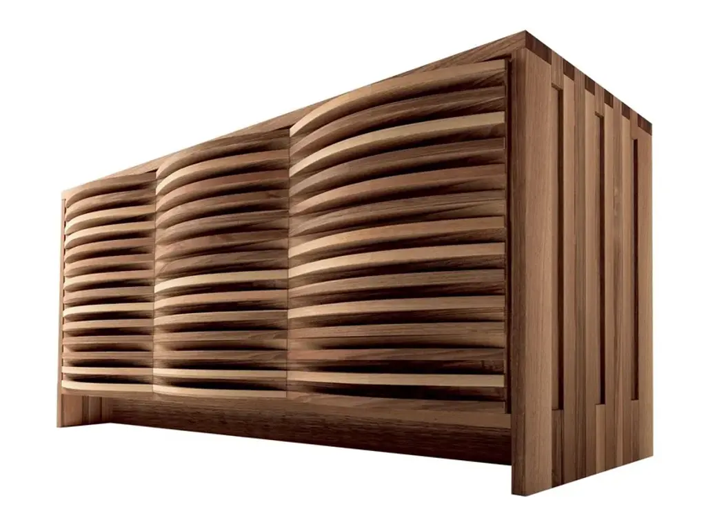 By keeping a keen eye on the evolution of design, adopting and fine-tuning modern manufacturing techniques, and selecting the very finest wood and other raw materials. Dale Italy creates furnishings that guarantee the highest standards of quality, in keeping with true Italian tradition, where style, taste and artistry are non-negotiable values. In this model, innovatively designed concave doors transform the sideboard, highlighting the natural look of walnut. Frame in solid canaletto walnut. Available in three-door version with two internal compartments and glass shelves. Doors in solid walnut.Sideboard A-120 • Door ORIGINE • Colour Natural walnut• Finishing Oil