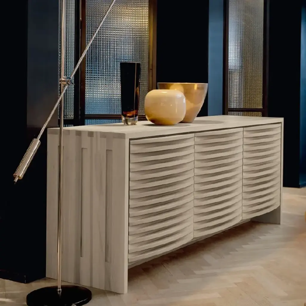 This impressive sideboard features clean, essential lines that offer timeless stylistic elegance in an enticing interplay of light and shadow. Frame in solid canaletto walnut. Available in three-door version with two internal compartments and glass shelves. Doors in solid walnut.Sideboard A-620 • Door ORIGINE • Colour Natural grey walnut• Finishing Oil
