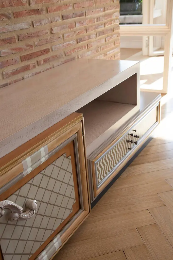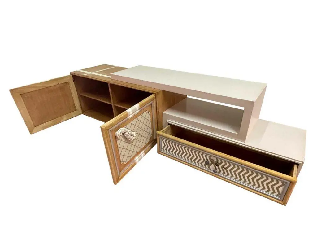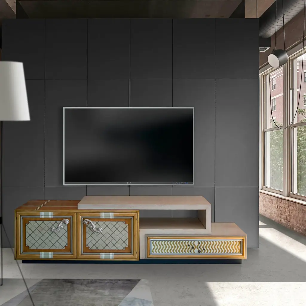 One Sideboard, Two Doors and One Drawer, by Lola GlamourDimensions: D 48 x W 225 x H 60 cmMaterials: Wood.The One series is equal parts creation and fun. With its box structure, it is designed for each person to design their own custom furniture. Combine its different modules in infinite possibilities, both aesthetic and utilitarian, to obtain unique solutions for your home or business. A delicate play of volumes and textures, colors and patterns, motifs, sizes and handles, with as many finishes as you can imagine. We put our skills at your service, and if you need help with composition, we can also advise you to have a unique piece with its own idiosyncrasy.We are Félix and Désirée Ramos, brothers and product designers of our brand, Lola Glamour.We are interested in the singular, the different, the beauty, and the balance of color and materials. We have the ability to observe and the ability to translate any beautiful object into a piece of furniture.We are proud of having created our own style, a way of understanding design, which allows us to tell stories and connect with the souls of people and spaces.Lola Glamor is a Spanish company from Soria, which has designed and manufactured unique furniture in noble woods, with artisanal construction and extraordinary finishes since 1995. Artistic furniture that is customized in size and finish according to the client's needs.We offer original furnishing solutions for professionals and individuals from any country in the world, mixing materials, volumes, motifs, and colors that achieve their own style.We are, above all, the sum of a team of people who contribute their dedication and commitment to a unique level of demand, detail, and quality.