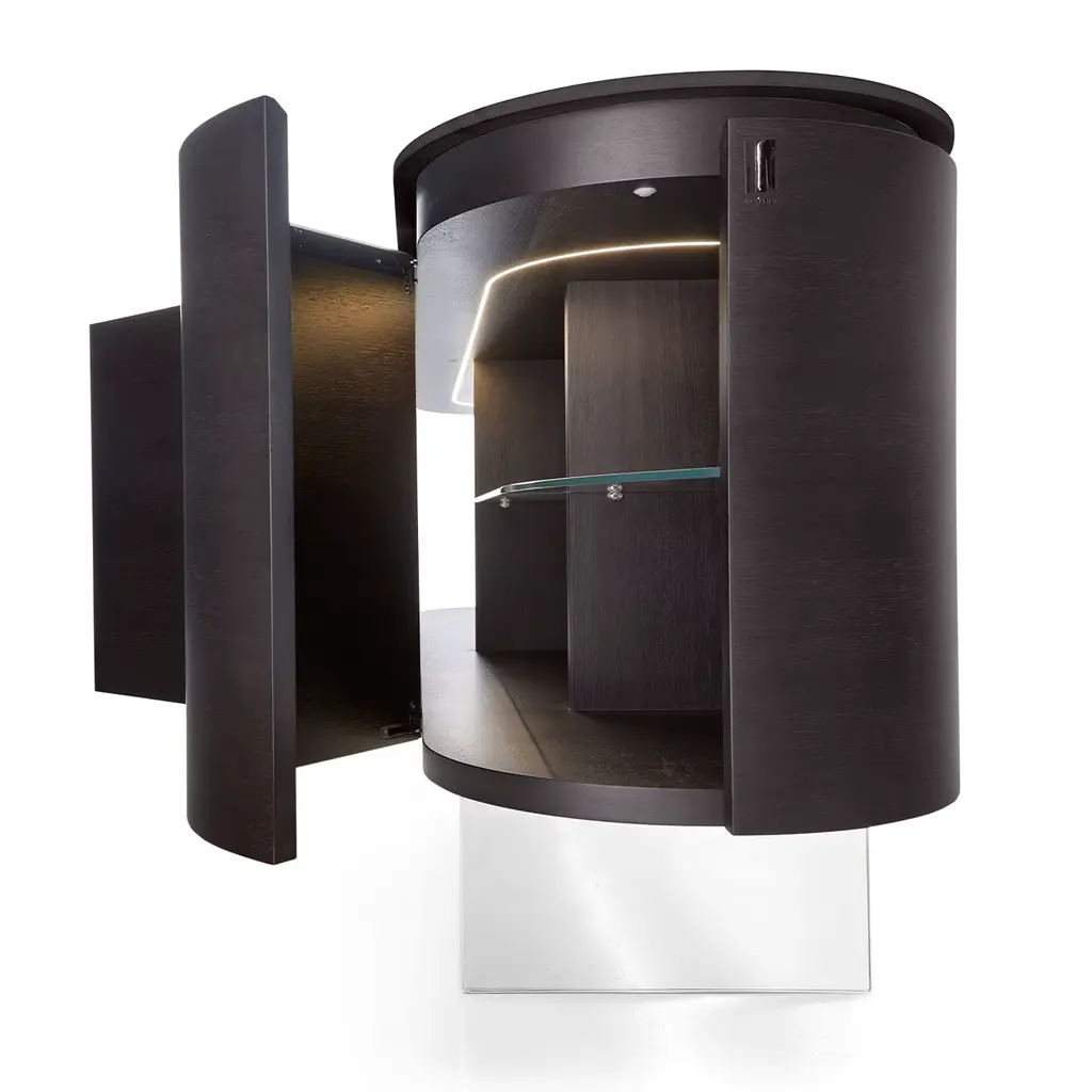 The Opera Sideboard showcases a Canaletto walnut body with an intricate herringbone veneer, treated with a chocolate-toned eco-friendly water-based finish. Topped with Wood, its refined surface exudes sophistication, while transparent glass feet with integrated LED lighting add a weightless quality. Featuring four doors for ample storage, this sideboard is both functional and visually striking, designed to elevate living or dining spaces. Internal LED light available upon request.