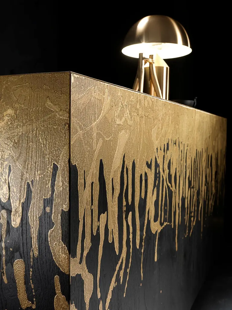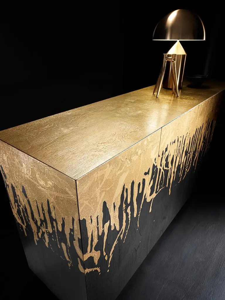 Oro Colato Credenza by Francesco ProfiliDimensions: W 200 x D 50 x H 95 cm Materials: Plywood veneered with oakThis piece of furniture is more than just a simple furnishing accessory; it is an authentic work of art that will capture the gaze and admiration of anyone entering your home. The true uniqueness of this sideboard lies in its extraordinary gold lacquer. Applied masterfully by craftsmen, the lacquering is done in such a way as to resemble a cascade of gold naturally flowing over the furniture. This process creates a luxurious and refined effect, making each piece unique, thanks to the natural fusion of gold with wood.Francesco ProfiliThe inspirations and artistic creativity of Francesco Profili have an almost genetic nature, they were born and developed in the family-run carpentry shop, where he breathed the wood-working and absorbed the secret experiences and tricks of the masters, his father and grand-father.An innate practicality and a privileged viewpoint on the matter that takes form, makes him create his first (much needed) objects: a desk and the furniture for his work.This is his first foray in the profession, continued in his school formation in the artistic lyceum section of Arte, Architettura e Arredamento.Many personal travels and many creative contaminations help shape its vision and its personal concept of design.The philosophy of Francesco Profili and of its work is crafted by this conceptual and more importantly practical experience, and is pursued in the research of high-quality, authentic fine materials: create objects to impress, take the breath away.The concept of hand crafted works, the summit of an artisan craftsmanship, marry the highest standards of the Made in Italy concept. He was selected for the International & Design Awards thanks to its “Across the Universe” table. The table is created for clients with a refined taste, that seek to shape their living space with elegance and prestige.Quality and design, aesthetics and functionality, innovation and the artisanal culture: the founding concepts of a life work that seek to distinguish itself and remain timeless, crafted by Francesco Profili.