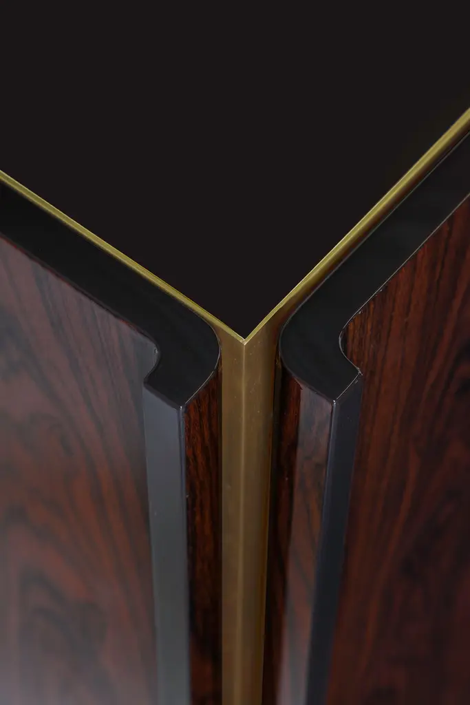 Oscar credenza is a combination of Modern lines and contemporary design challenges, for an imposing and sophisticated design to your home.It is all covered on the sides with exclusively selected Brazilian wood veneers which in all corners are twisted, revealing its "internal" secret: brass like, golden lines and details. The top and internal structure is all lacquered. A huge amount of handmade details and treatments in the wood and metal. It was launched during the Milan Design Week in 2015. Lacquer paint, metal components, and LED system are all of Italian highest quality.