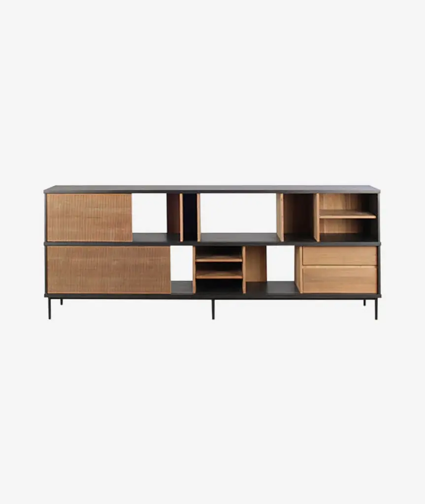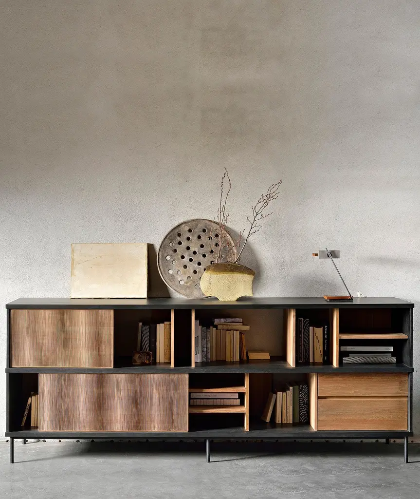 The Oscar sideboard by Alain van Havre is the perfect multi-tasker: its open spaces can be used to exhibit personal objects, whereas the sliding doors offer the option of organizing documents out of sight. Notice the exceptional grooves in the doors: each narrow groove was carefully hand carved, making every Oscar piece unique.