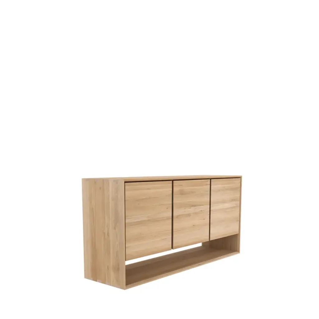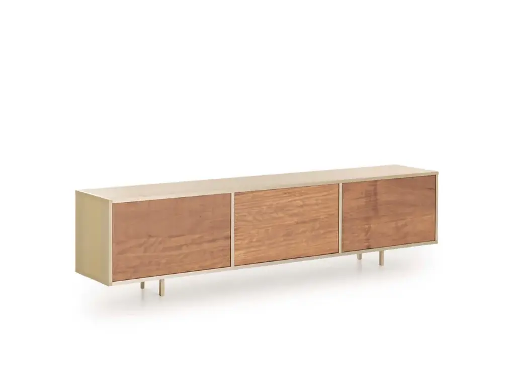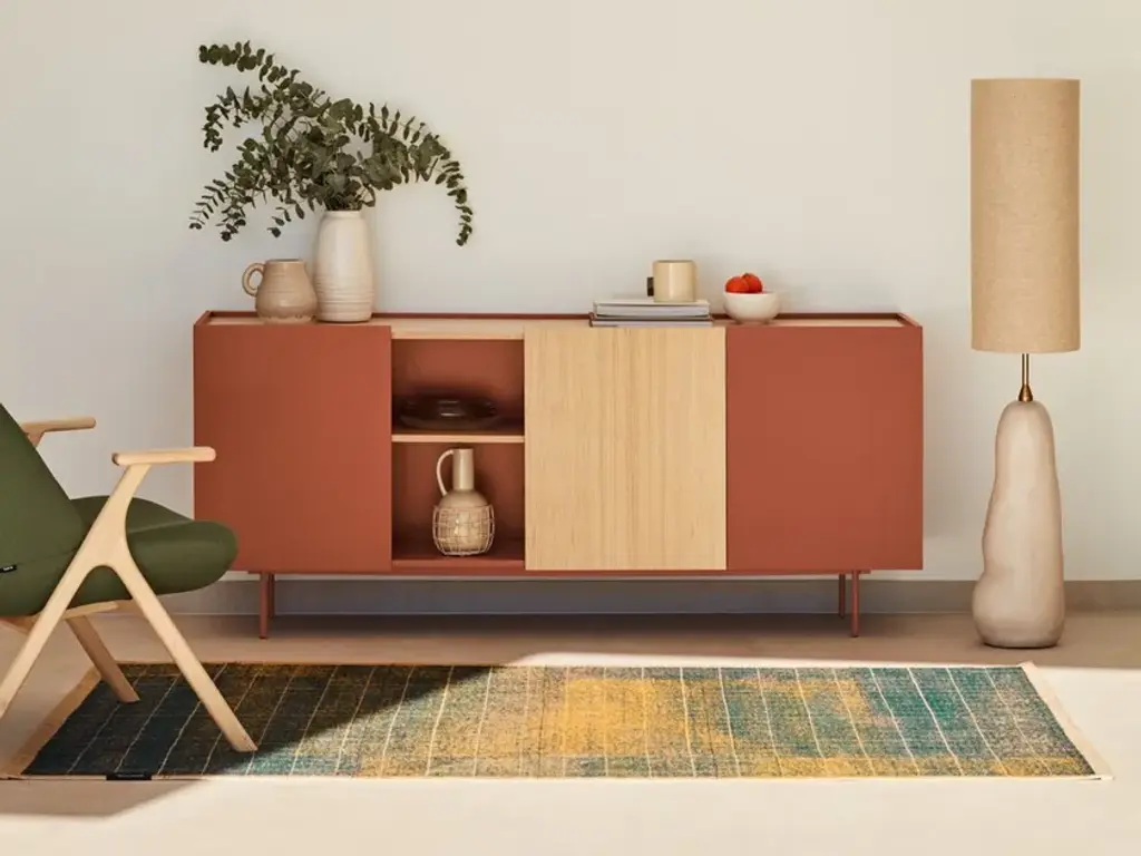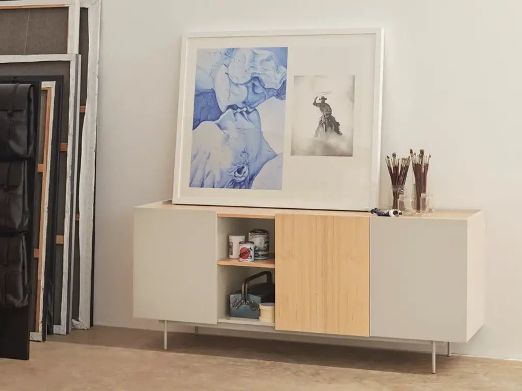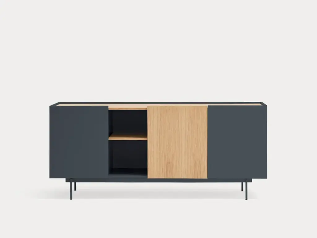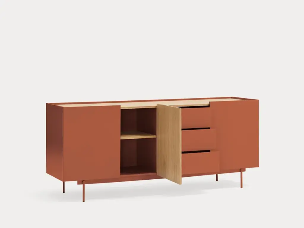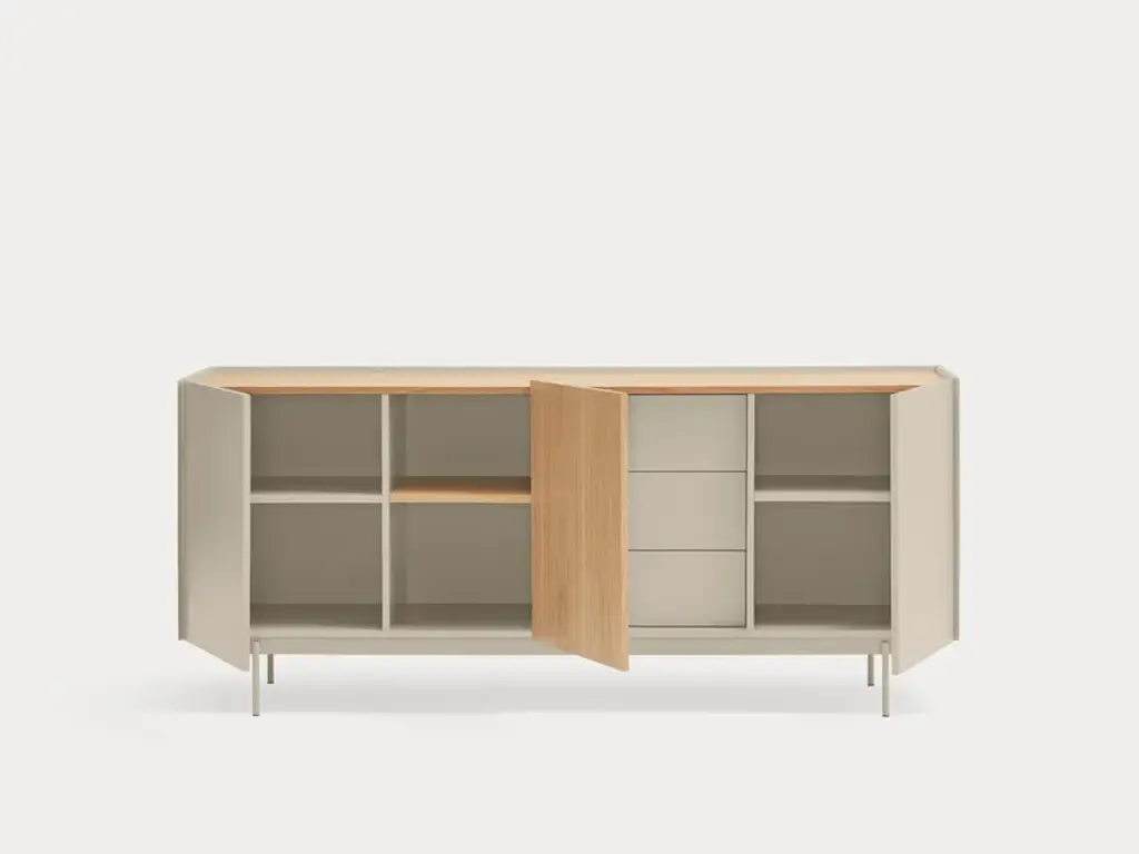 Otto is a lacquered MDF sideboard with three swing doors, three drawers, storage compartments, and legs in painted steel.Otto is distinguished by a modern style with clean lines, in which color is combined with natural veneer accents, allowing it to adapt to a wide variety of spaces. Its design incorporates various storage configurations, giving it greater versatility and providing rhythm and dynamism to its structure.