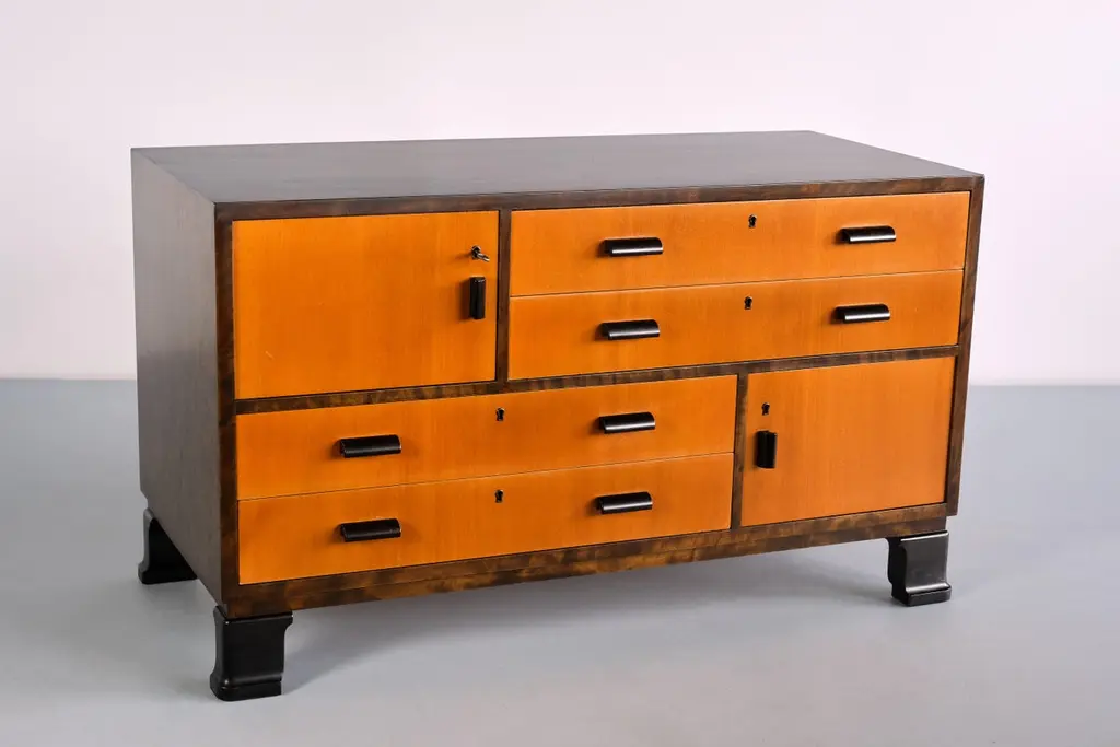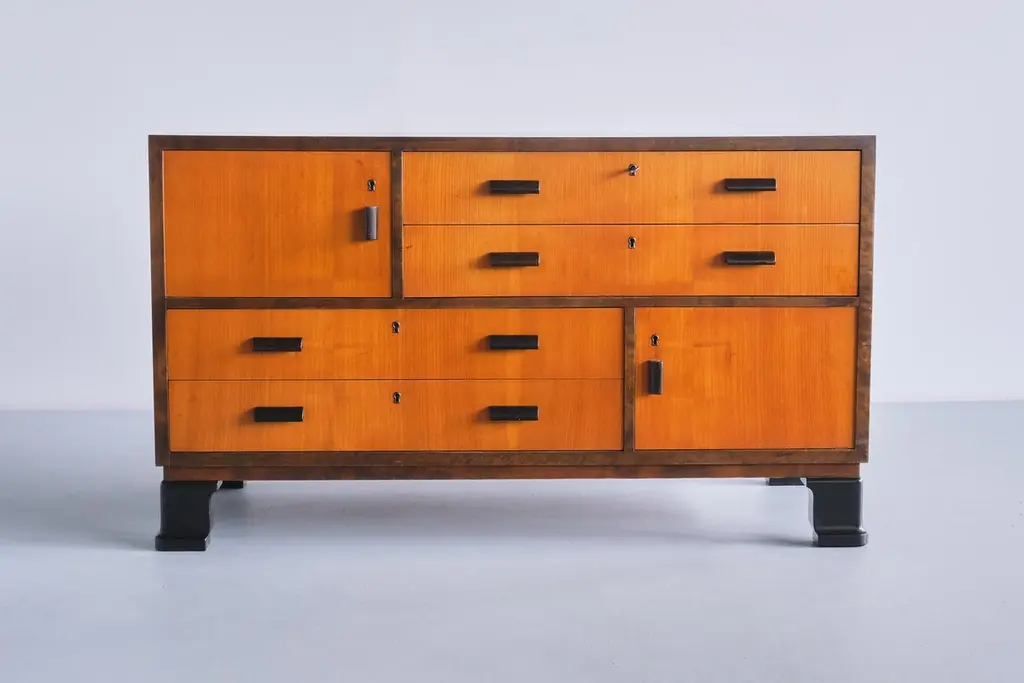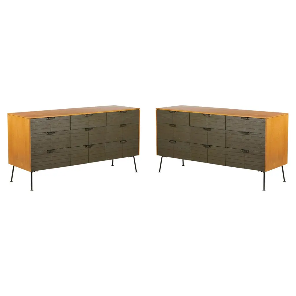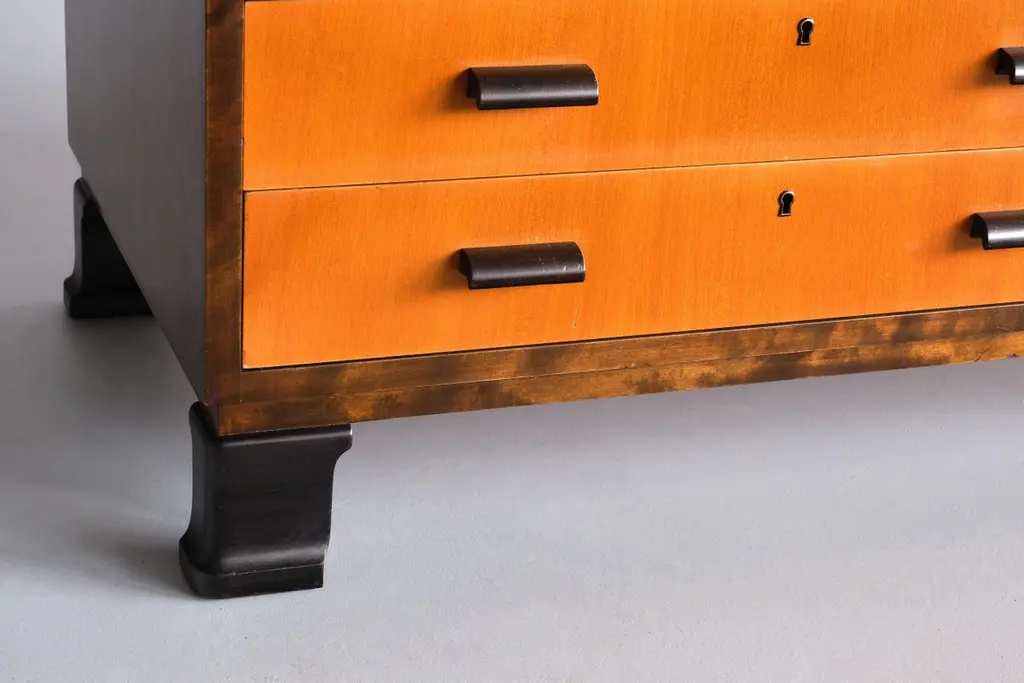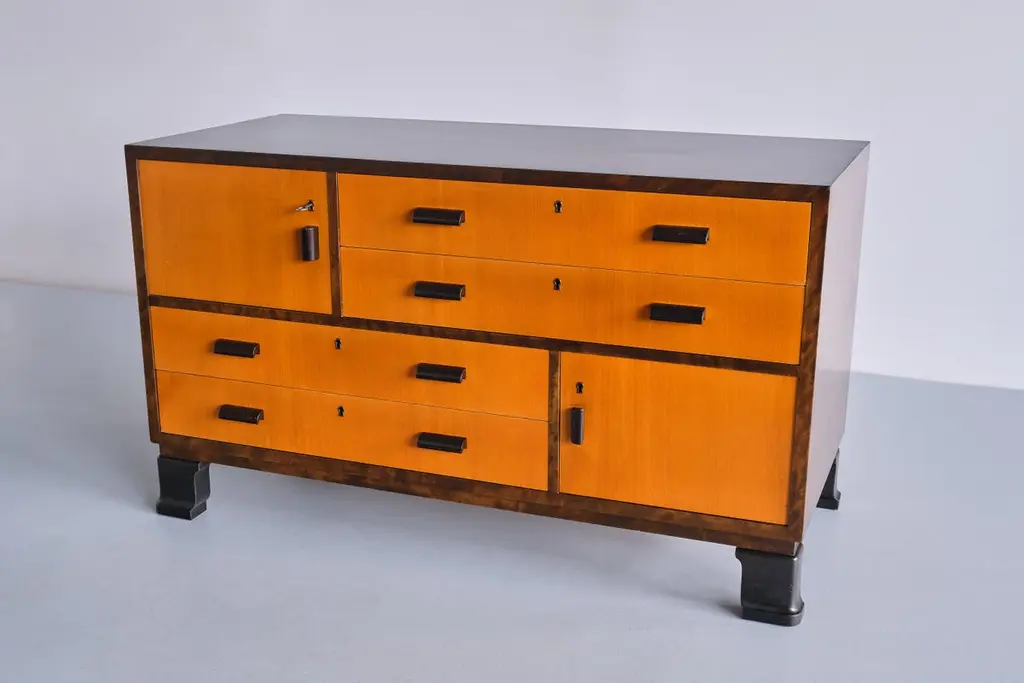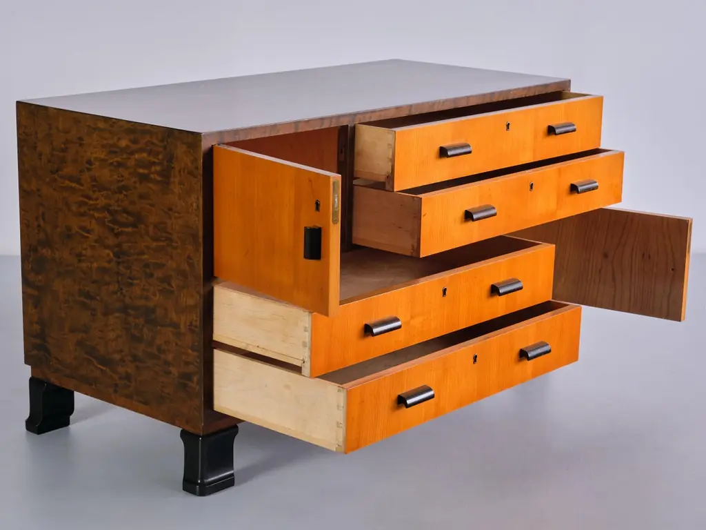 This rare pair of sideboards/ chests of drawers was designed by the Swedish designer Axel Larsson. They were produced by SMF Svenska Möbelfabriken in Bodafors, Sweden in the 1940s. The pieces are marked with the manufacturer's company plate.The design is marked by the elegant front composed of four pull out drawers and two single doors in a striking symmetrical composition. The front is executed in veneered elm wood, with the handles in a solid dark stained birch. The four legs in bracket style are also in the darker stained birch wood. The top, sides and the front moldings are in a veneered birch wood with a beautiful, flamed wood grain.The dimensions of the piece make it a versatile design, suitable for usage in a variety of rooms. It can function as a pair of small sideboards or as a low commode/chest of drawers.The pair is in very good, restored condition with minor wear consistent with age and use. Please note the listed price is for a single piece.