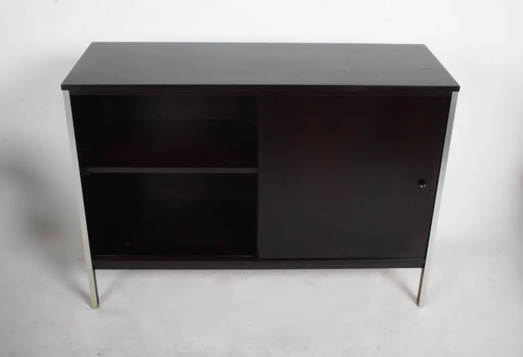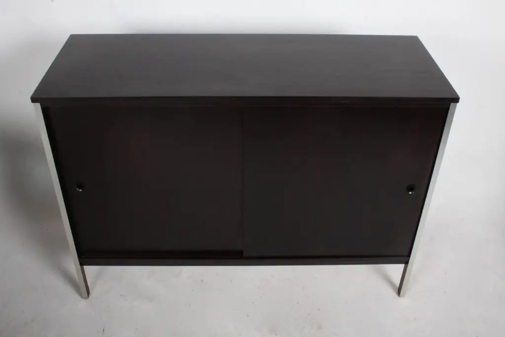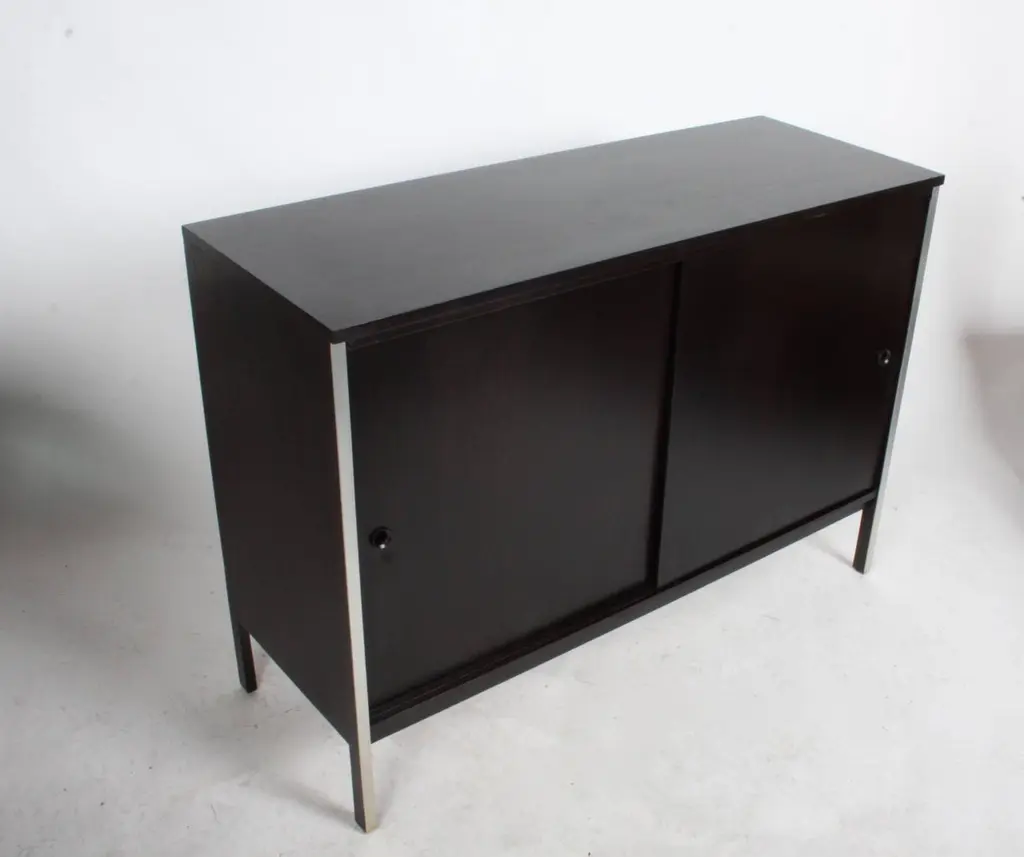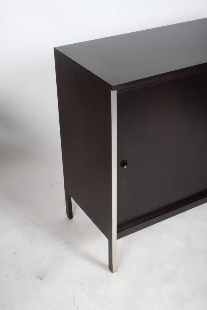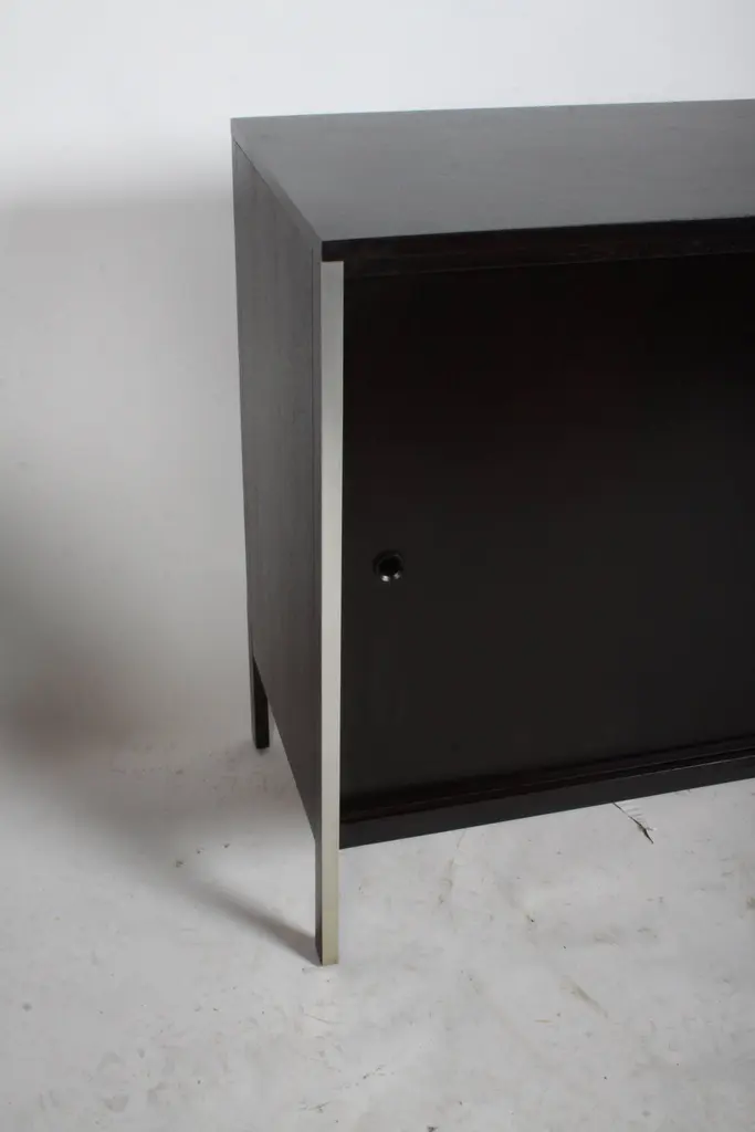 Pair of Paul McCobb for Calvin credenza refinished in dark espresso with sliding doors and aluminum trim. Each side has an adjustable shelf, shelf size is 23" W x 15.75" D. There are two available. Only one has been refinished so far, so custom color is available for the second. Sold individually.