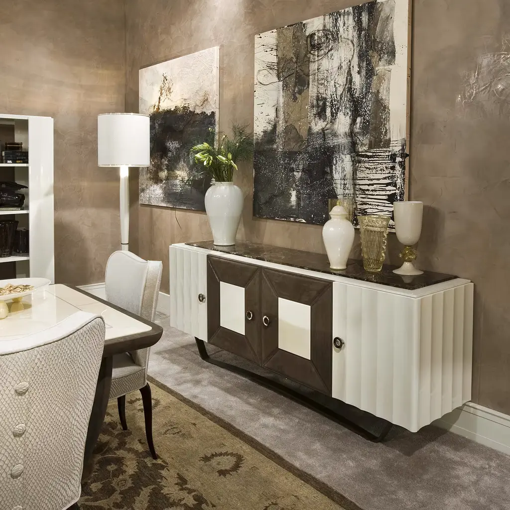 This sideboard is defined by a modern aesthetic in which the combination of material and finishes - glossy lacquer wood and soft leather - enhances its essential design. The structure is made of white lacquered wood with an undulated surface and is supported by a curved base made of two bronzed metal slats. The two central doors showcase a large frame crafted of brown leather around a white square tile. A stunning brown marble slab with ivory veining rests atop the piece, adding the ultimate sophisticated touch.