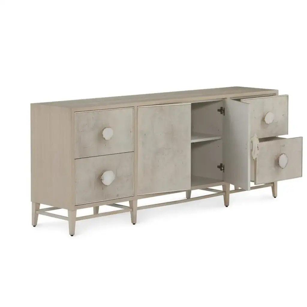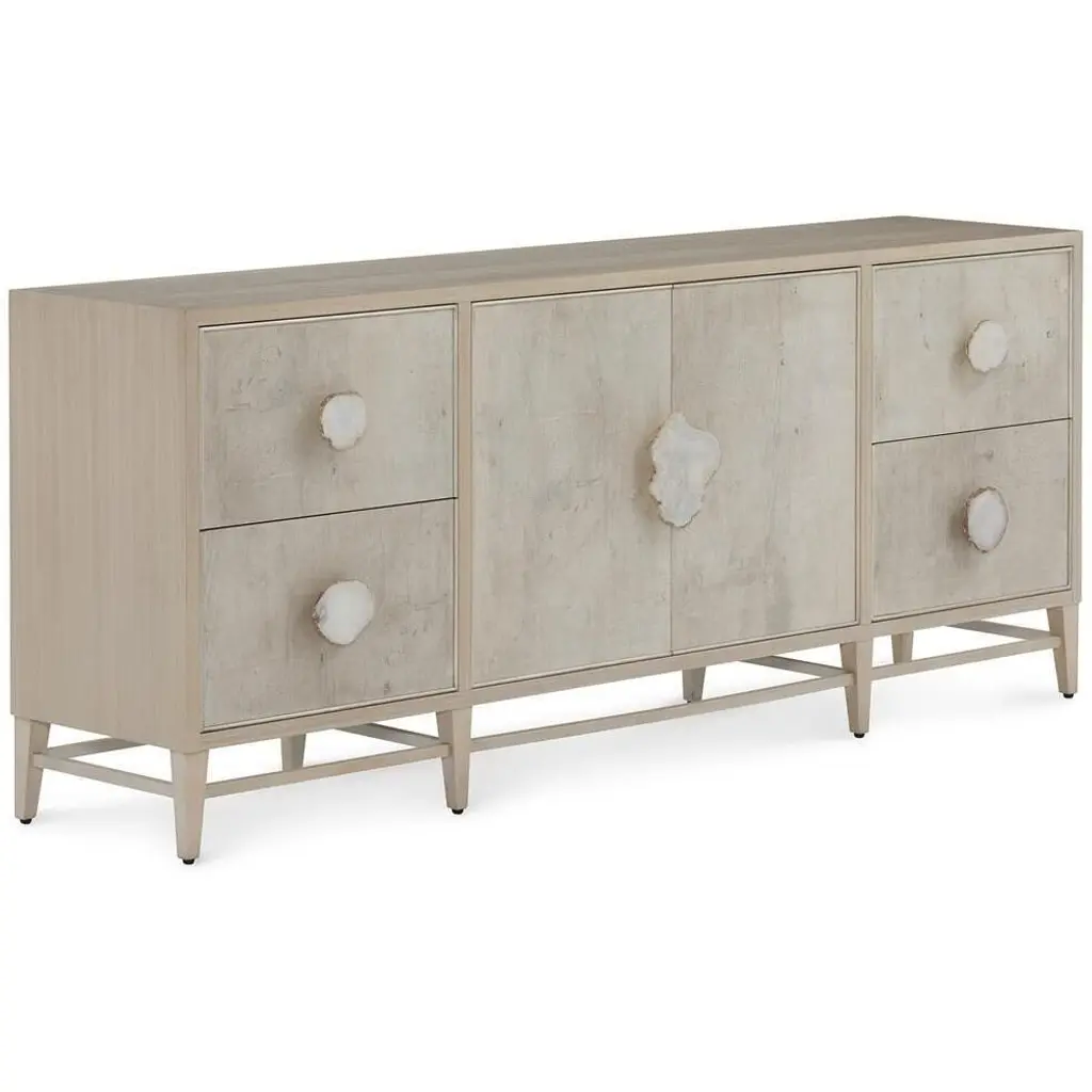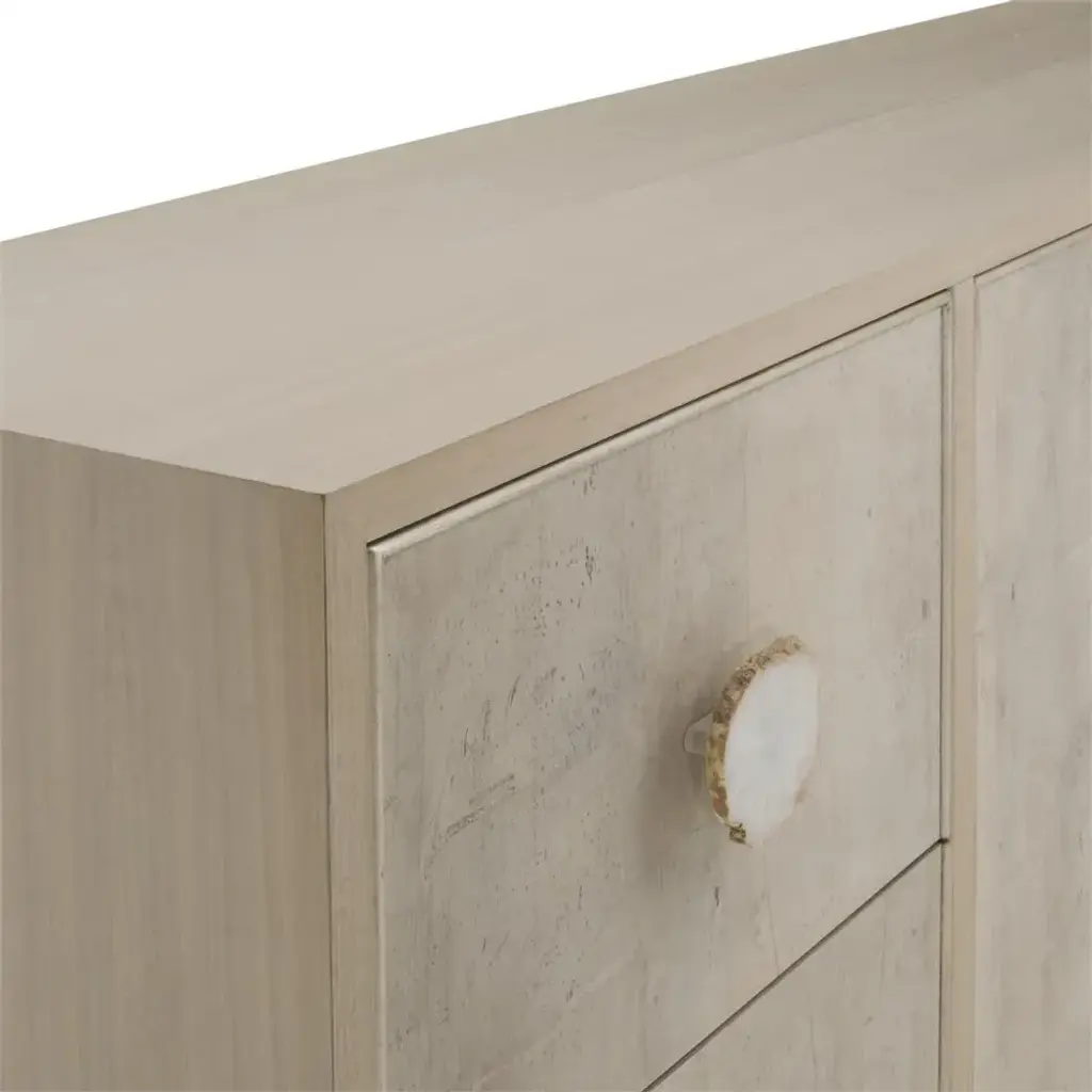 The Paradis Sideboard showcases an innovative blend of natural materials and contemporary design. Crafted from beech wood with a beautiful tiza gesso finish, the piece features four drawers and two cabinet doors affixed with handles of white agate slices. Stunning silver accents line the facade, contributing a tasteful sense of opulence.