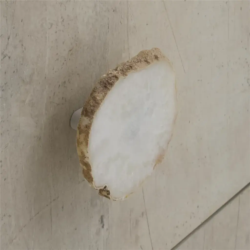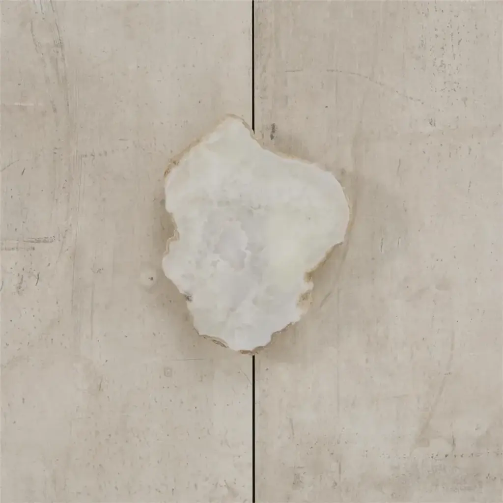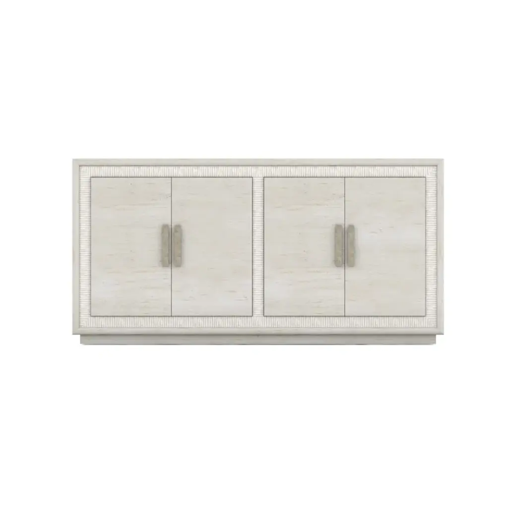 The Paradis Sideboard showcases an innovative blend of natural materials and contemporary design. Crafted from beech wood with a beautiful tiza gesso finish, the piece features four drawers and two cabinet doors affixed with handles of white agate slices. Stunning silver accents line the facade, contributing a tasteful sense of opulence.