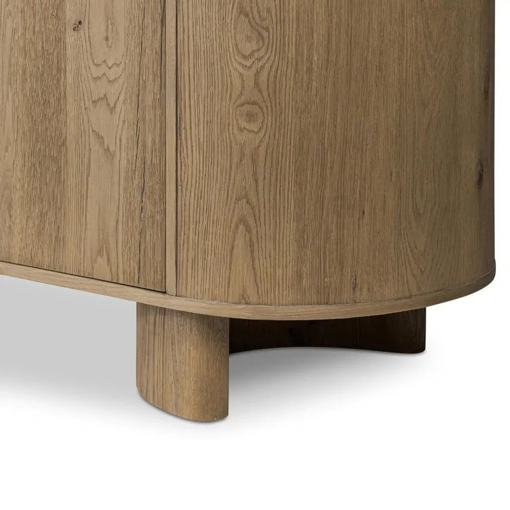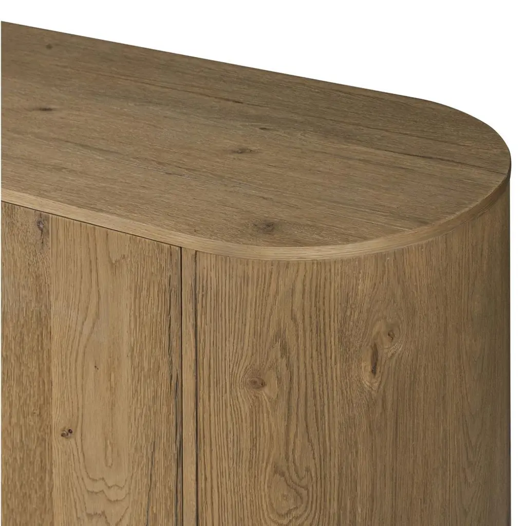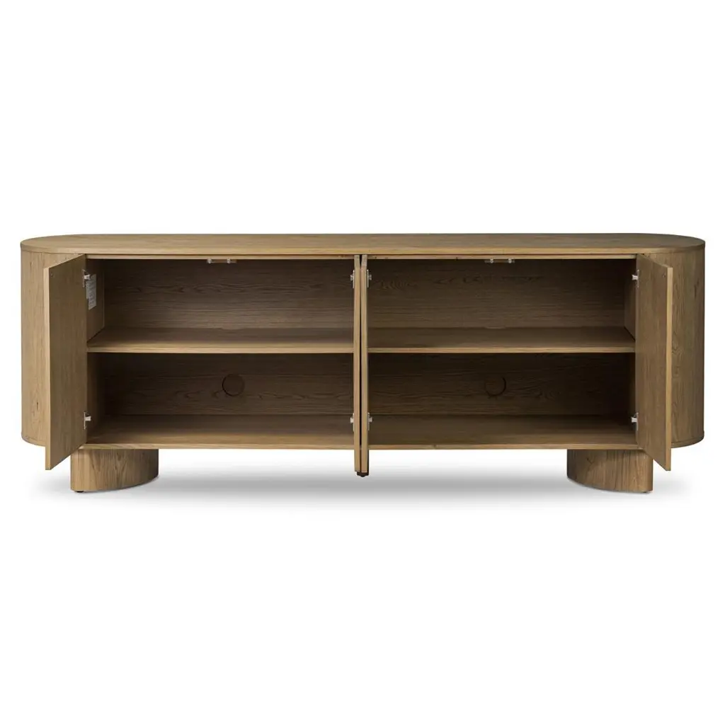 Expertly crafted from oak and beautifully finished in light brown, the Paris sideboard features an oval-shaped silhouette with sculptural curvature. Four push-latch doors sit flush with the frame, opening to a spacious interior with plenty of room for dishes, linens, and other household essentials.