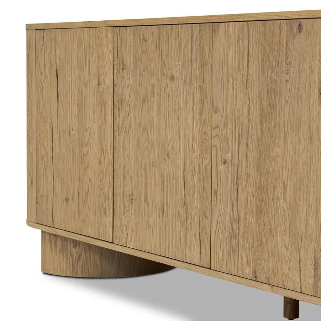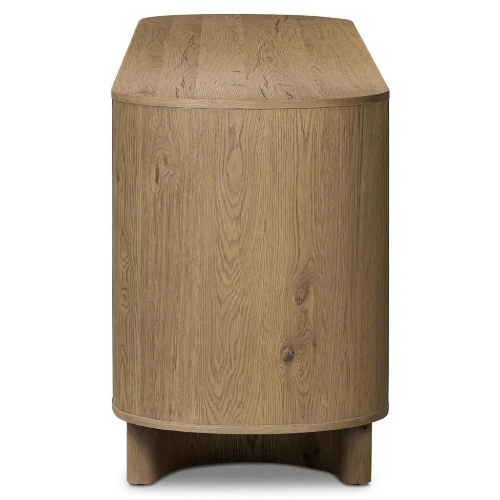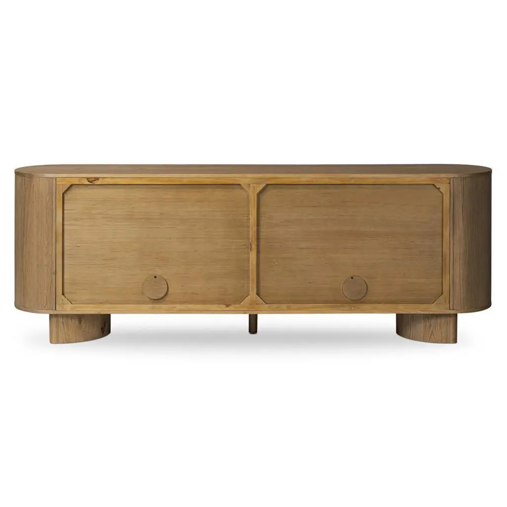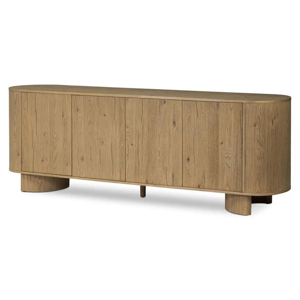 Expertly crafted from oak and beautifully finished in light brown, the Paris sideboard features an oval-shaped silhouette with sculptural curvature. Four push-latch doors sit flush with the frame, opening to a spacious interior with plenty of room for dishes, linens, and other household essentials.