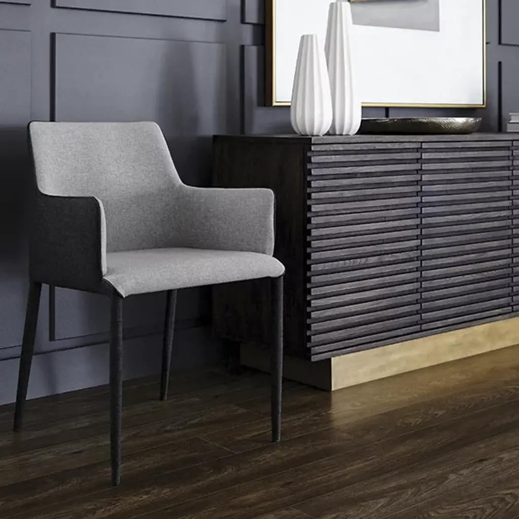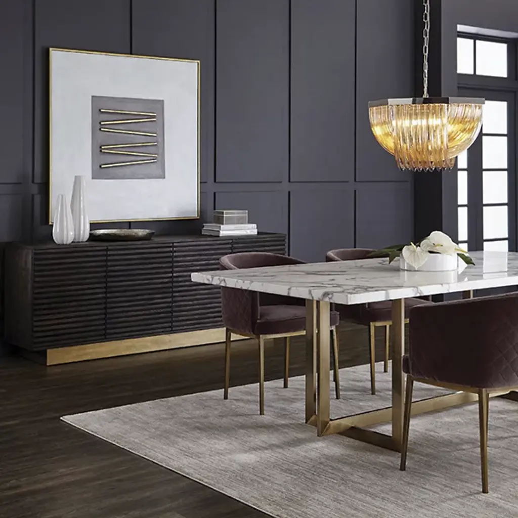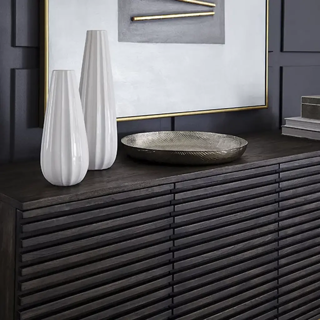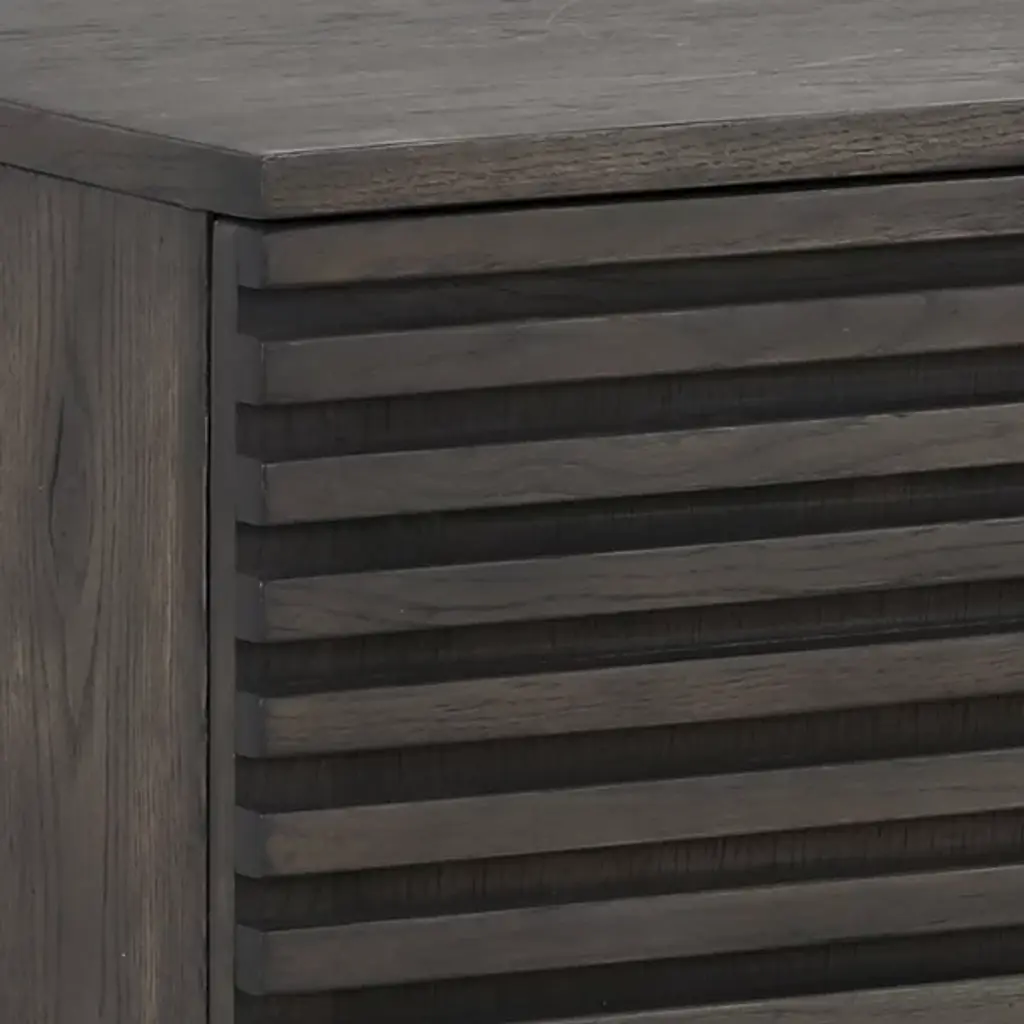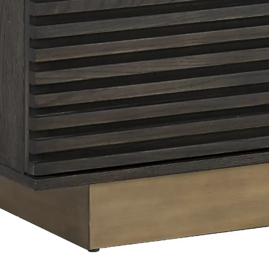 The Paris Sideboard from Sunpan brings layered elegance to dining and living spaces. Made with oak veneer, its four sizeable paneled cabinet doors show off horizontal grooves that add texture and charm to the otherwise smooth construction. Inside, generous shelving provides ample storage for your essentials. The distressed finish features natural cracks and dents, celebrating its rustic character, while an antique brass-finished steel base adds a luxurious touch. Versatile and sophisticated, this piece beautifully complements mid-century modern and contemporary interiors.