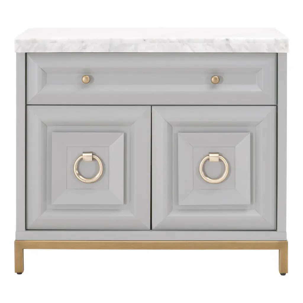 Introducing our stunning Calypso collection. A modern compilation of stunning cabinets, and sideboards. Composed of bright, decorative finishes over MDF wood construction these fabulous pieces exude glamour. These contemporary pieces are ideal for any entry way, dining, living or bedroom. Assemble Size W59"XD15.25"XH35.5" Each Panel W20.5"XD0.75"XH8.25" Door Knob R1.25, Drawer Inside W18.5"XD11"XH5" LegH 7.5" Leg Thick 1" Wood Finish & Gold Metal Frame Adjustable Leg Supports: The taps under the cabinet legs can be adjusted to ensure the doors stay properly aligned, even on uneven surfaces.