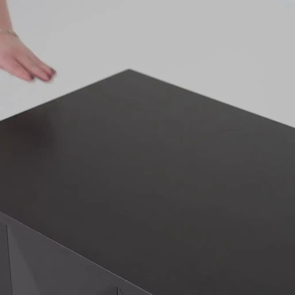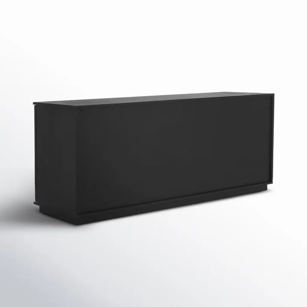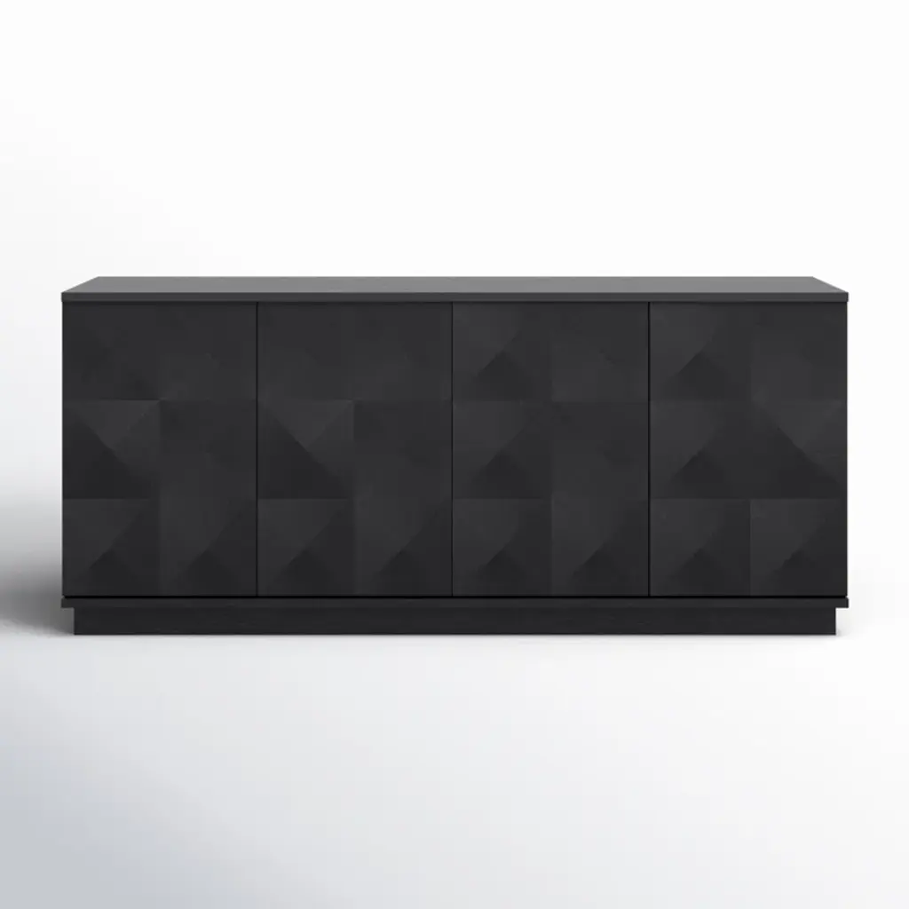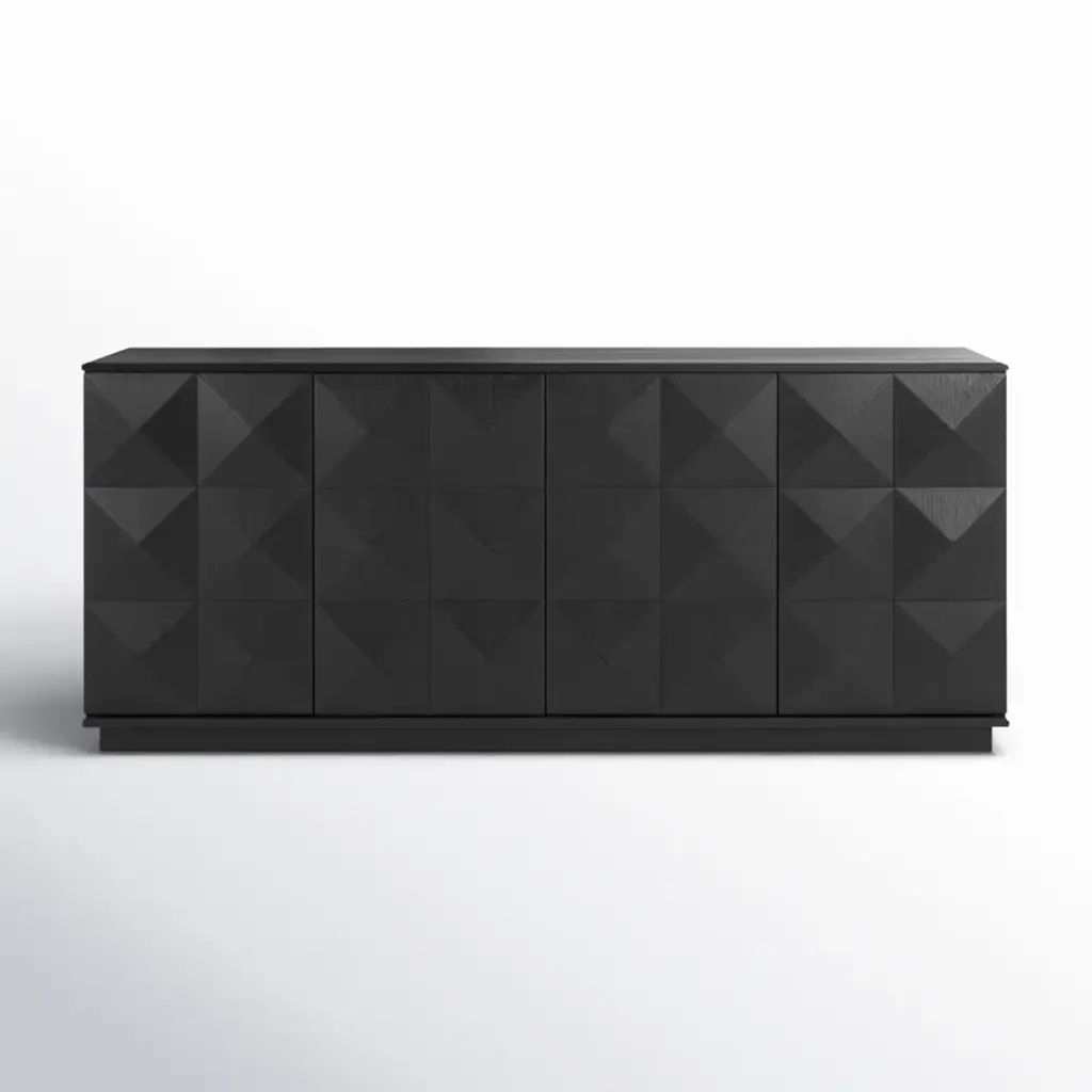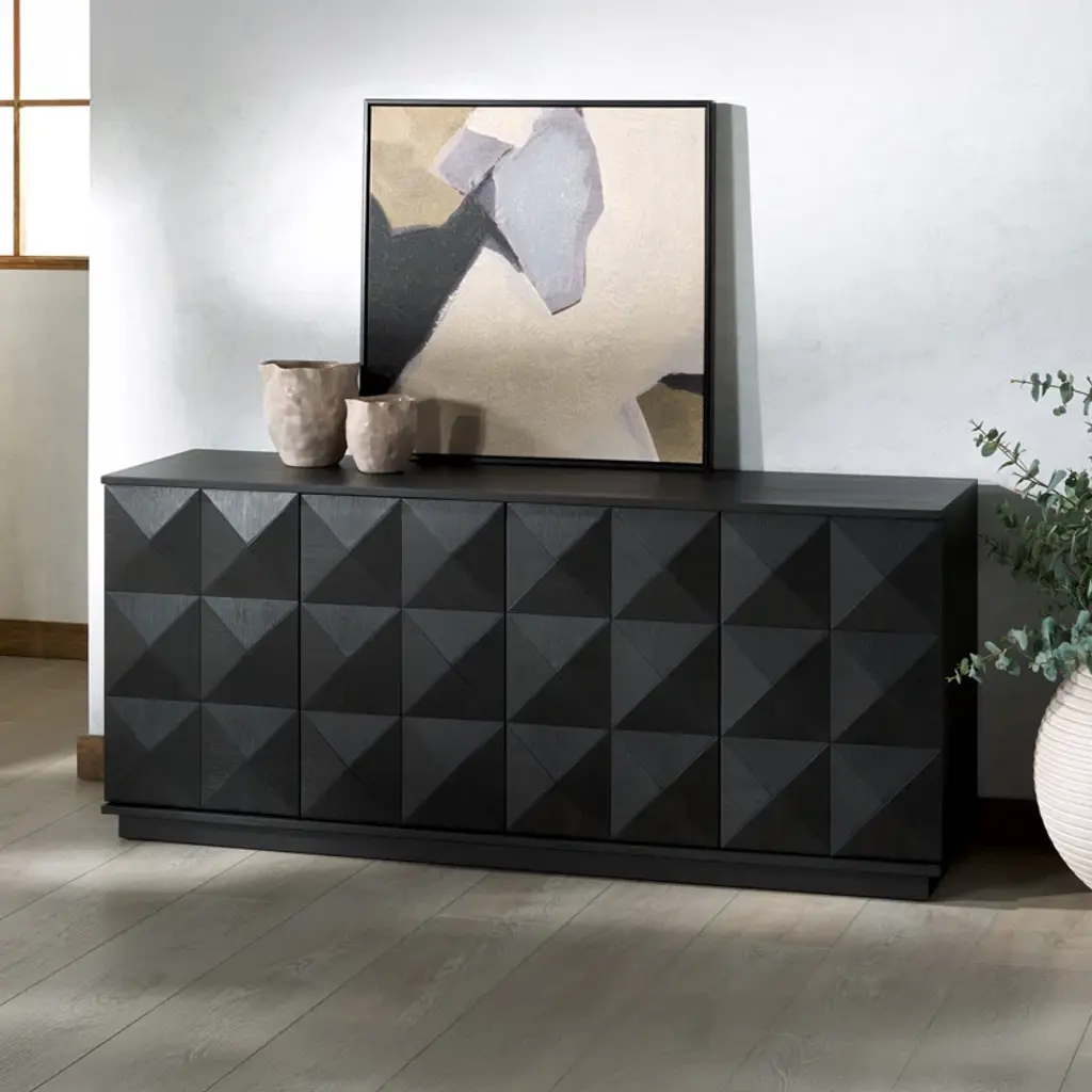 This sideboard is a striking addition to your living room or hallway, with its contemporary black finish and cubism-inspired geometric details. Constructed from kiln-dried oak and engineered wood, it has four cabinet doors and interior shelves for ample storage. The dovetail joinery adds sleek stability, while the finished back allows for versatile placement. Use the interior to store and organize your dishes or linens, and the top surface for displaying a fun lamp, vase, and accent piece.