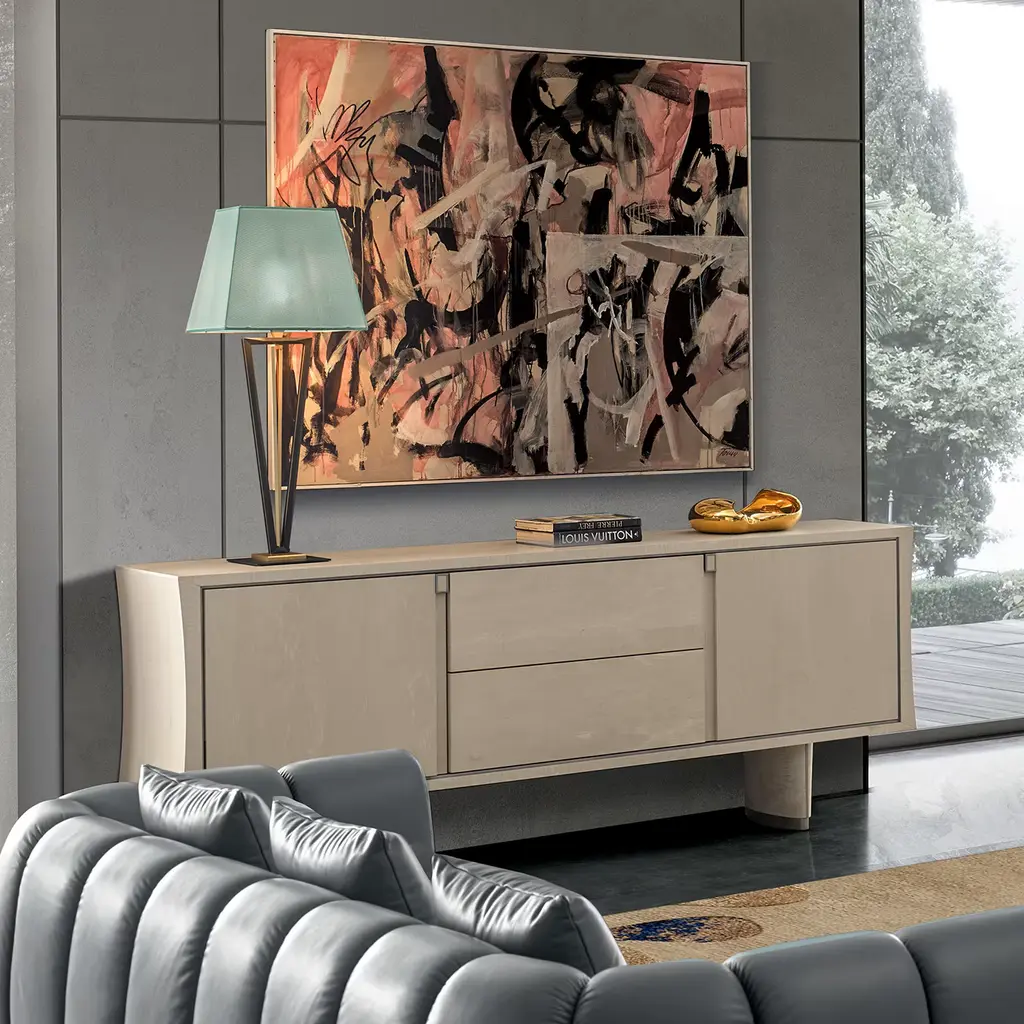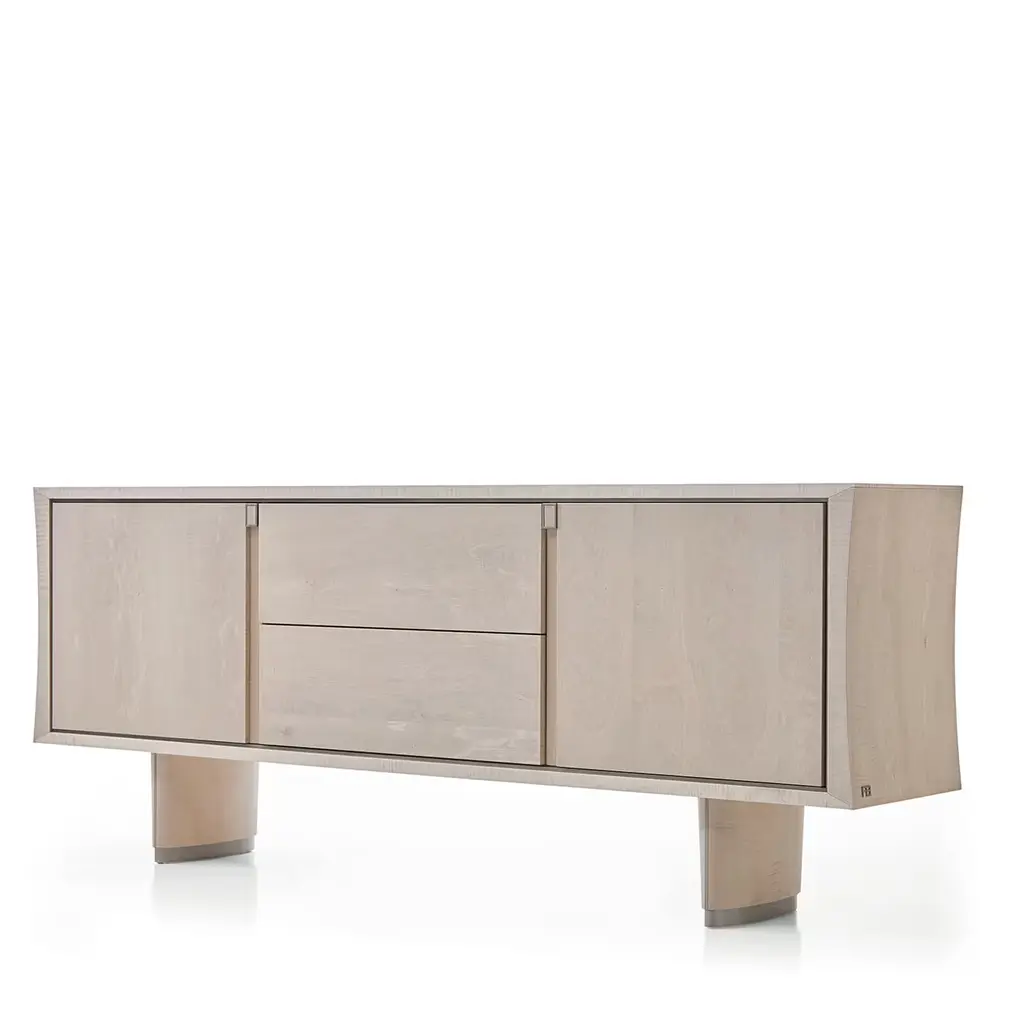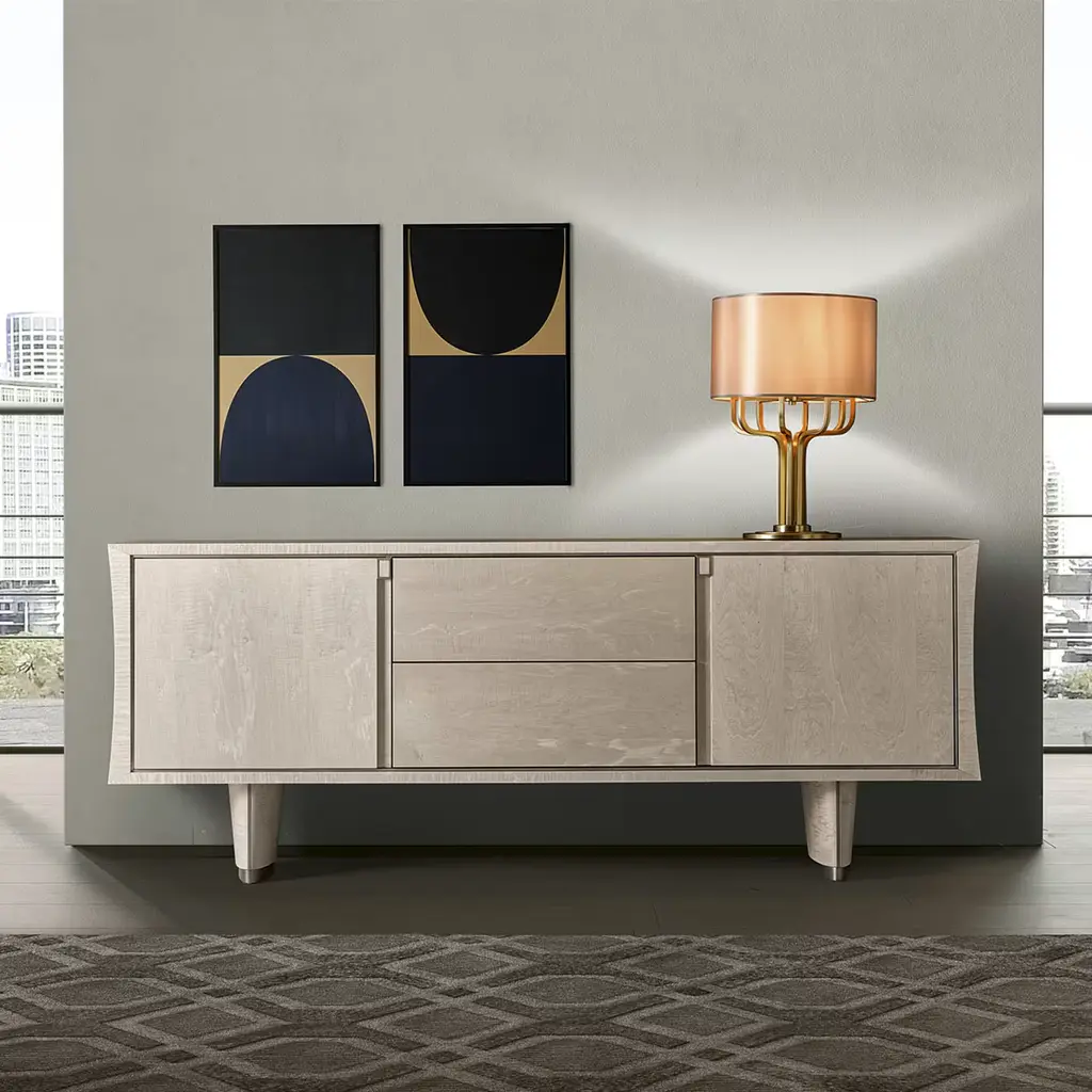 A celebration of refined craftsmanship and timeless design, this sideboard captivates with its elegant curves and luxurious materials. The softly contoured sides, veneered in fine Sicomoro Frisè, are accentuated by a matte transparent lacquer that highlights the natural beauty of the wood. Featuring two doors and two soft-close drawers, it offers spacious storage, with glass shelves adding a touch of lightness. An exquisite piece of Italian artistry, this sideboard arrives fully assembled.