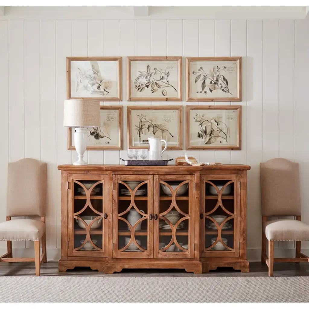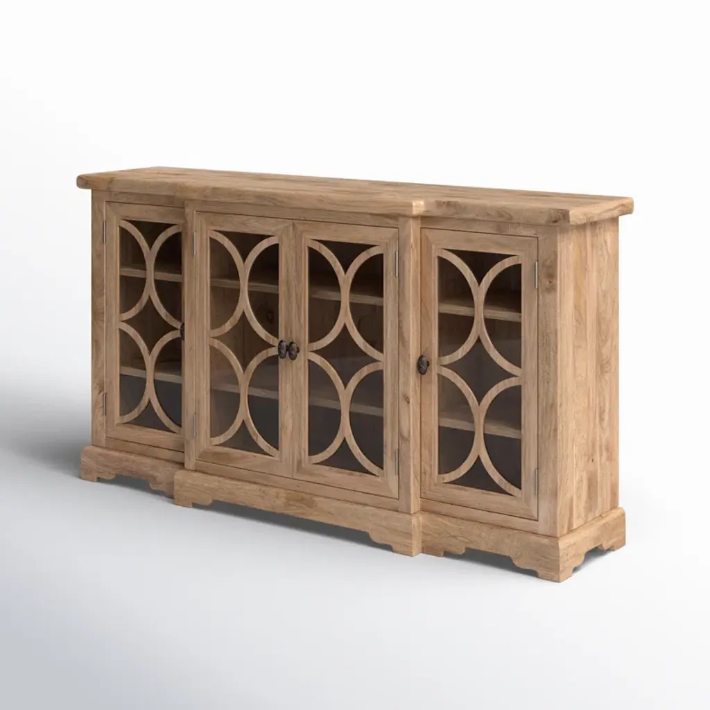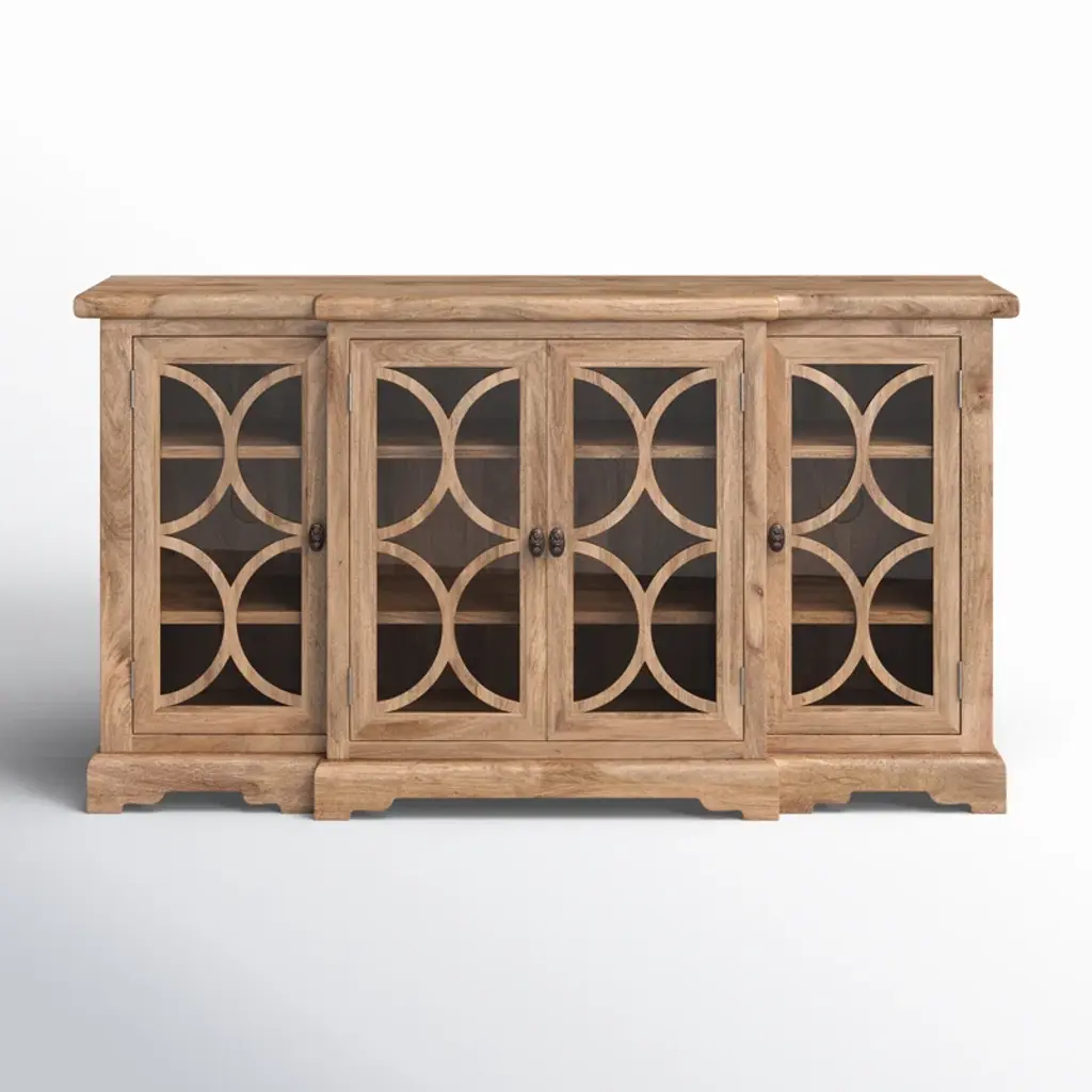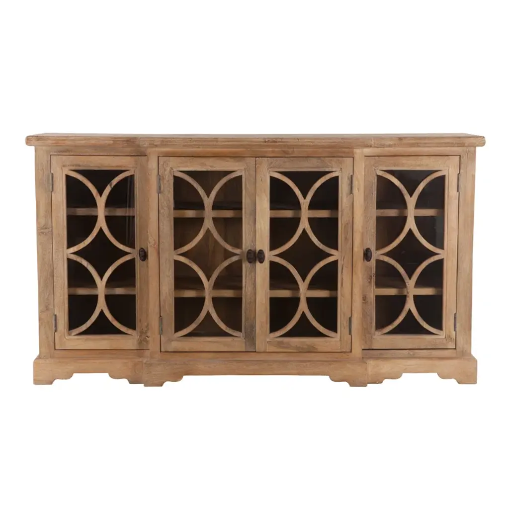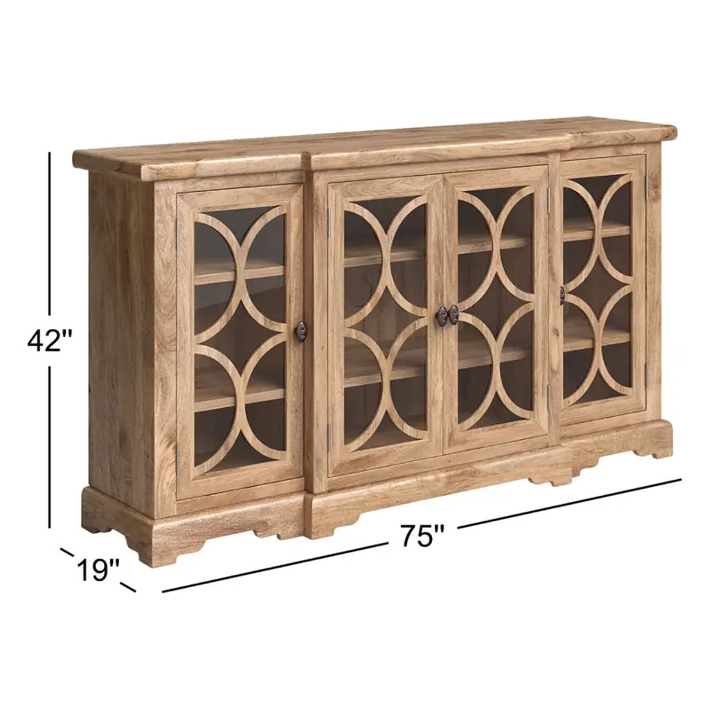 Surrounded by the familiar comforts of coastal charm and heirloom-quality construction, the Pengrove collection is crafted from solid mango wood. The beautiful furniture of this collection features frame-and-panel construction, over-sized styling, carved pedestals and a beautiful, antique oak finish. Whether you're looking to bring harmony to a cluttered office or display your favorite fragile china in the dining room, this unique cabinet offers up a touch of elegant appeal to your decor. At 75-inches long and made of solid mango wood, this cabinet has three shelves that span from end to end. Four doors cover the front of the cabinet, each with carved wood in half moon patterns over the glass. The antique oak finish of the wood adds to the longevity of the piece, providing maximum moisture and scratch resistance for many years to come.