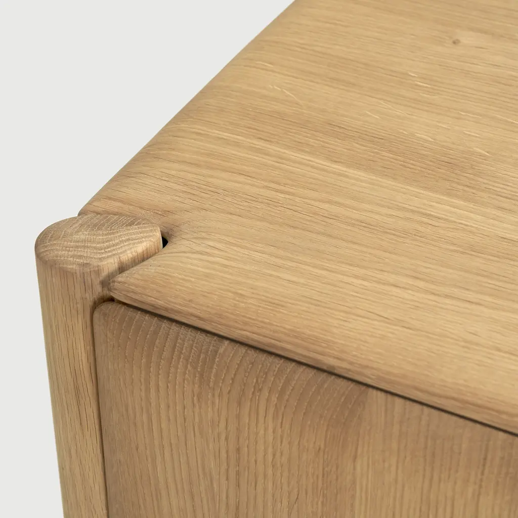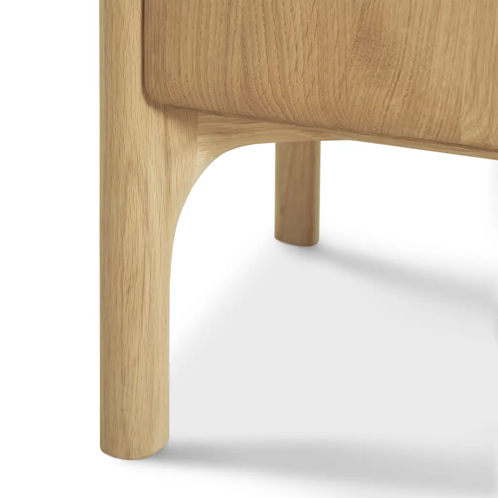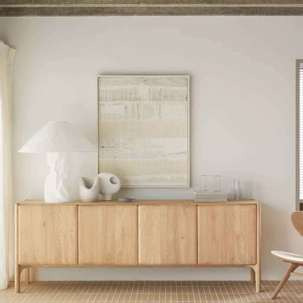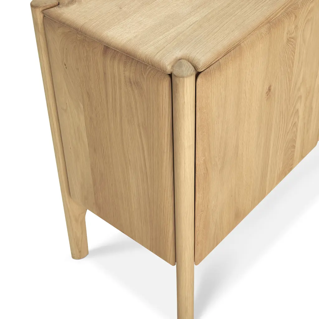 Alain van Havre’s PI Sideboard with 4 Doors for Ethnicraft is a statement piece for spacious interiors, offering a rich blend of aesthetic refinement and utilitarian design. The expansive size is ideal for larger rooms, ensuring ample storage space without sacrificing style. Each of the four doors opens to reveal a capacious area for storing a variety of items, from linens to dinnerware. Hand-finished to bring out the unique patterns and textures of the wood, this sideboard stands as a testament to modern design, where functionality and beauty are presented in equal proportions.
