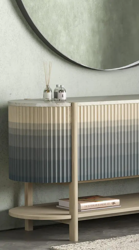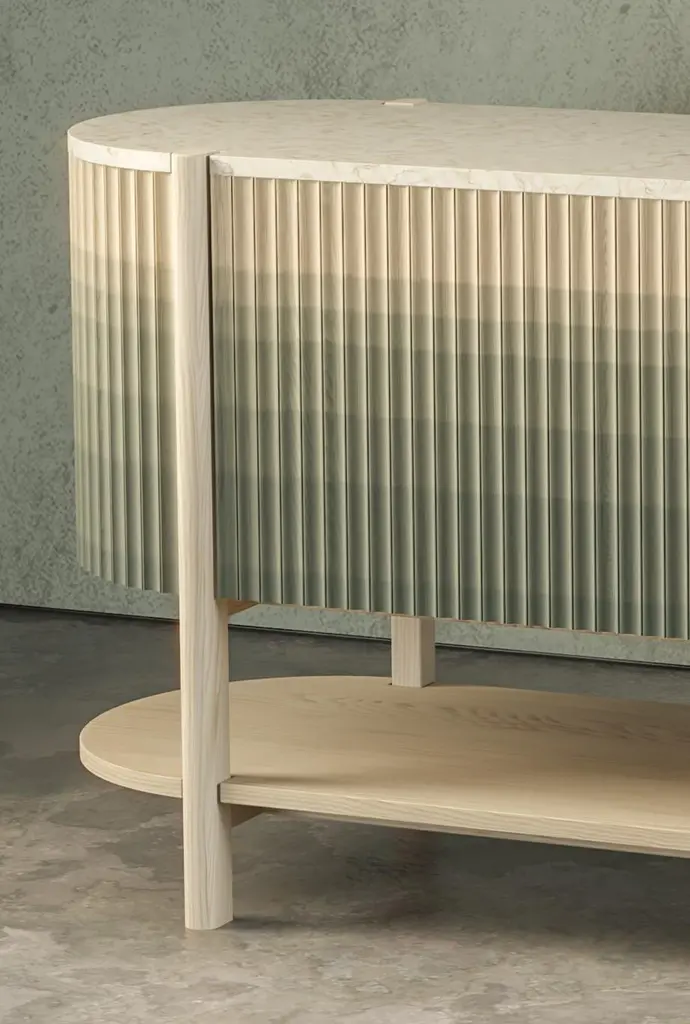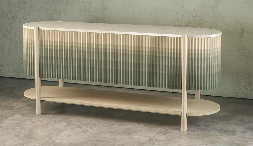 Pilar credenza by INDO-One of a kindDimensions: D 182.9, W 45.7, H76.2cm Materials: Maple, Crema Marfil Marble top.Finish: Celadon green ombre.Different dimensions available. Also available in other materials (Oak/Maple; Hardwood or Stone top) and finishes (solid or ombre).Each piece is carefully handcrafted by our team using natural materials and traditional processes. Slight variations may occur. INDO- is an award winning interdisciplinary design studio based in Providence, RI. Founded in 2018 by Urvi Sharma and Manan Narang - both grew up in New Delhi and met at the Rhode Island School of Design - INDO- is a product of experiencing both places and cultures. Using a blend of craft and narrative in our creative process, we aim to share the rich cultural and historical identity we bring with us as Indian designers in the rapidly changing landscape of American design. With a focus on re-contextualizing traditional techniques from different disciplines of art and craft into our work, INDO- creates contemporary objects that celebrate the handmade and acknowledge the people and places that inspired them.