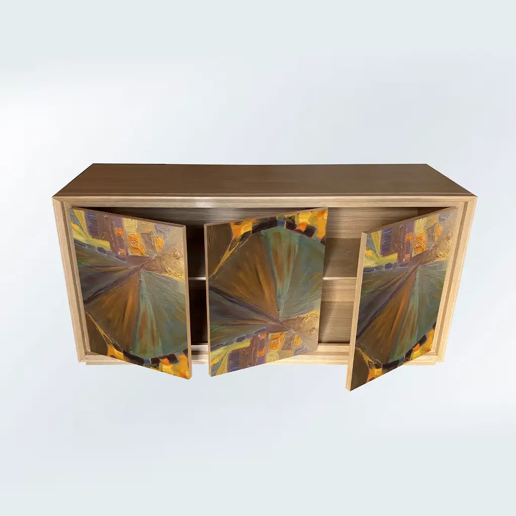 The singular artistic allure of this sideboard lies in its extraordinary decoration painted by hand by artist Mascia Meccani using warm oil colors. Part of a limited series counting only ten signed, numbered pieces, it guarantees excellent solidity thanks to a sturdy durmast structure that hosts two practical shelves for storing tableware.