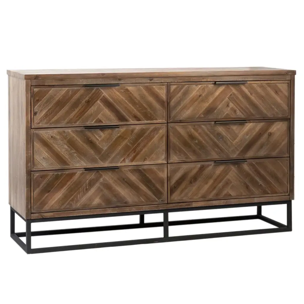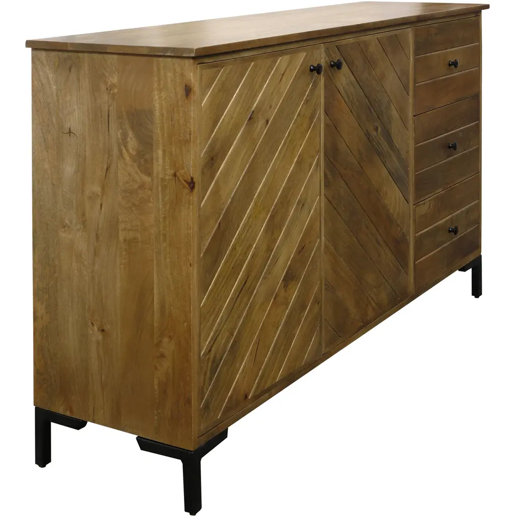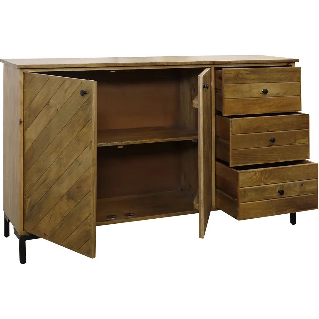 Crafted from sustainably sourced mango wood, our Plankwood Sideboard brings a distinct rustic lodge vibe to your living space. The durable iron legs provide a strong foundation, ensuring it's a mainstay in your home for years. Perfect for your dining room or bedroom, this sideboard offers generous storage with a concealed cabinet and three drawers. The unique grain detail of each piece guarantees a one-of-a-kind aesthetic that will elevate your home's style.