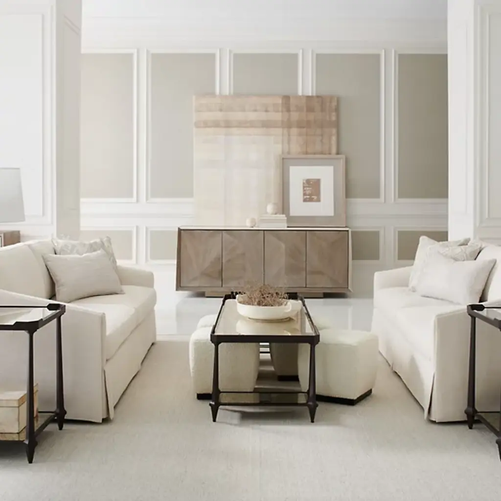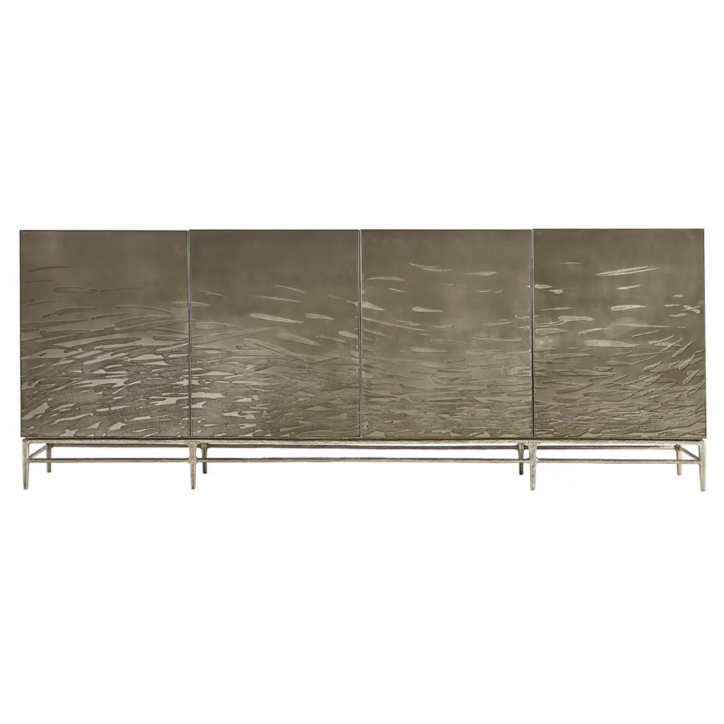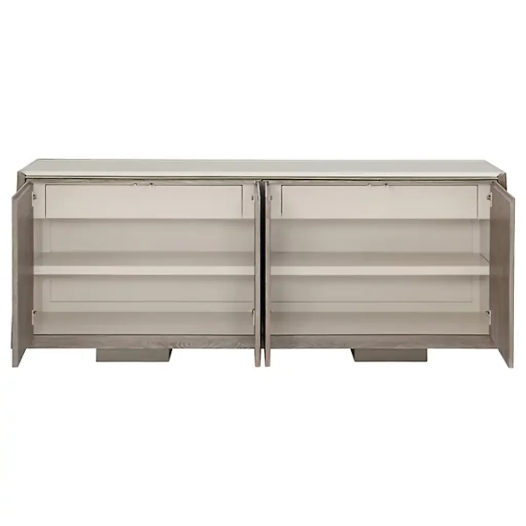 The Point of View Sideboard from Caracole is an inspired contemporary design, creating a refined console with a straightforward, engaging silhouette and extraordinary linear veneer patterns. Topped with a Caracole Cream stone top, it ensures both usability and durability. The soft tonal finish of its block feet contrasts with the luxurious metallic accents of the top edge, adding stylish sophistication. Each touch-latch door opens smoothly to reveal a fully finished putty-painted interior with adjustable shelves and drawers that create standout storage options.