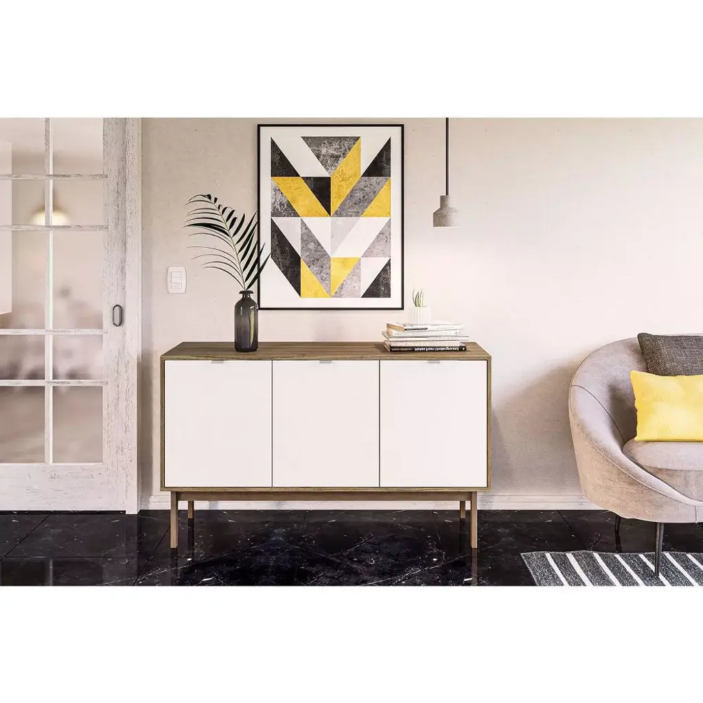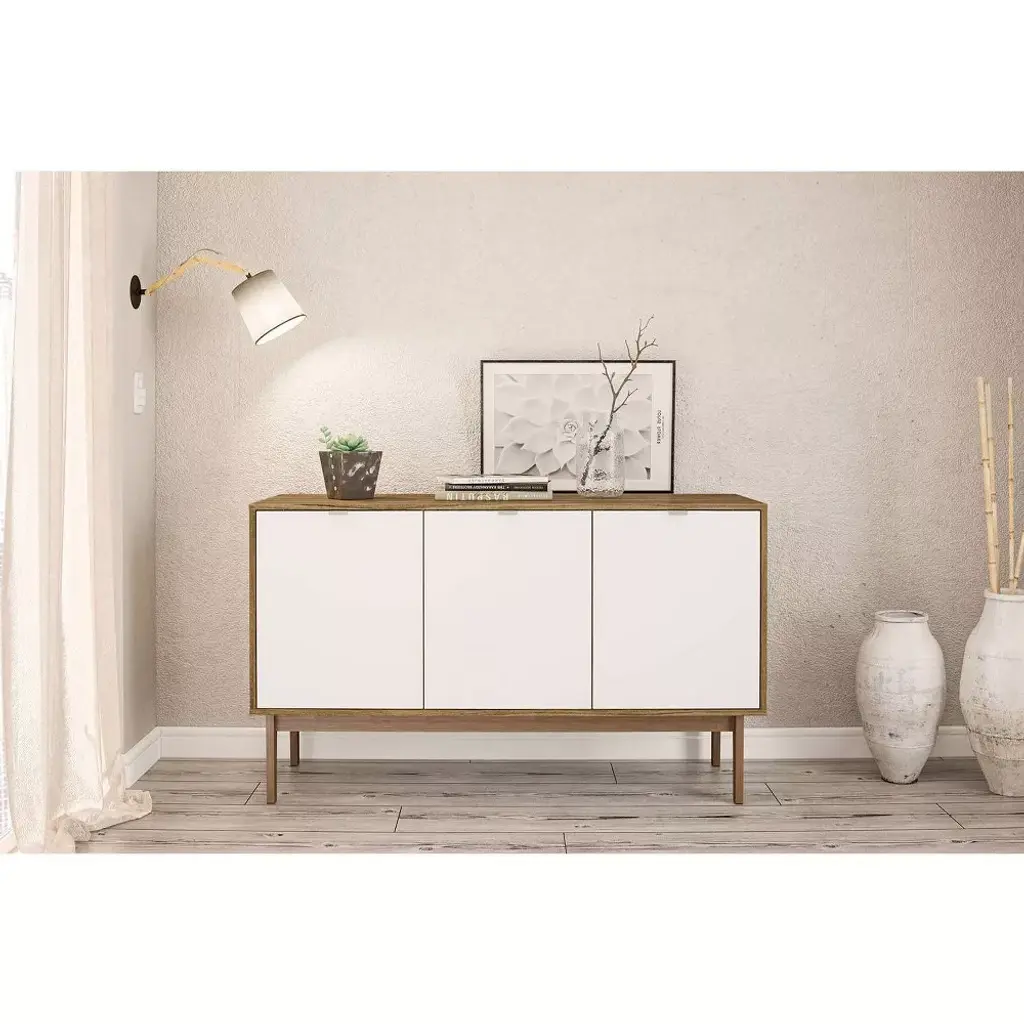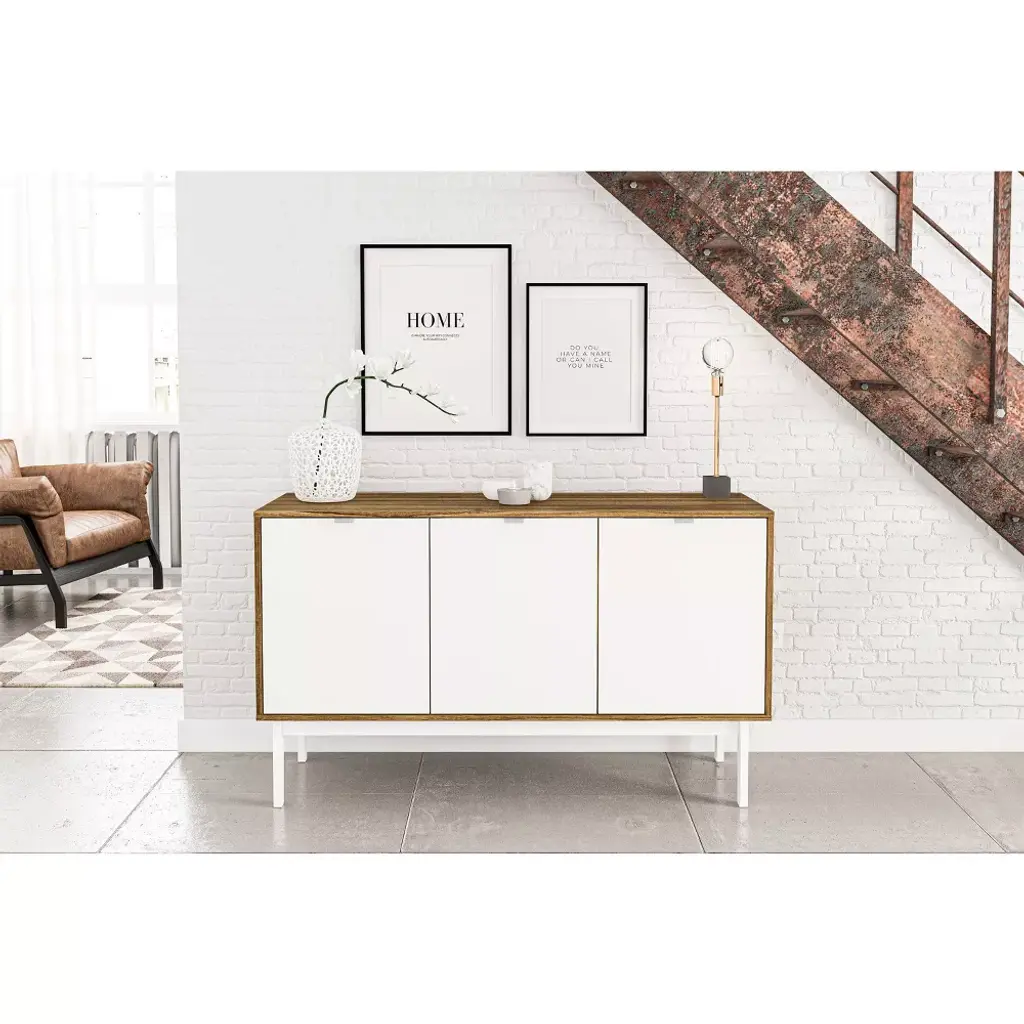 Add extra storage to your kitchen or living room with the Sienna Sideboard from Polifurniture. This sideboard is the perfect addition to any modern home and is offered in a beautiful walnut finish with white doors. It is constructed from engineered wood with a durable melamine finish to protect against everyday use. It has 3 spacious cabinets that provide concealed storage to keep your home looking neat and organized. The 2 removeable shelves allow you to customize the space to meet your storage needs.