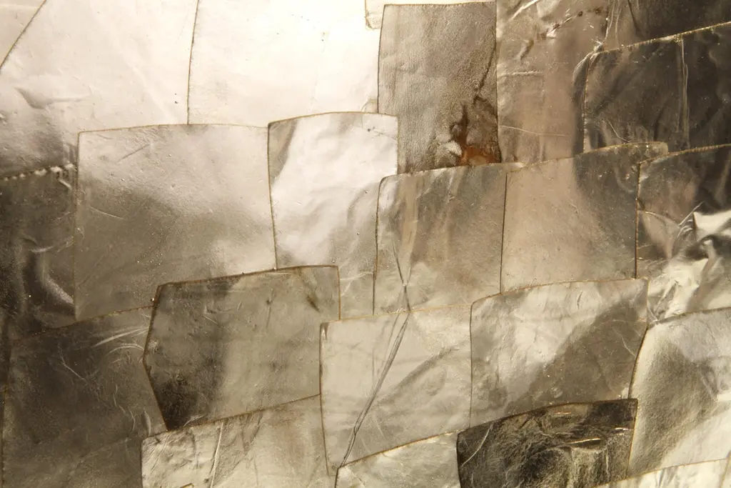 The Porchester cabinet, designed by Charles Burnand Studio has a smoked eucalyptus carcass with two doors inlaid with gold coloured mica petals and one simple smoked eucalyptus internal shelf. Finished with two patinated brass pulls.Mica comes in an array of natural colors and can be sealed with a lacquer or left natural which shows off the true texture. This piece shows a "fish-scale" pattern and others are available, depending on the size of the mica sheets used. Every piece is made to order. You can specify the size, veneer, number of shelves and pattern of the mica.