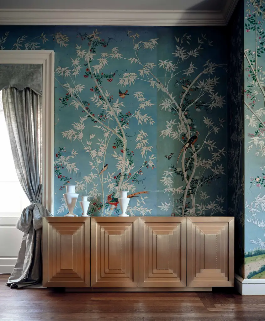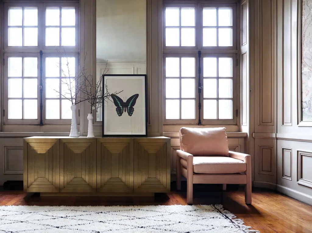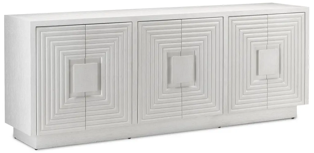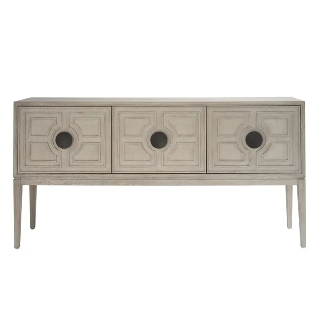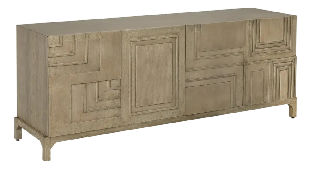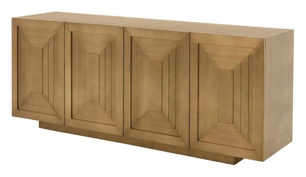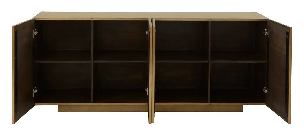 Bring a pop of shine to the dining room with our chic Povera Sideboard. Crafted from mango wood, this blocky buffet is clad in sheets of antiqued brass, with unique details like mitered edges, tiny tack trim and naturally occurring speckles and patina marks that give it plenty of artisan-made character. But it’s more than just these stunning good looks — Povera also offers ample storage space, featuring two mango wood interior sections concealed by four cabinet doors. Perfect for stashing dinner and glassware in the dining room, we also love our glam Povera as a media console in a Hollywood Regency-inspired living room. •mango wood •brass clad exterior •grey finished mango wood shelves •tack detail •mitered edges•each is unique; speckles, patina and other markings are inherent to brass finish and should be expected Dimensions•72"W x 18"D x 29"H